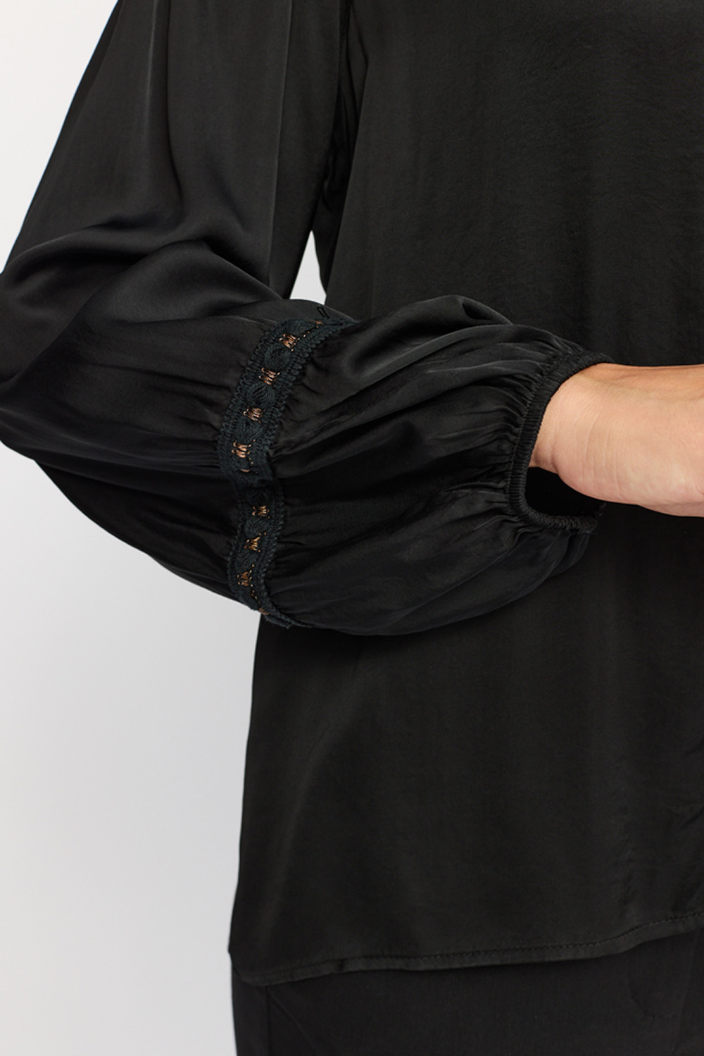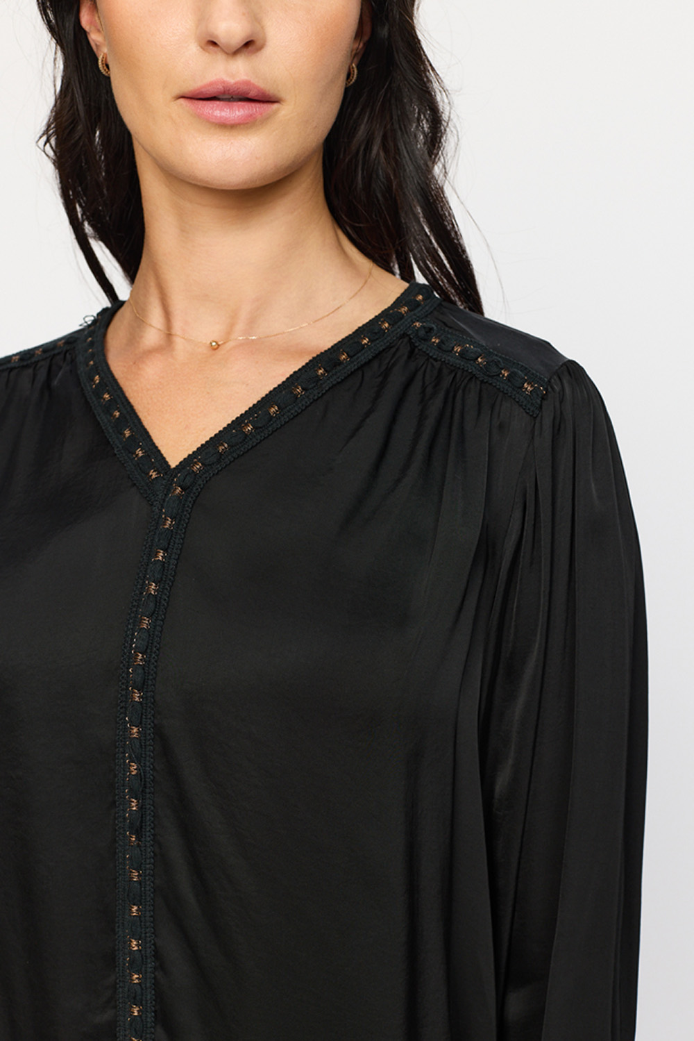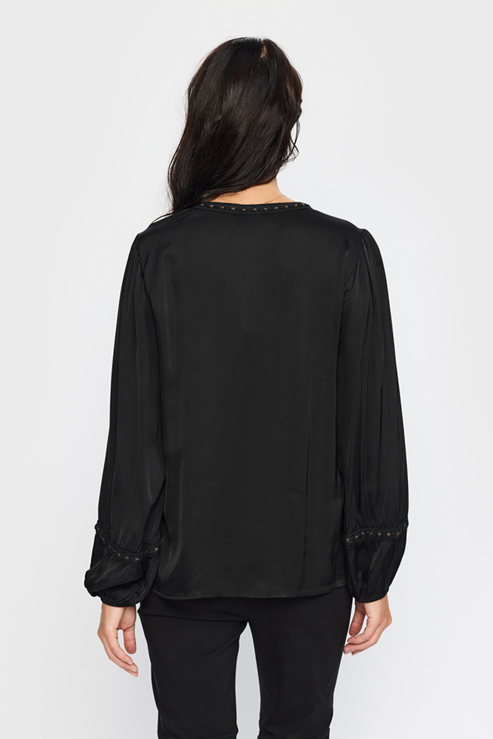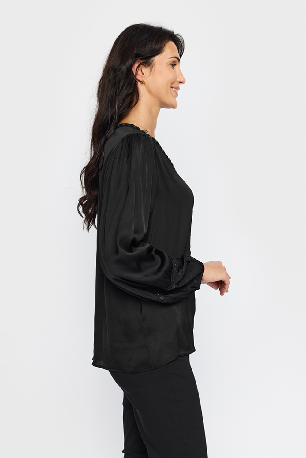 Camilla Blouse er en feminin bluse i 100% viskose med V-hals og delikate bånddetaljer. De lange ermene har elastisk kant som gir en myk og flatterende fasong. Et lett og behagelig plagg som gir antrekket et elegant, men avslappet uttrykk.