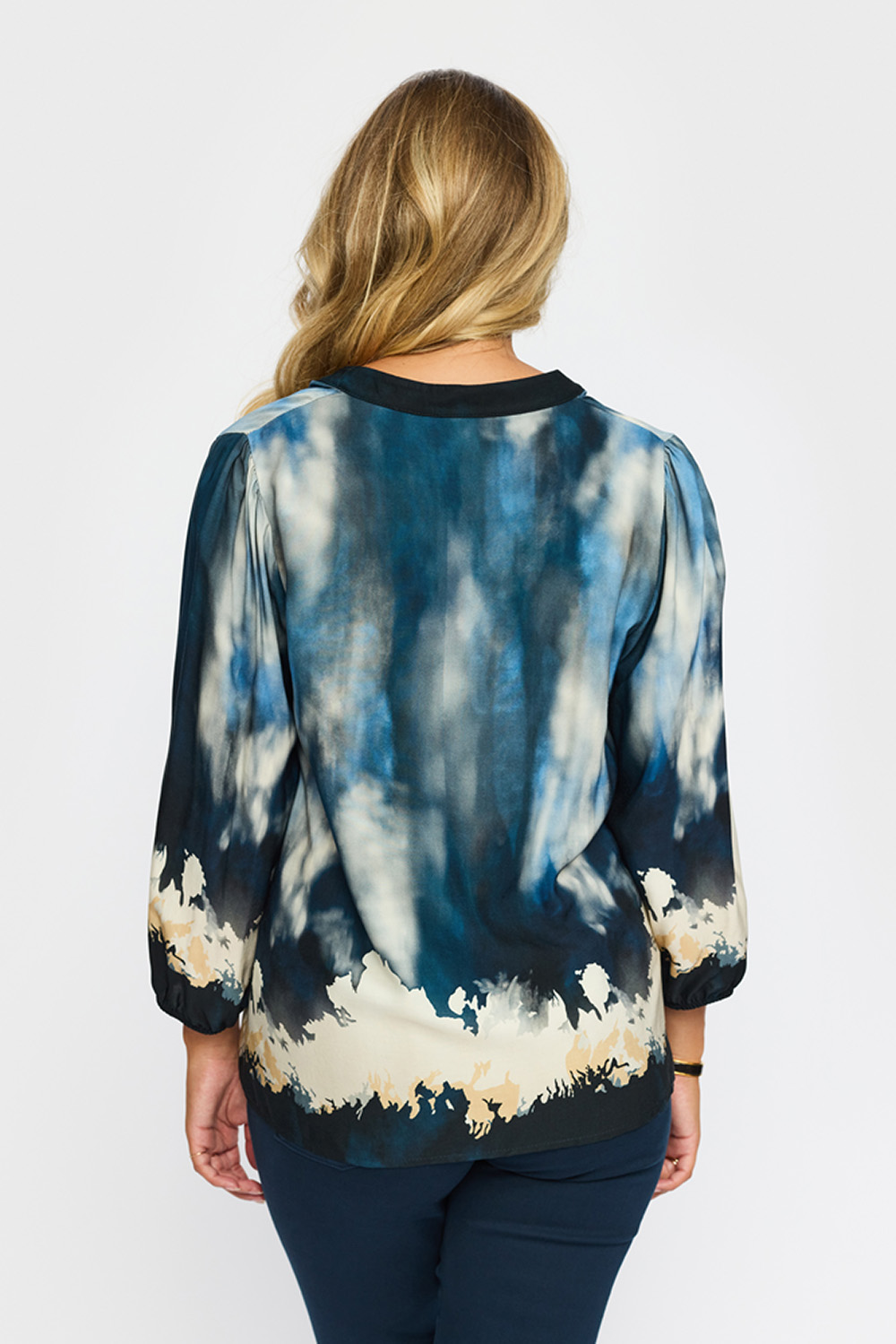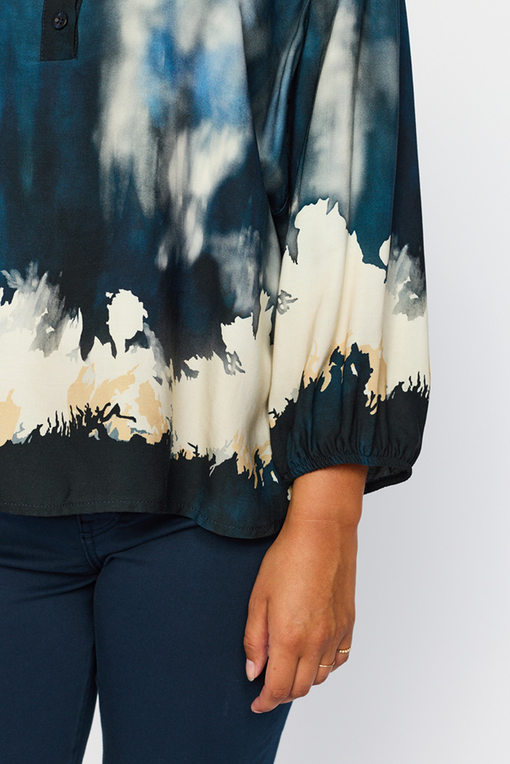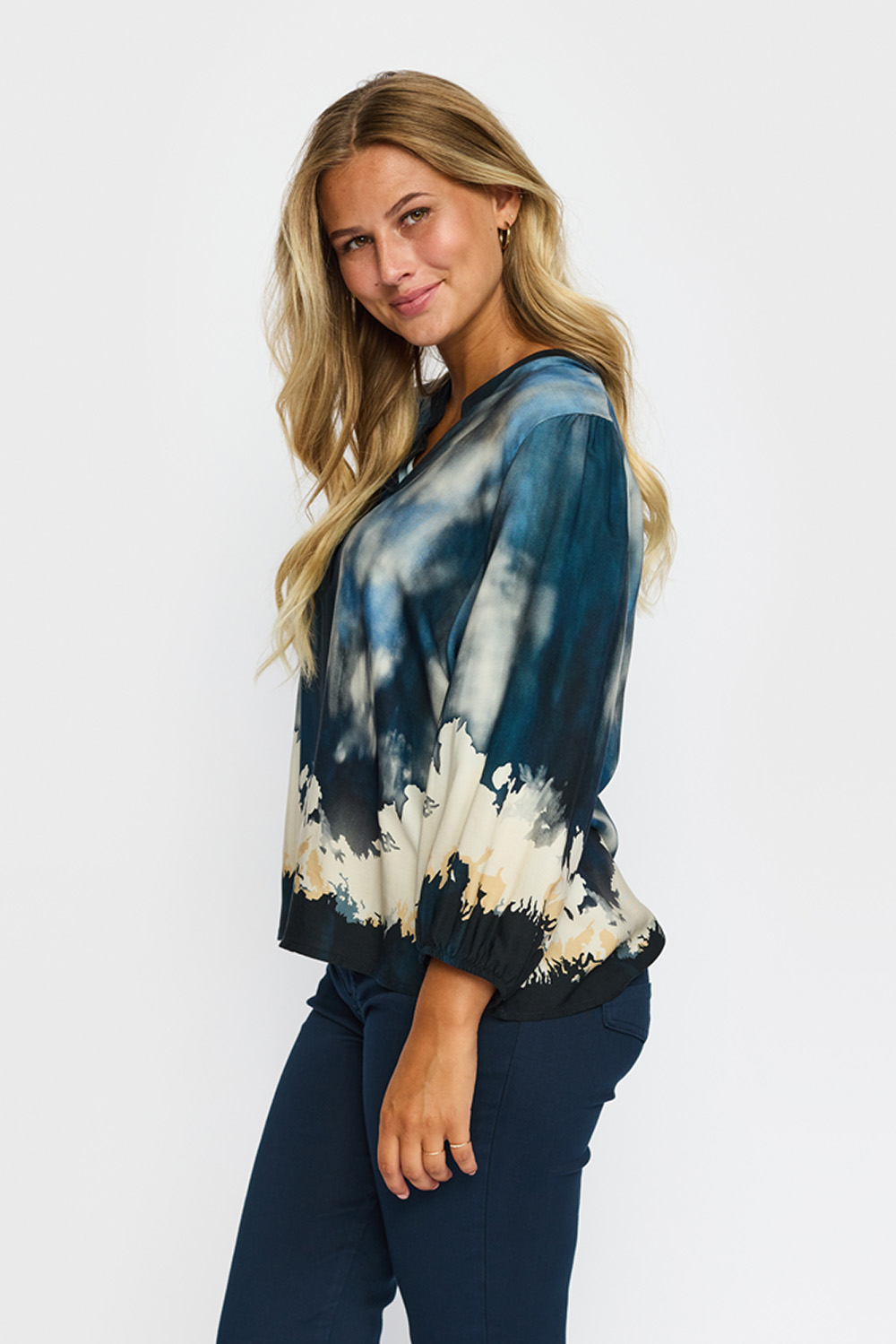 Eline Blouse fra 2BIZ er en lekker bluse med rund krage og liten v-hals, 3/4 lange ermer med lett puff på skuldrene og elastiske mansjetter. Perfekt til jeans eller dressbukse.