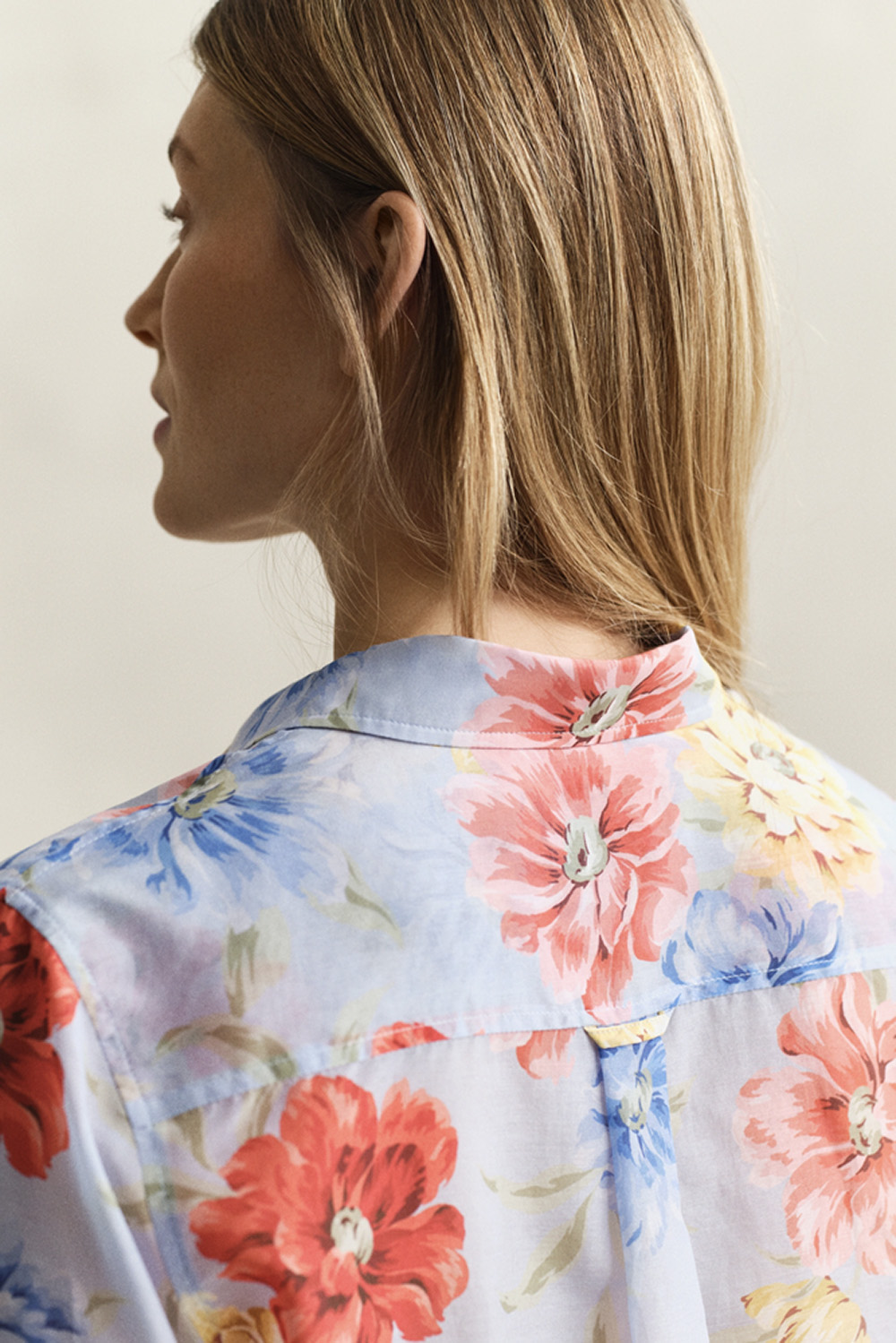 En tidløs bluse i myk bomulls- og silkeblanding med delikat blomsterprint. Normal passform, spiss krage og buet fald gir et klassisk uttrykk, med detaljer som justerbare mansjetter og signaturhempe bak for en moderne finish.