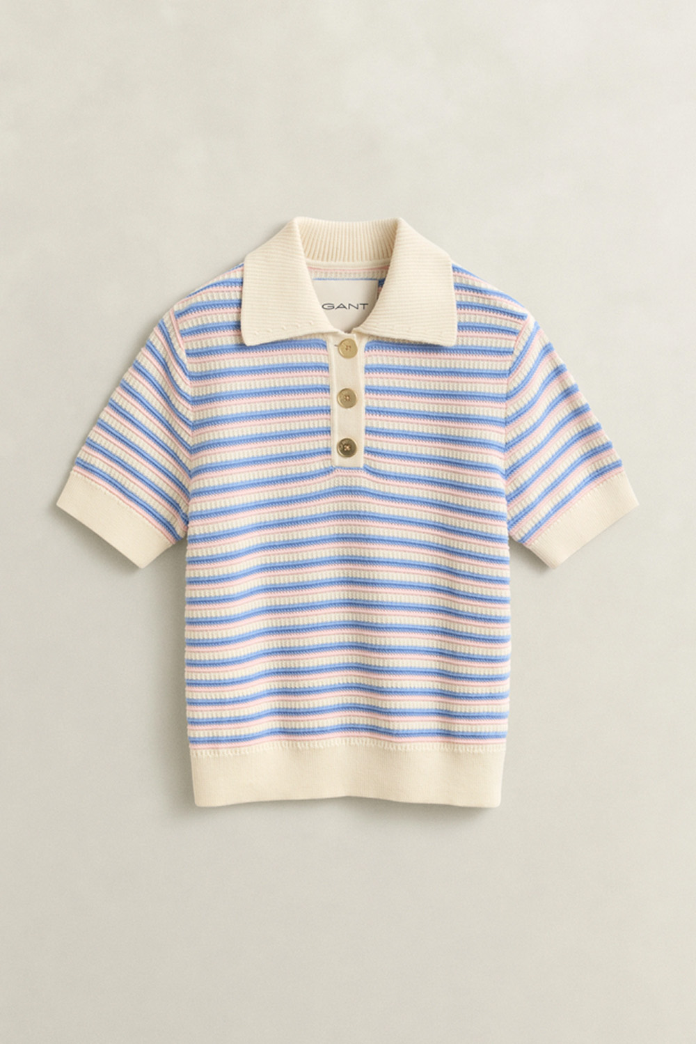 En klassisk rugger inspirert av GANTs ikoniske stil, strikket i økologisk bomull. Normal passform, korte ermer og ribbedetaljer ved krage, mansjetter og fald, kombinert med lekre striper og teksturert strikk, gir et tidløst og sporty uttrykk – perfekt til både jeans og chinos.