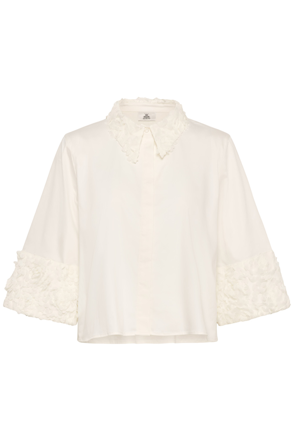 Kortermet skjorte med boxy passform og strukturert uttrykk. Tonale 3D-blomster på krage og ermekanter gir en feminin og moderne detalj, mens skjult lukking foran holder looken ren.