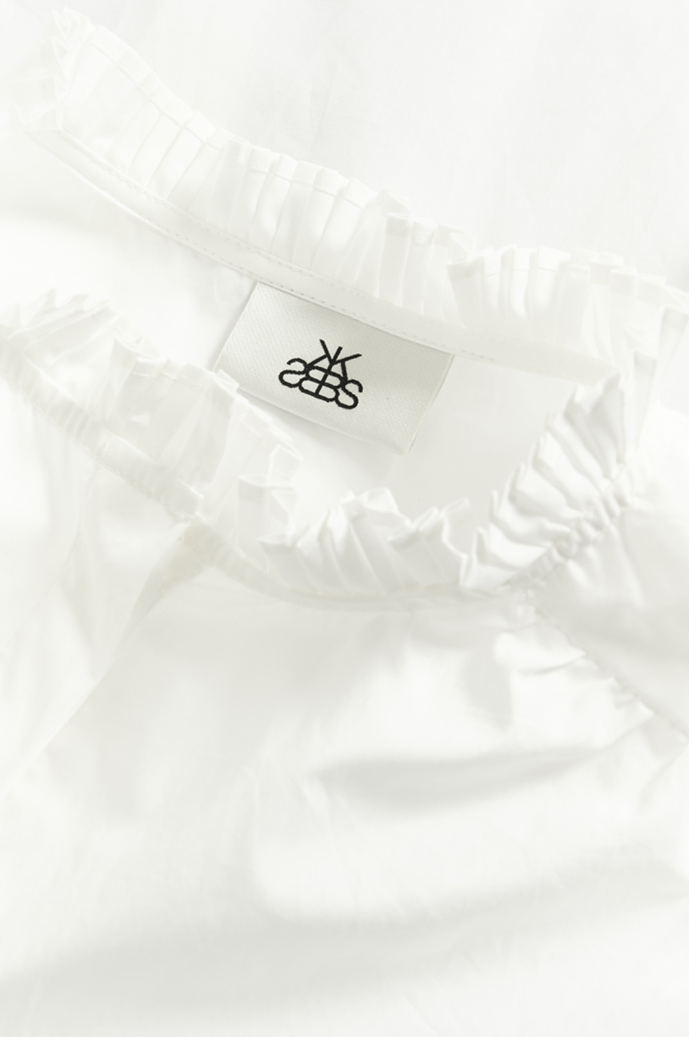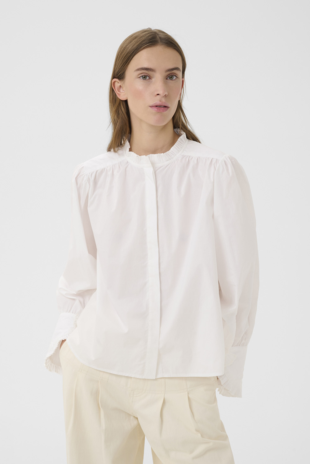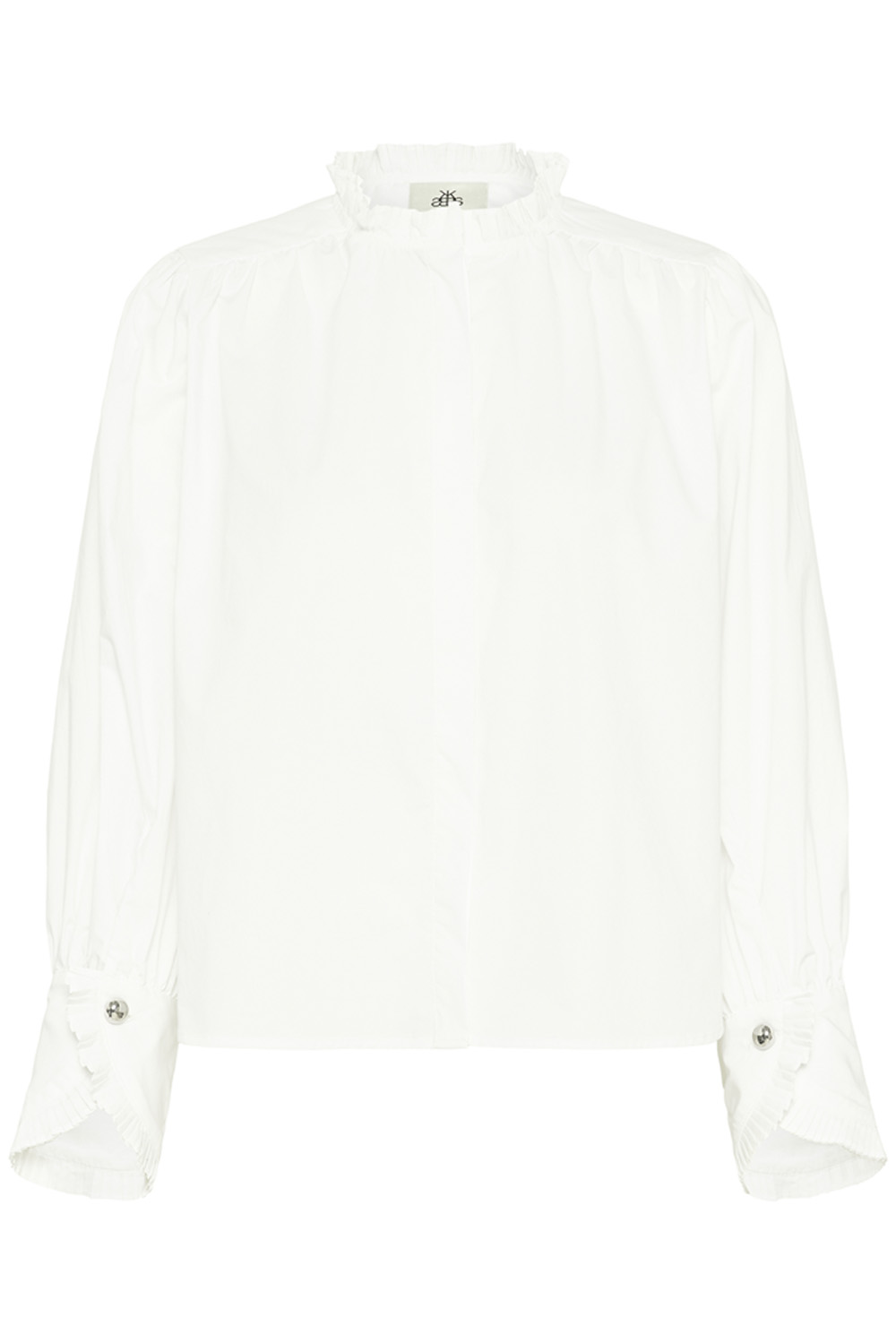 Elegant bluse med høy hals og diskré volangkant. Knappelukking i front og lange ermer med dekorative mansjetter med lett volang og knapp gir et feminint og raffinert uttrykk. Perfekt til både jobb og penere anledninger.