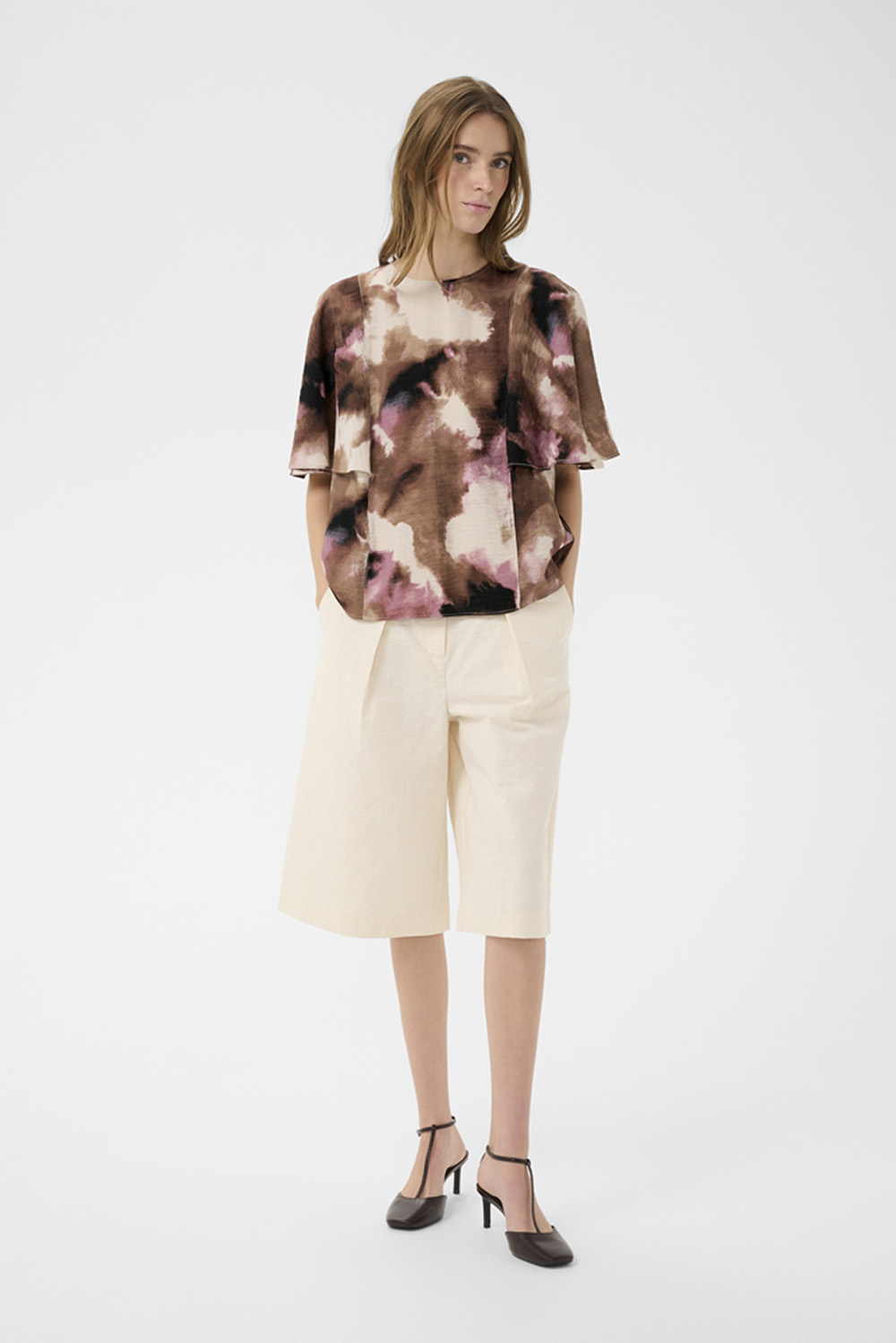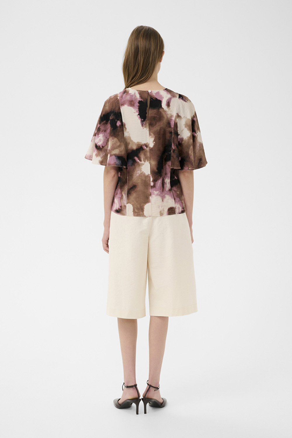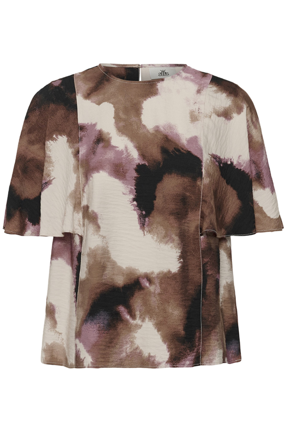 En feminin og lett bluse i et vakkert, abstrakt mønster i bruntoner, beige og fiolett. Modellen har rund hals, korte flagrende ermer og knappelukking bak som gir et delikat uttrykk. Perfekt for å tilføre antrekket et mykt og elegant fargespill – like fin til hverdags som til mer pyntede anledninger.