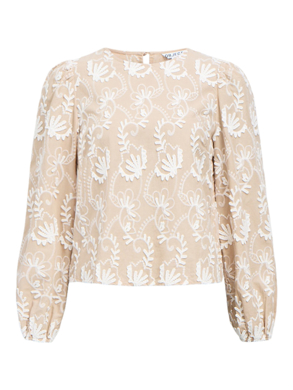 Romantisk bluse med rund hals og nøkkelhullslukking bak. Lange ballongermer og 3D-blomster skaper et lekent og feminint uttrykk, mens normal passform gjør den behagelig å bruke til både hverdags og fest.