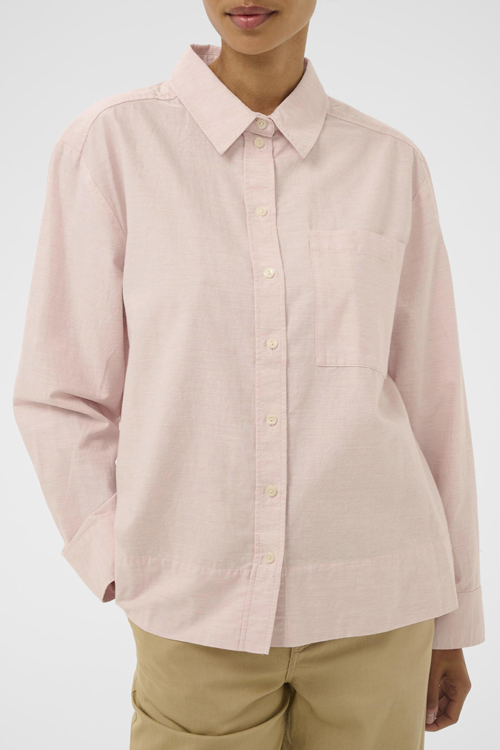 Lett og tidløs skjorte med klassisk krage og avslappet uttrykk. Den har en rett kant nederst med små splitter i sidene som gir en flatterende passform og ekstra bevegelse. Enkel å style til både bukser og skjørt – en elegant hverdagsfavoritt med et rent, skandinavisk preg.