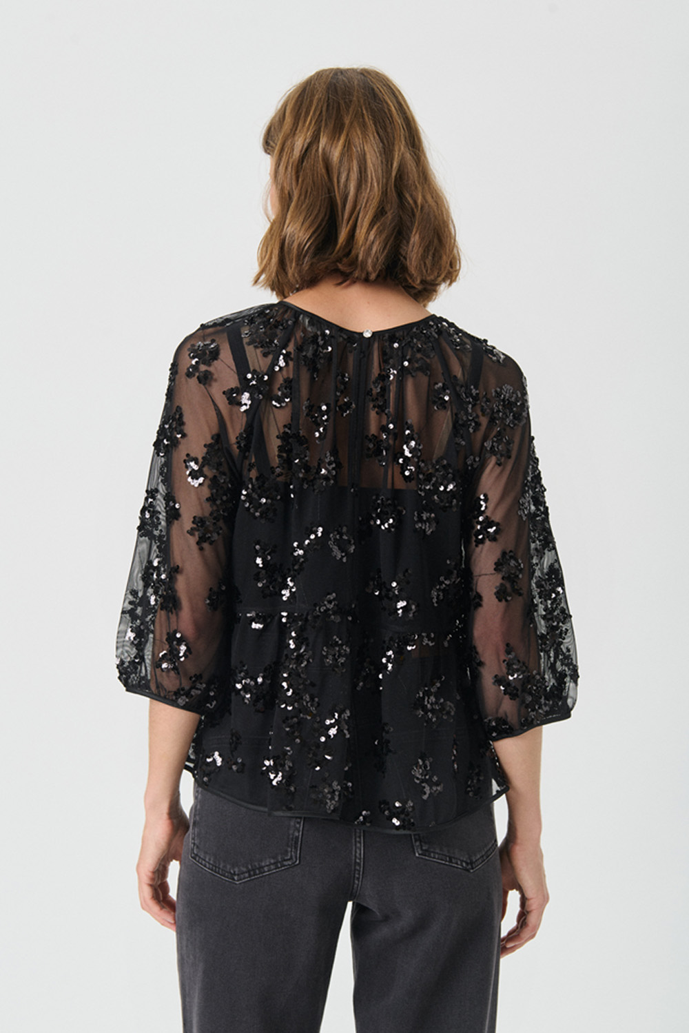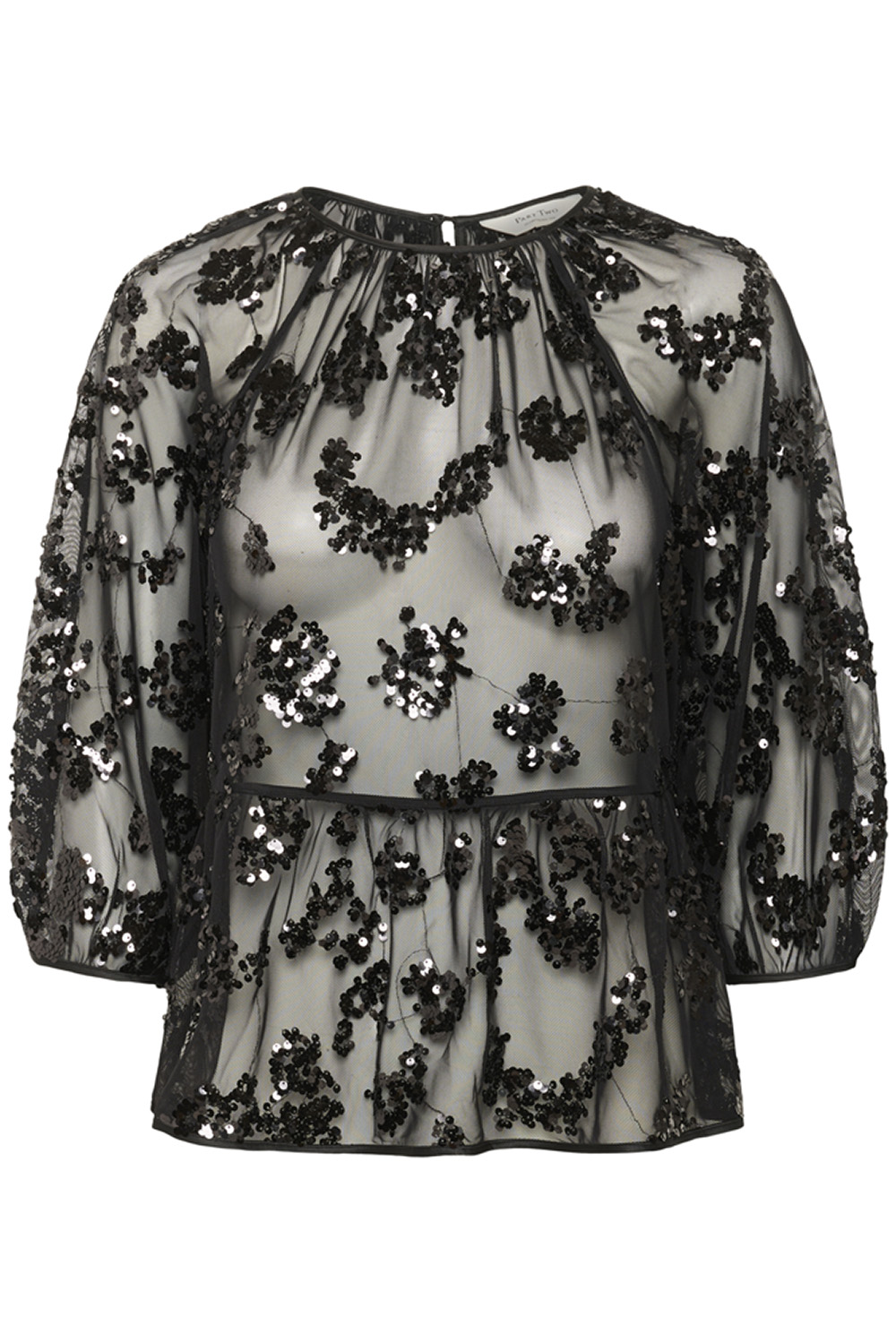 Vivan Pw Blouse fra Part Two. Gjennomsiktig, luftig og full av detaljer- denne blusen har 3/4 lange ermer, rund rynket hals og paljetter i blomsterform som gir et lekkert statement. Perfekt å style over en enkel undertrøye eller sammen med skjørt og jeans for en moderne, festklar look.