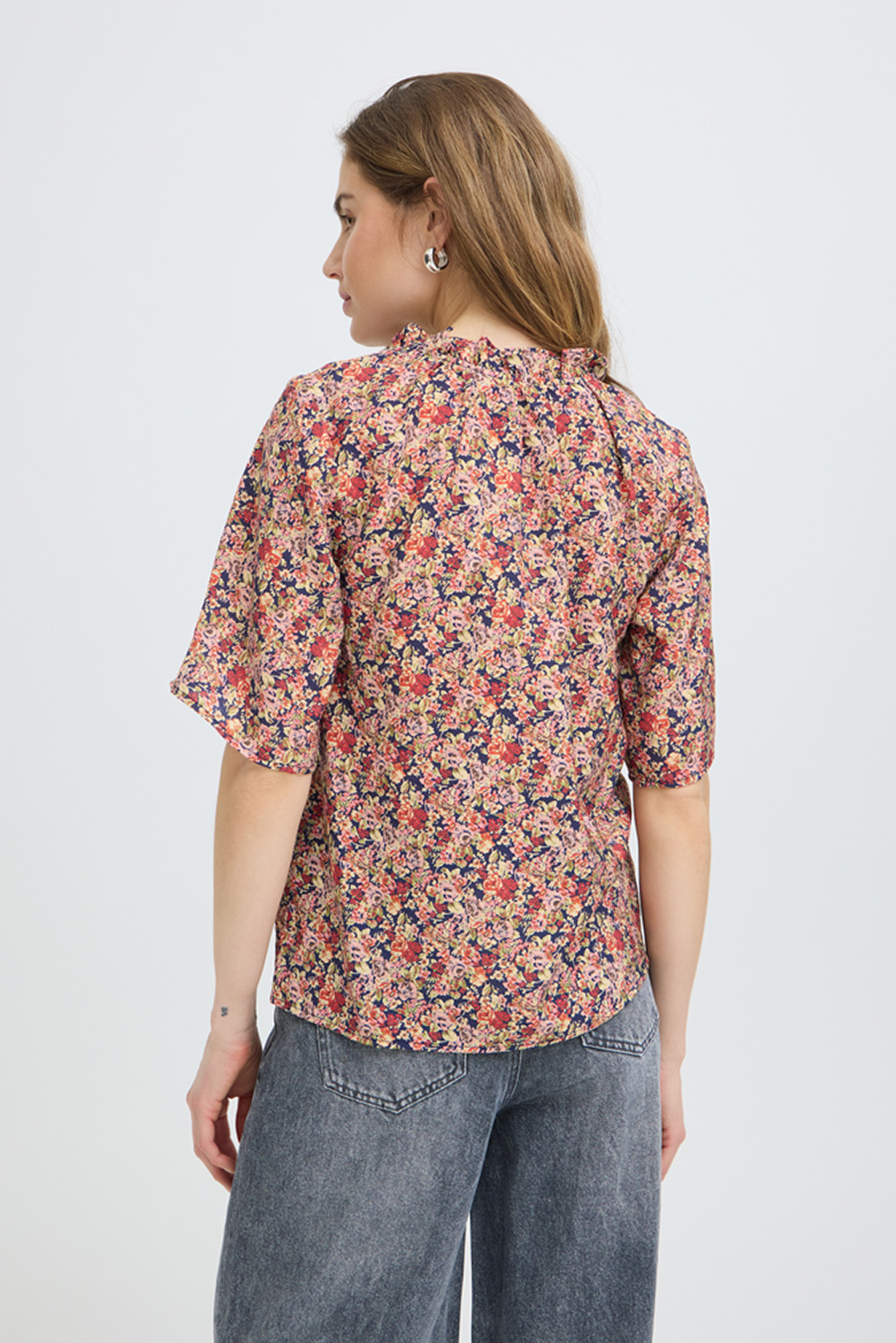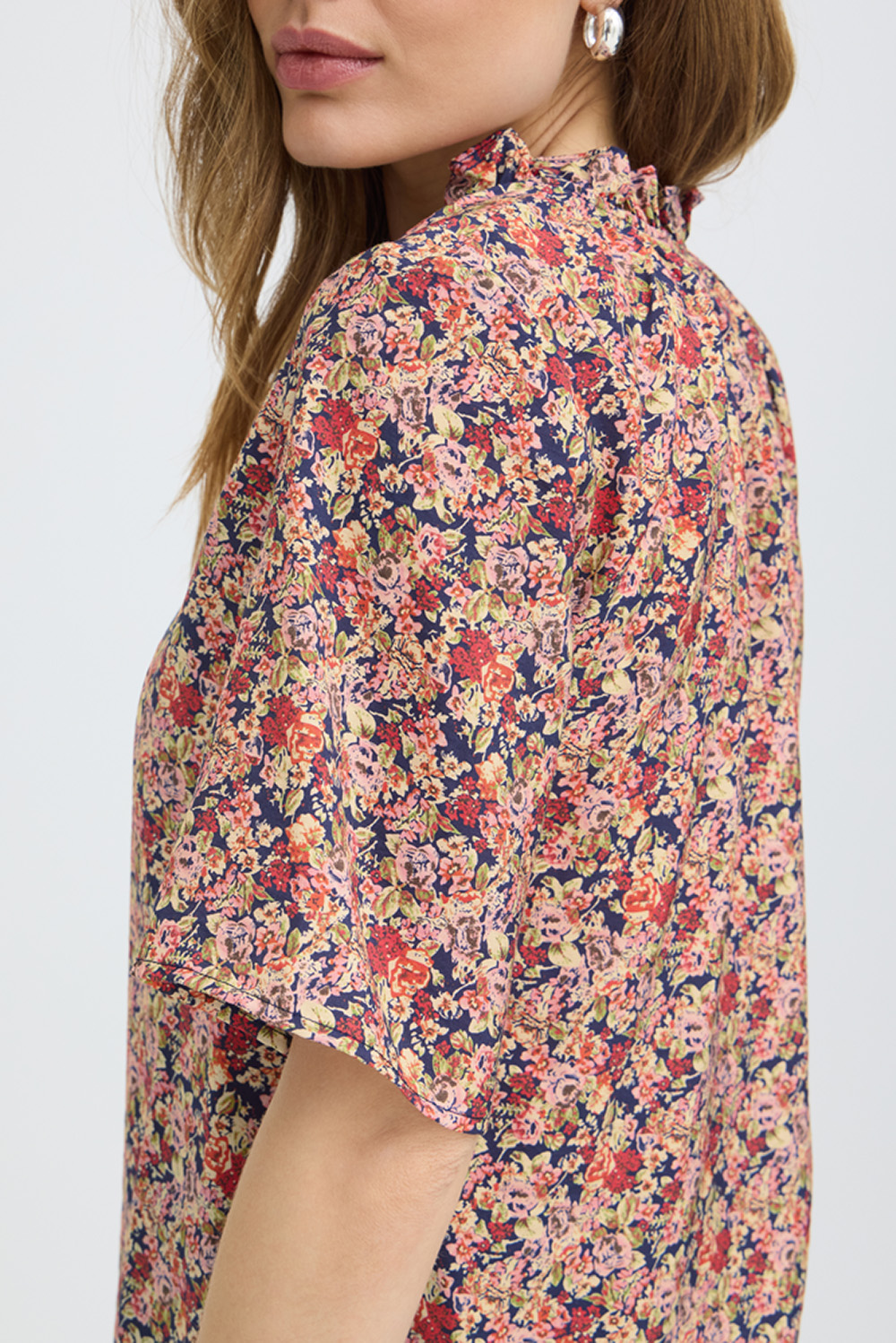Lett og feminin bluse med et delikat blomsterprint. PZ CELLY BLOUSE fra Pulz Jeans har en avslappet passform med korte, vide ermer som gir et luftig og behagelig uttrykk. V-utringningen er pyntet med en fin rysjekant som tilfører et mykt og romantisk preg – perfekt til både hverdagsbruk og sommerlige anledninger.