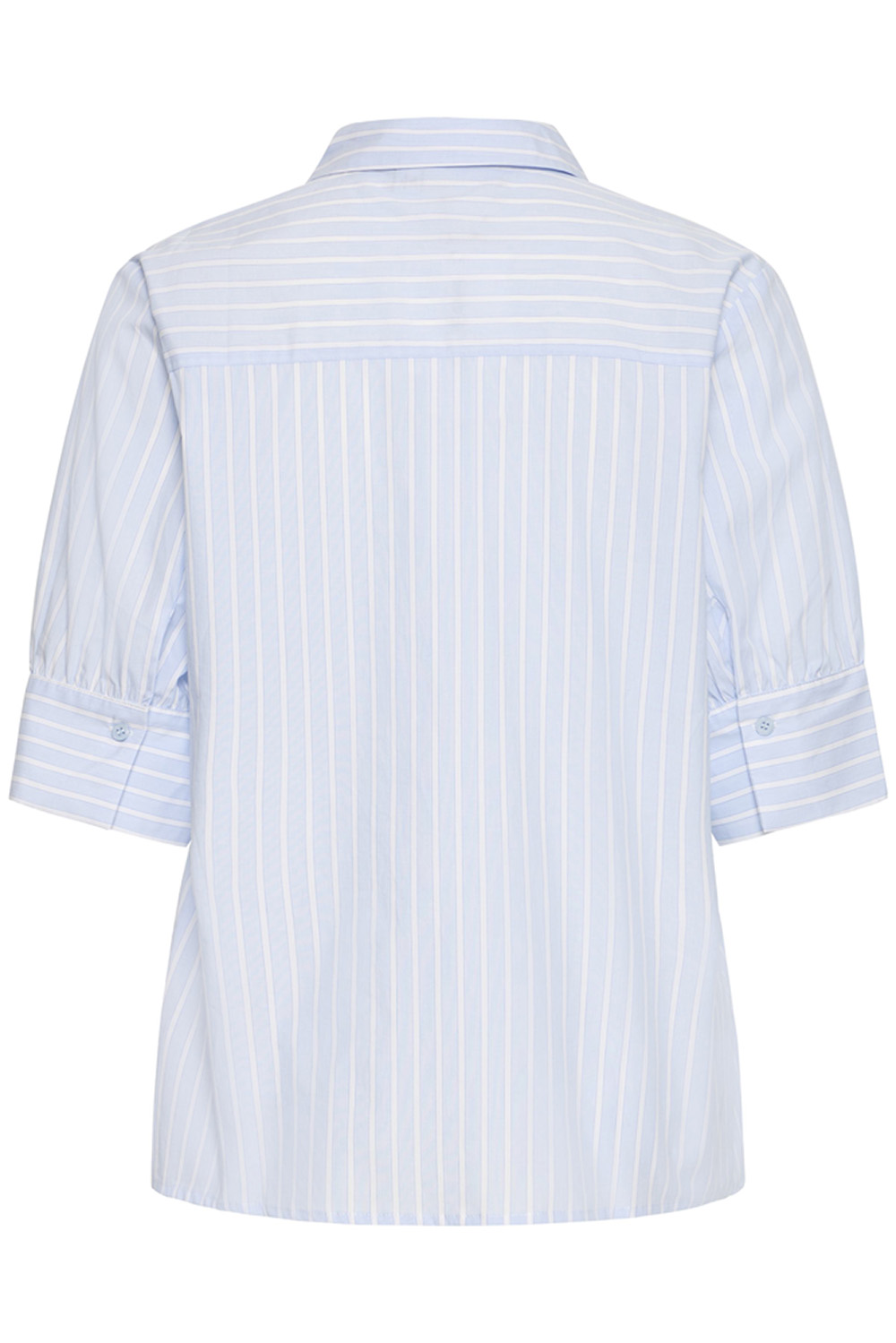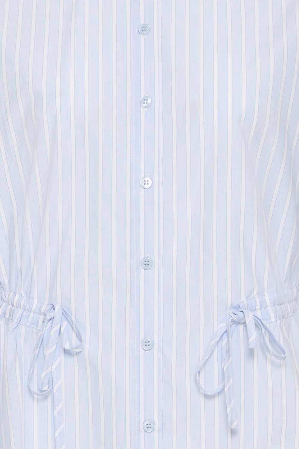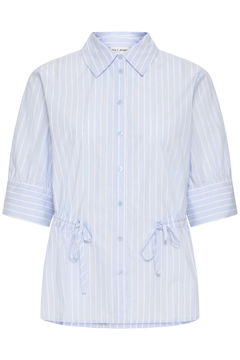 En stilren og feminin skjorte med et avslappet, men velkledd uttrykk. PZ CORALINE SHIRT fra Pulz Jeans har klassiske striper, krage og knappelukking i front som gir et tidløst preg. Korte ermer med brede mansjetter tilfører en moderne detalj, mens dobbel snøring i livet – med knyting på begge sider – lar deg justere passformen og fremheve silhuetten.