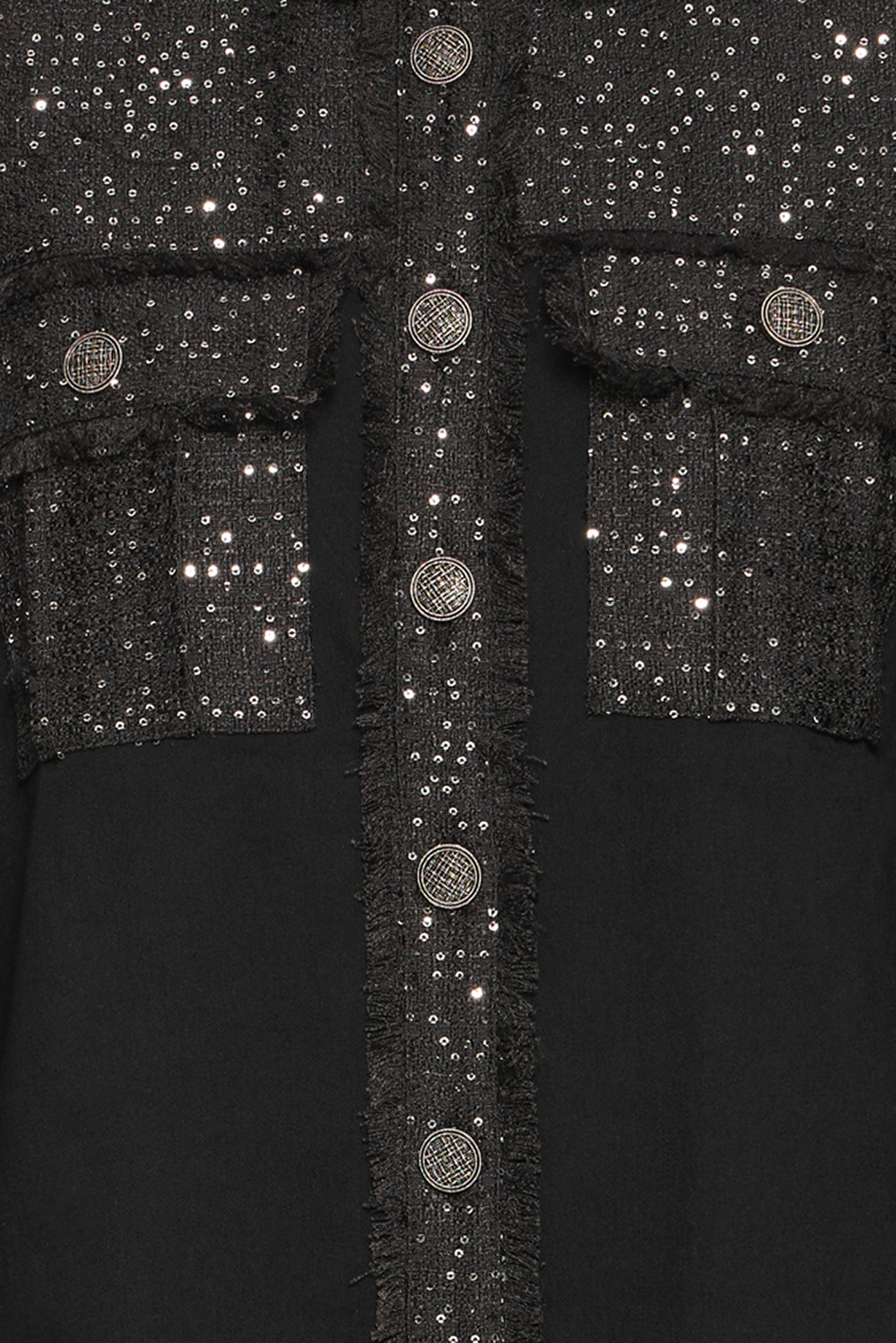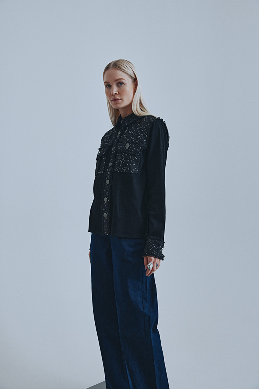 PZ Cossie Shirt fra Pulz Jeans er en elegant skjortejakke med glitrende detaljer. Den har mykt stoff, lommer foran og dekorative knapper. En feminin statement-jakke som løfter ethvert antrekk – like fin åpen over en topp som lukket til bukser eller skjørt.