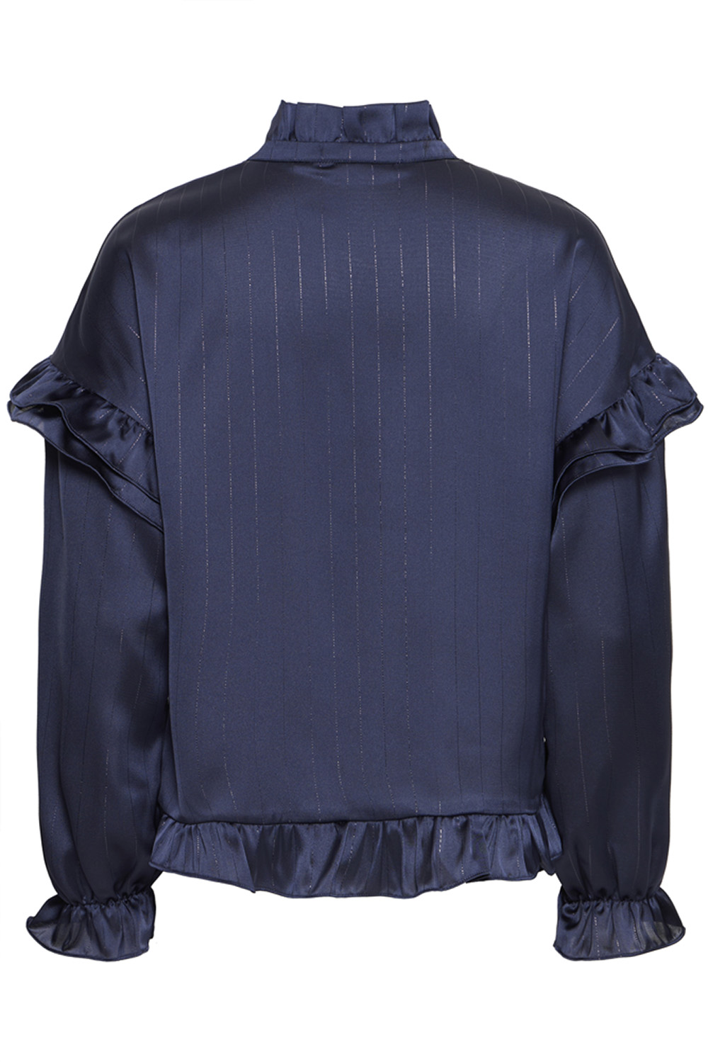 Pz Dorota Lurex Flounceblouse fra Pulz Jeans er en nydelig bluse med lett glans og delikate sølvstriper. De feminine volangdetaljene gir et mykt og elegant uttrykk. Behagelig passform som faller pent- perfekt til både hverdags og penere anledninger.