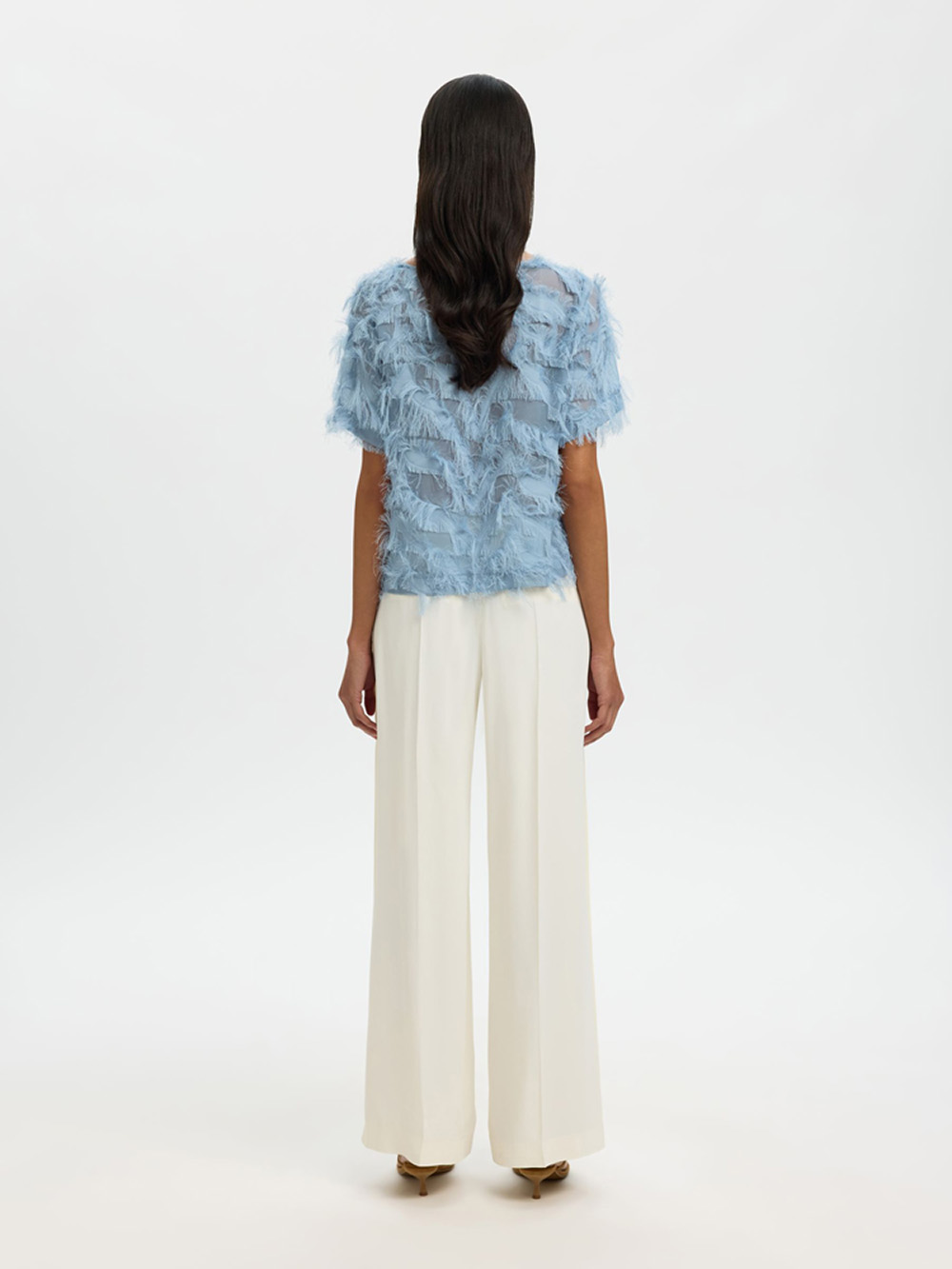 Topp fra SELECTED FEMME med elegant båthals og avslappet passform. Teksturert materiale og delikate frynsedetaljer gir et moderne og feminint uttrykk, mens korte ermer gjør den enkel å style til både hverdag og jobb.