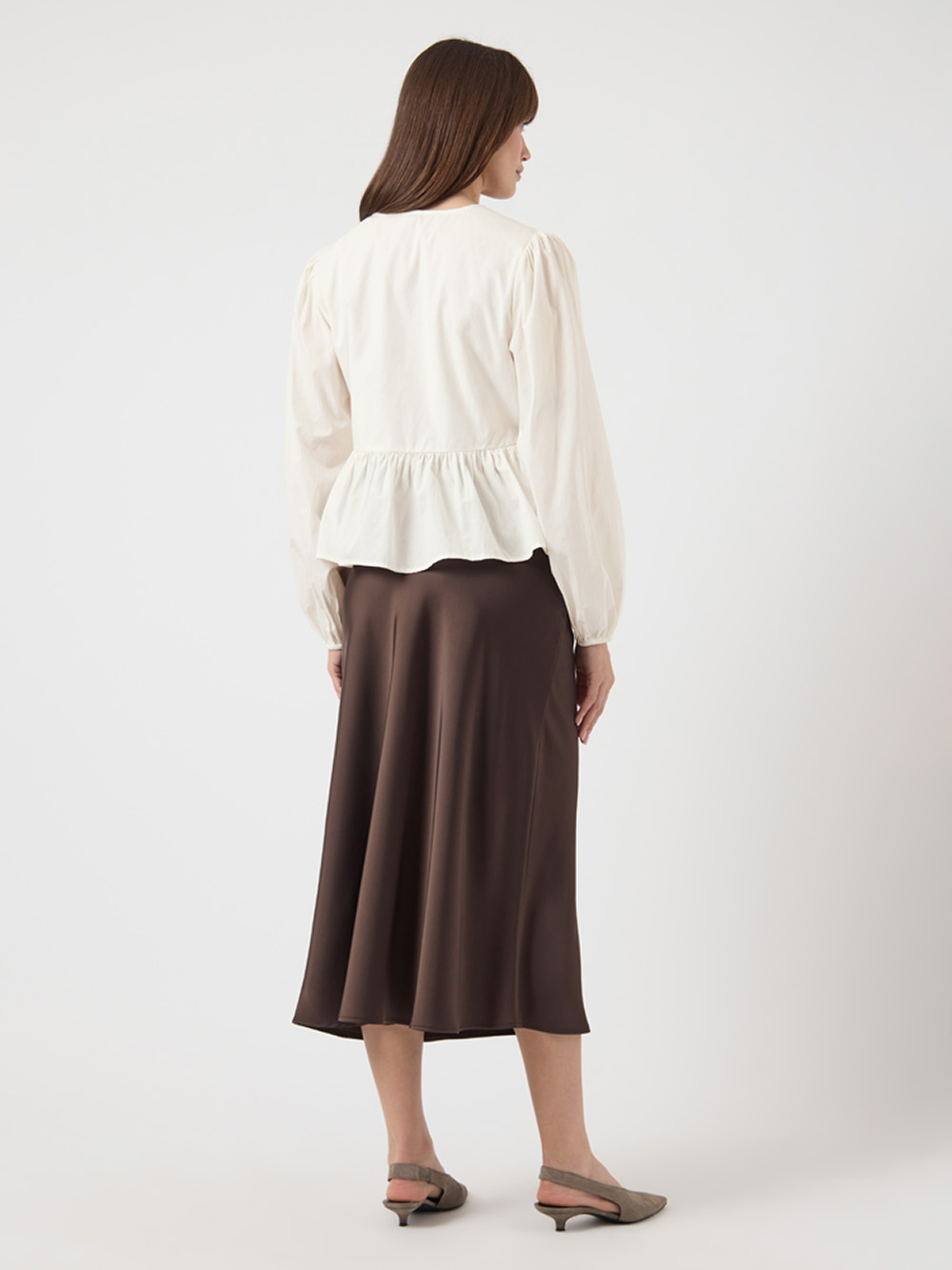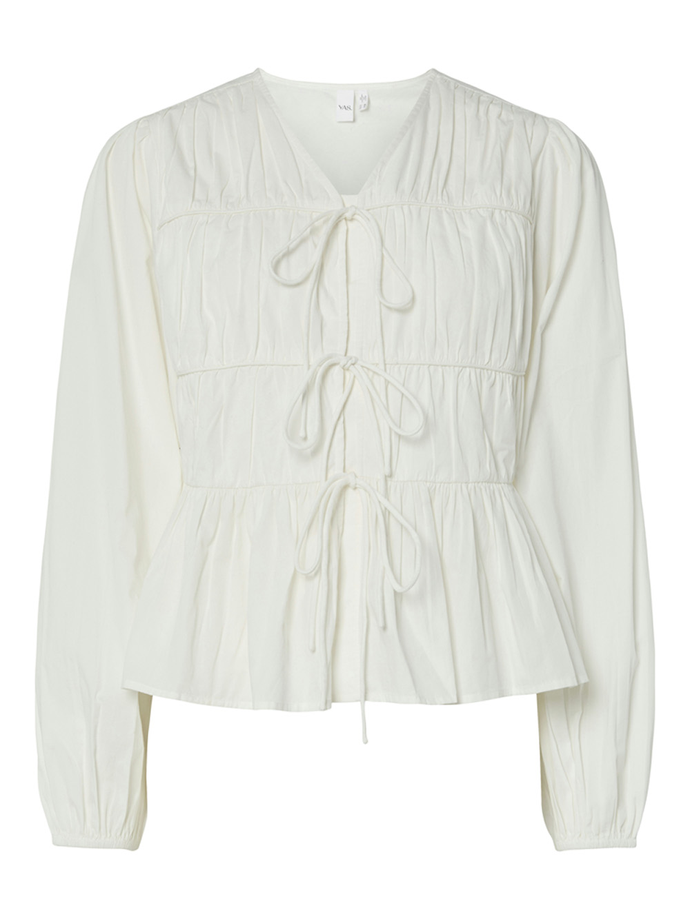 Bluse med V-hals og snørefeste, lange ballongermer med elastiske mansjetter og normal passform. Et feminint og moderne plagg som passer like godt til hverdag som til litt finere anledninger.