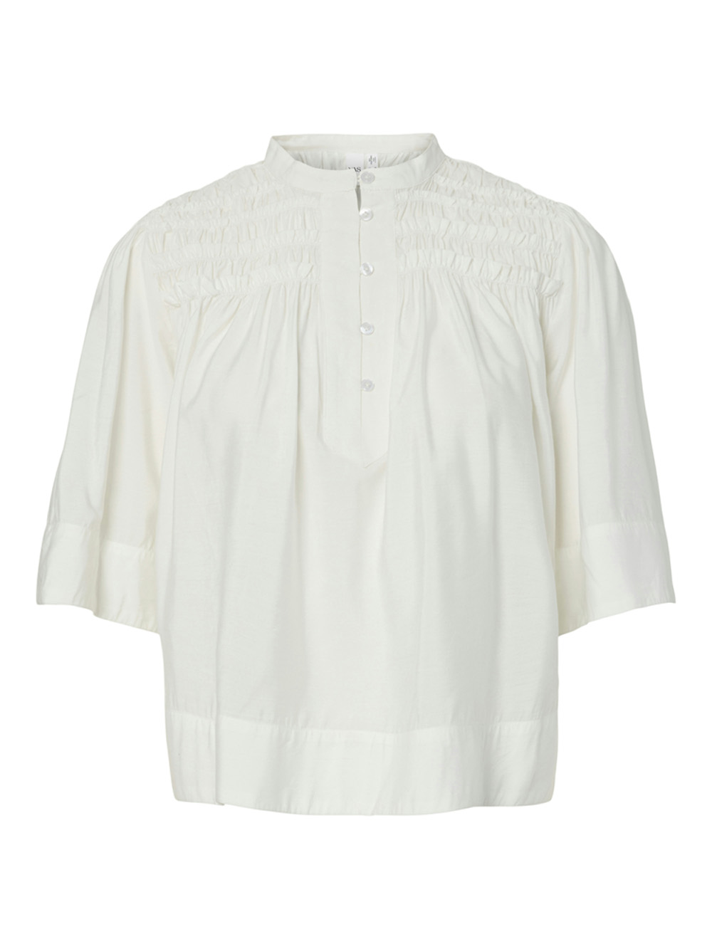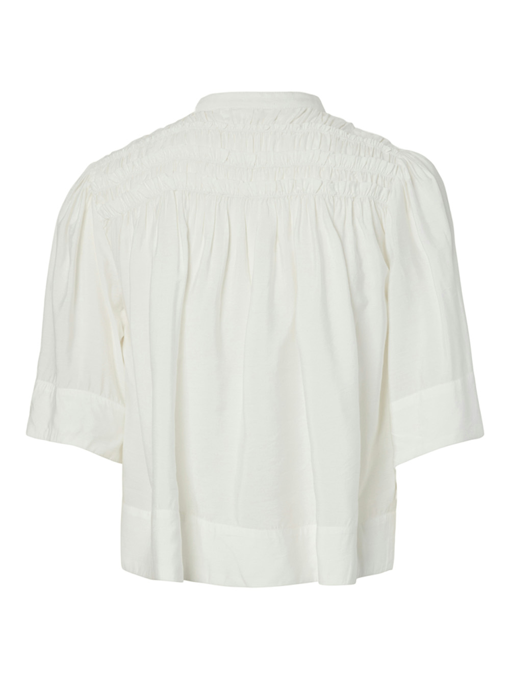 Lett og luftig bluse i en nydelig off-white tone. Delikate rynkedetaljer og knappelukking gir et tidløst, feminint uttrykk. Perfekt til både hverdags og finere anledninger.