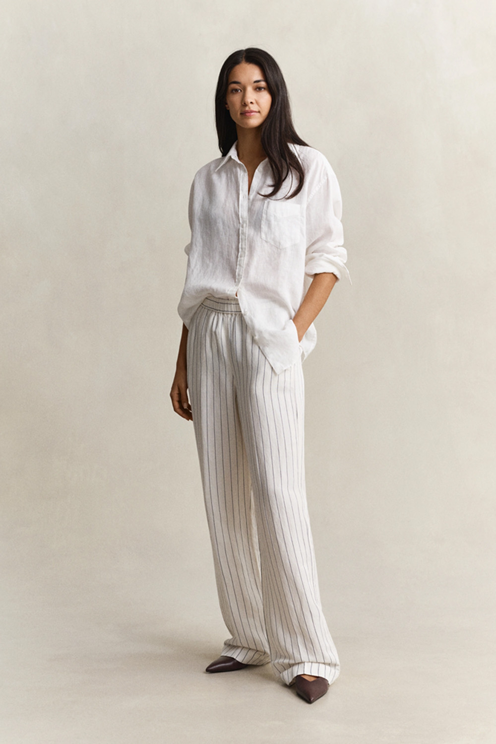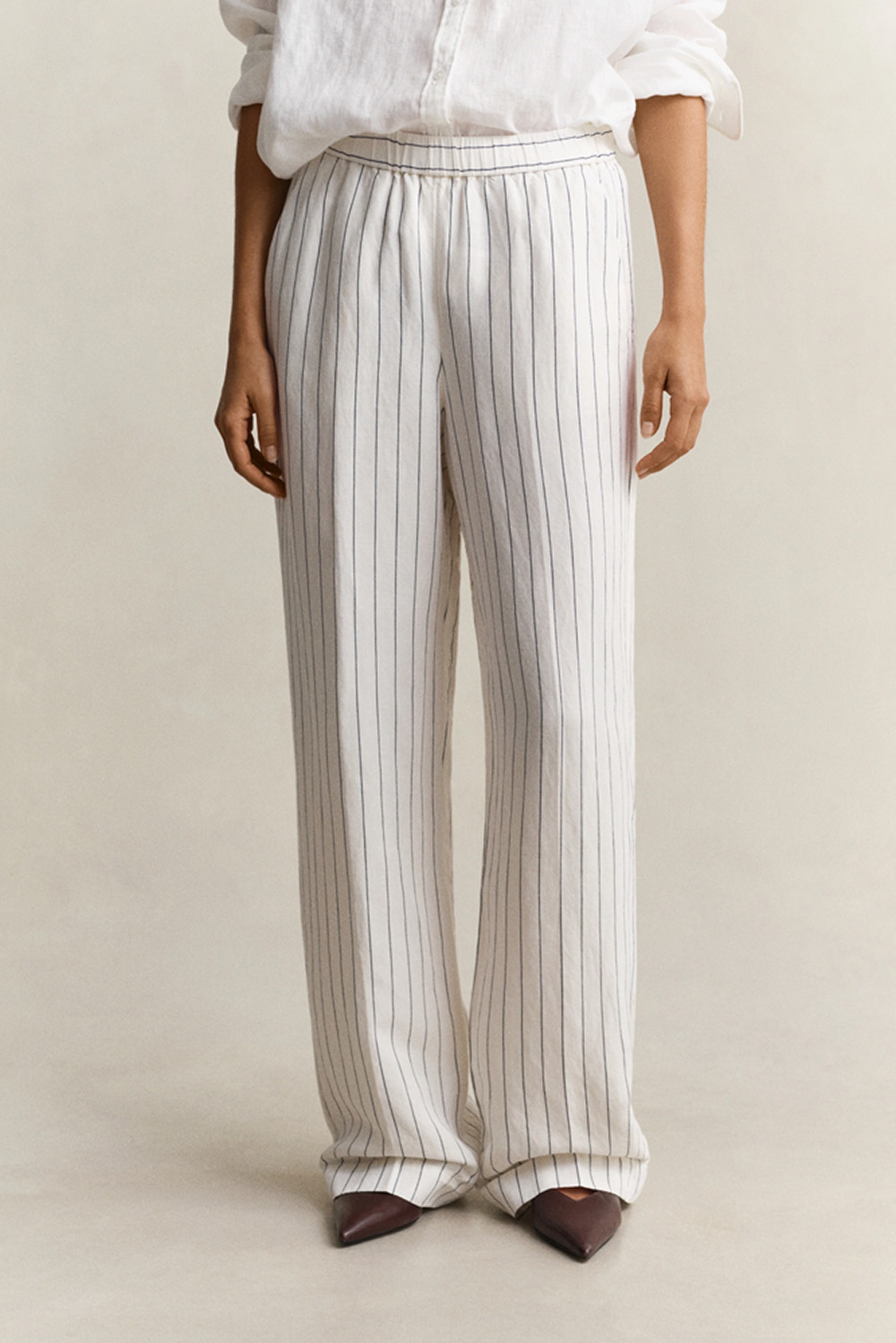 Lett og luftig bukse i lin- og viskoseblanding med vakkert fall. Avslappet passform og elastisk linning gir god komfort, mens striper, pressfolder og høye oppbrett tilfører et stilrent uttrykk – perfekt for varme dager.