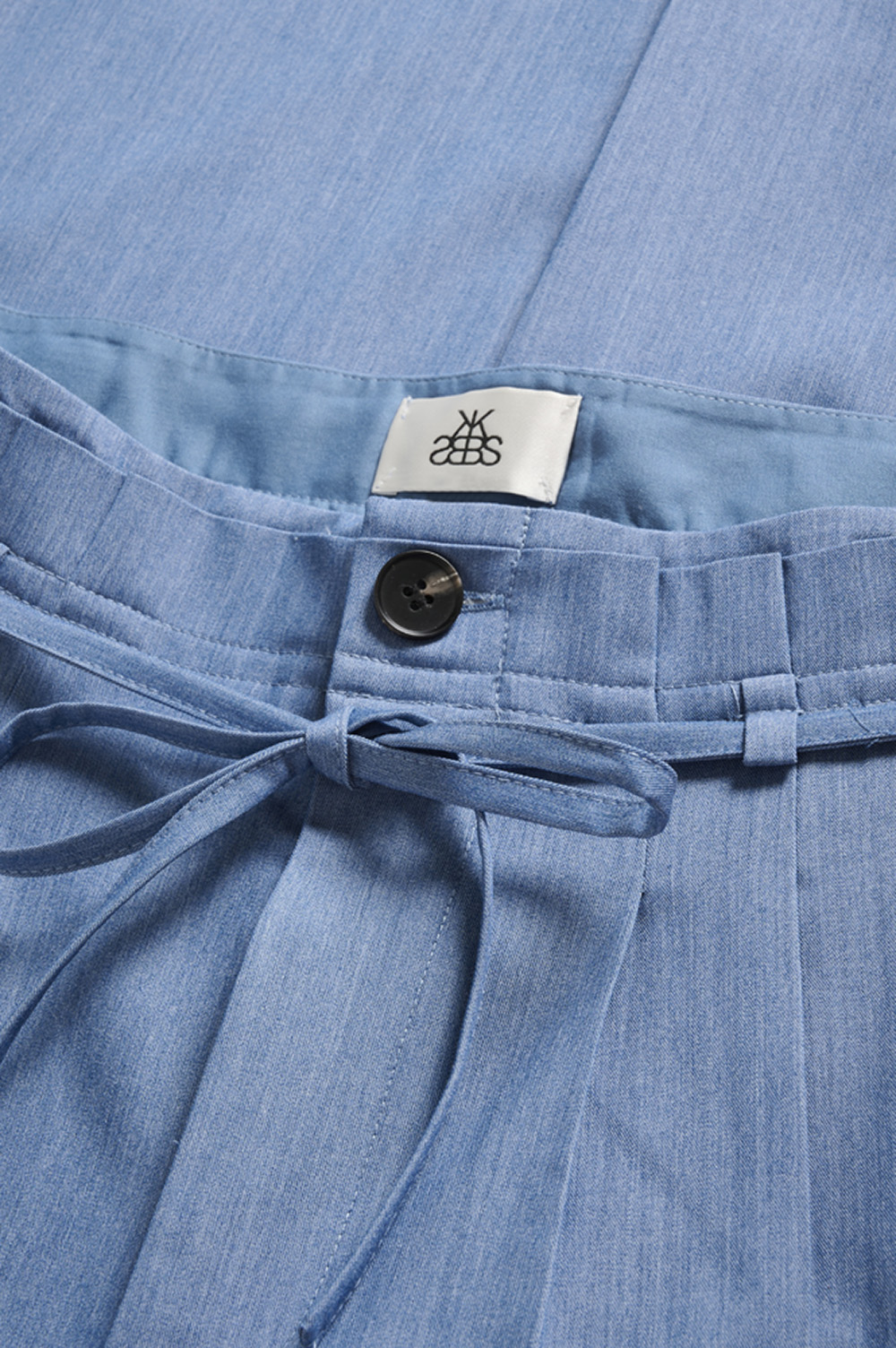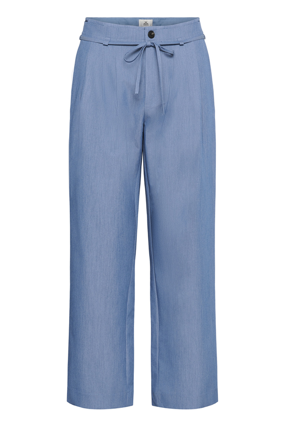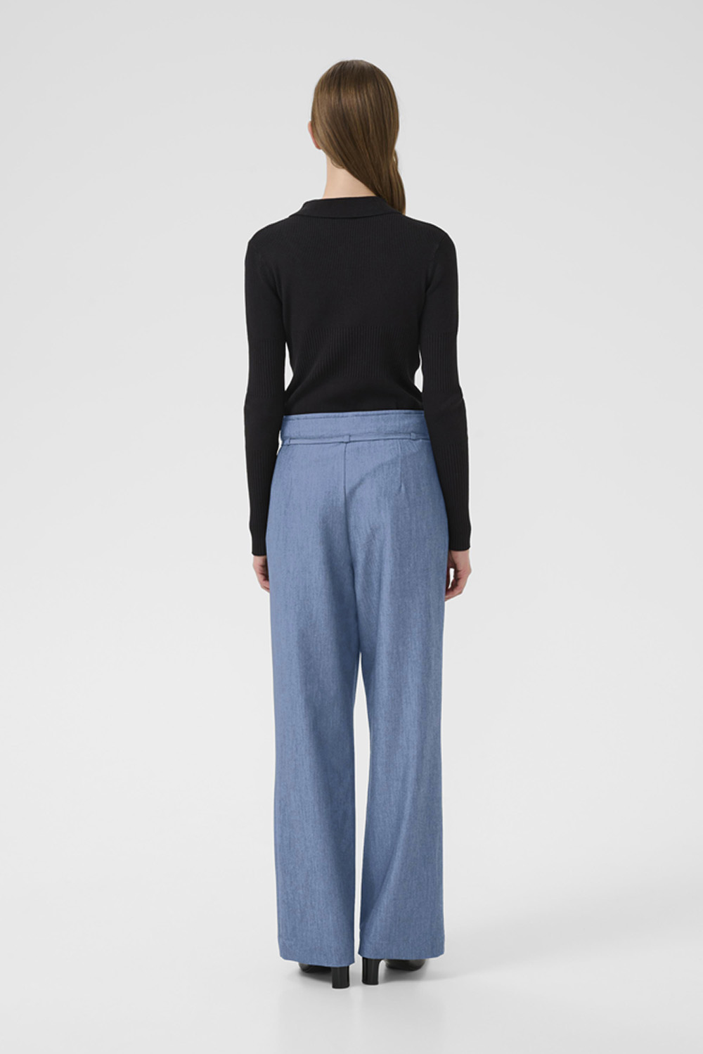 Elegante bukser med høy midje og vide ben, fremhevet av legg foran for en sofistikert silhuett. Knytebelte i midjen gir et feminint preg og gjør buksen enkel å style til både jobb og festlige anledninger.