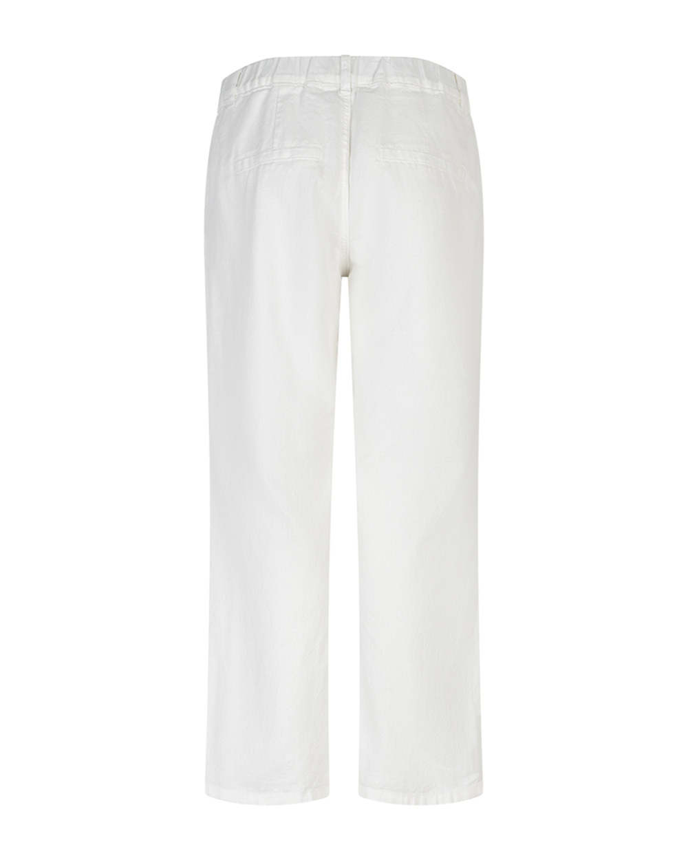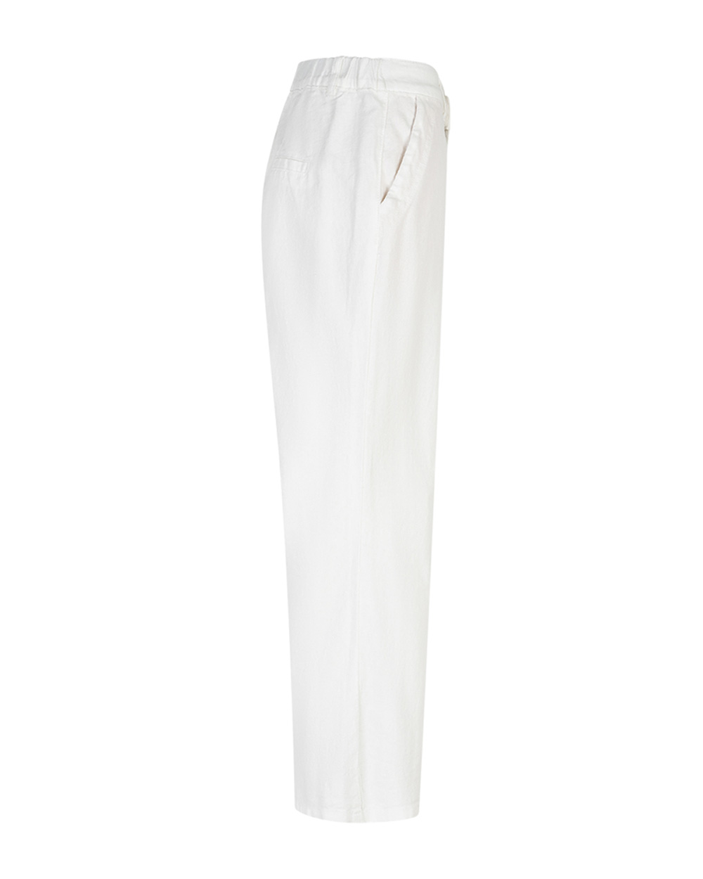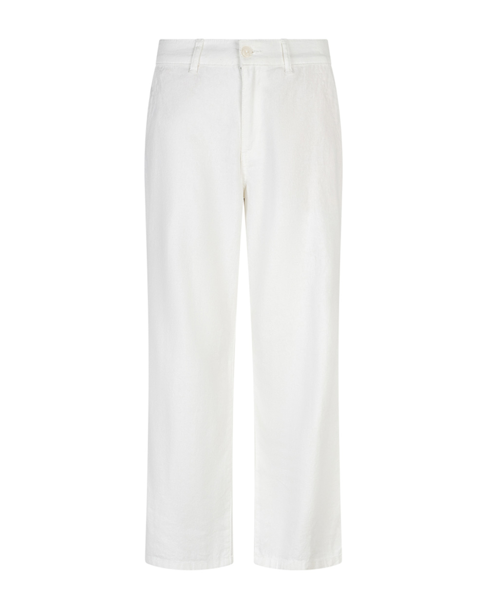En lett og luftig bukse i lin- og bomullsblanding med høyt liv, regulær passform og vide ben. Ankel-lengden (ca. 26 tommer) og rene linjer gir et avslappet, men velkledd uttrykk – perfekt for varme dager.
