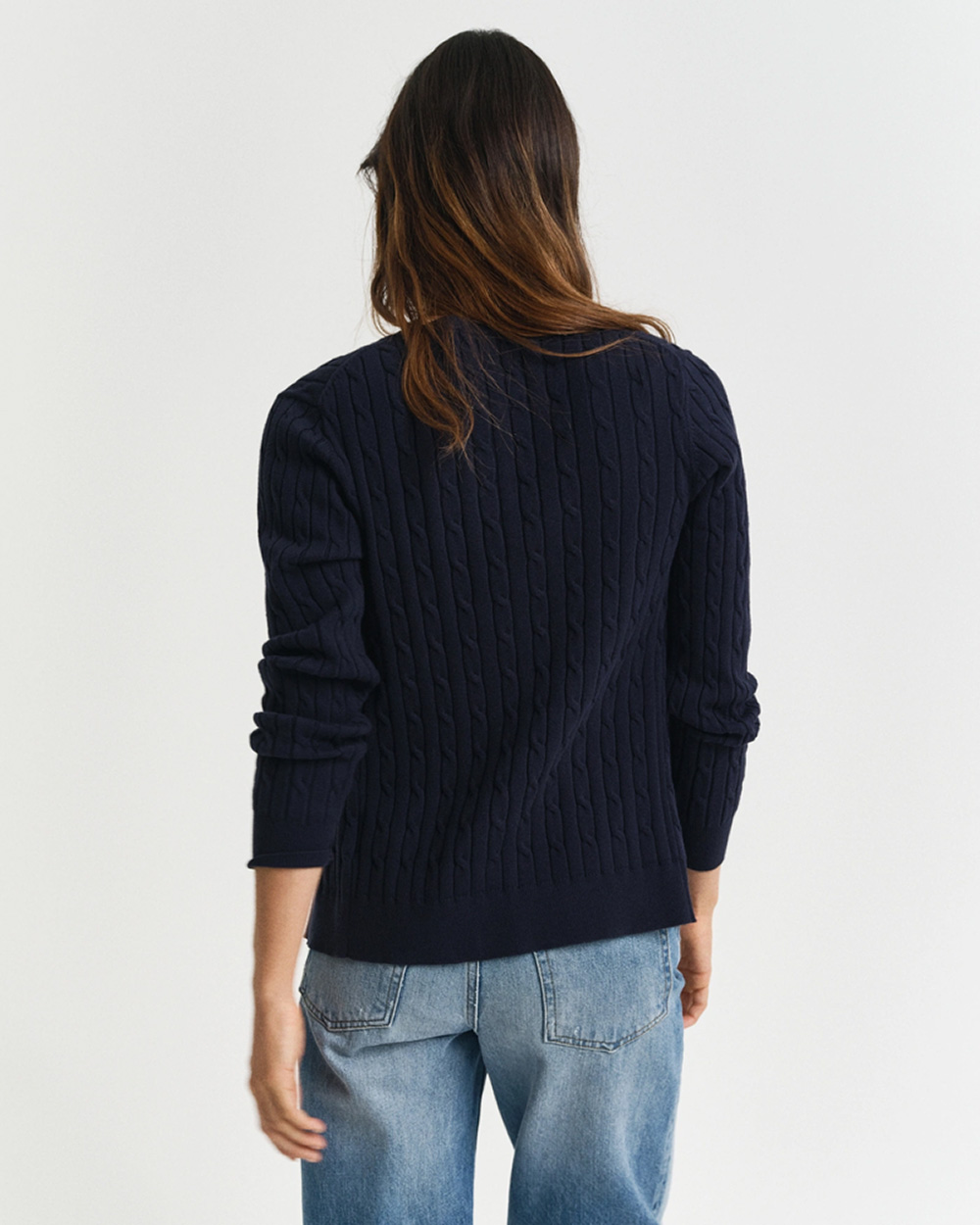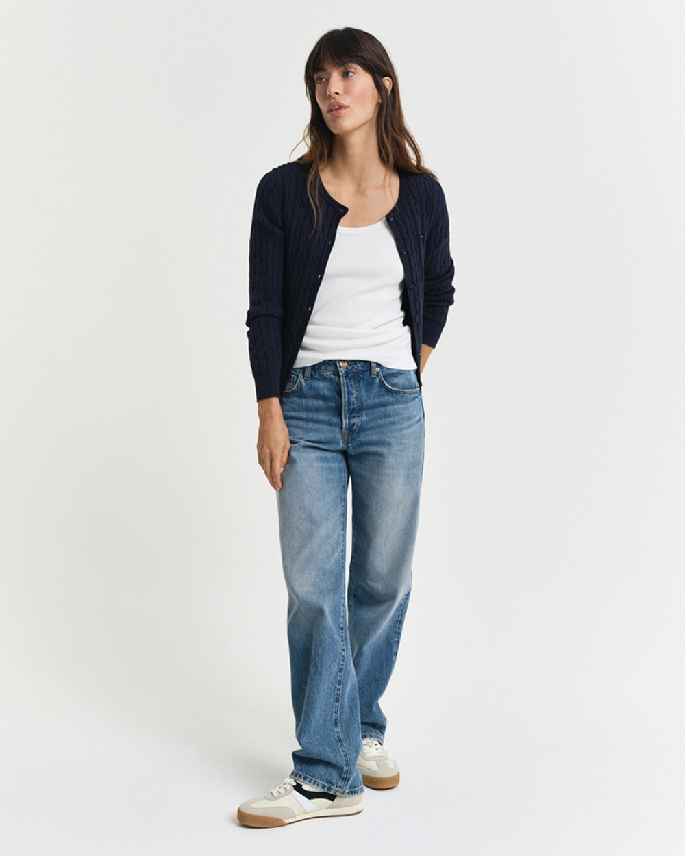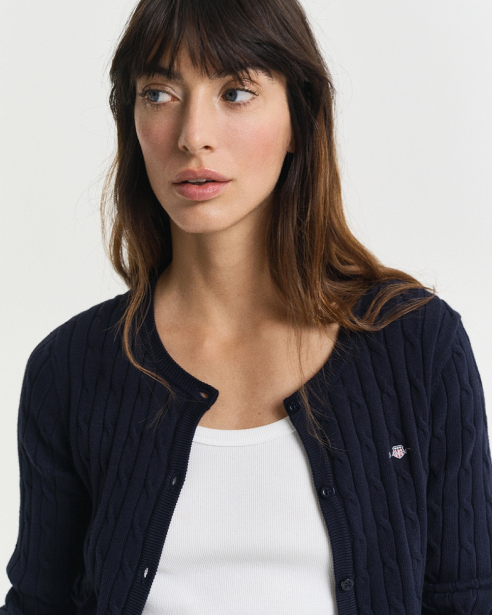Stretch Cotton Cable Cardigan fra GANT- en feminin og tidløs cradigan i myk bomullsblanding. Den male, men stretchy passformen sitter pent, mens rund hals og ribbede kanter gir et elegant uttrykk. Fullført med diskret GANT-grafikk på brystet.