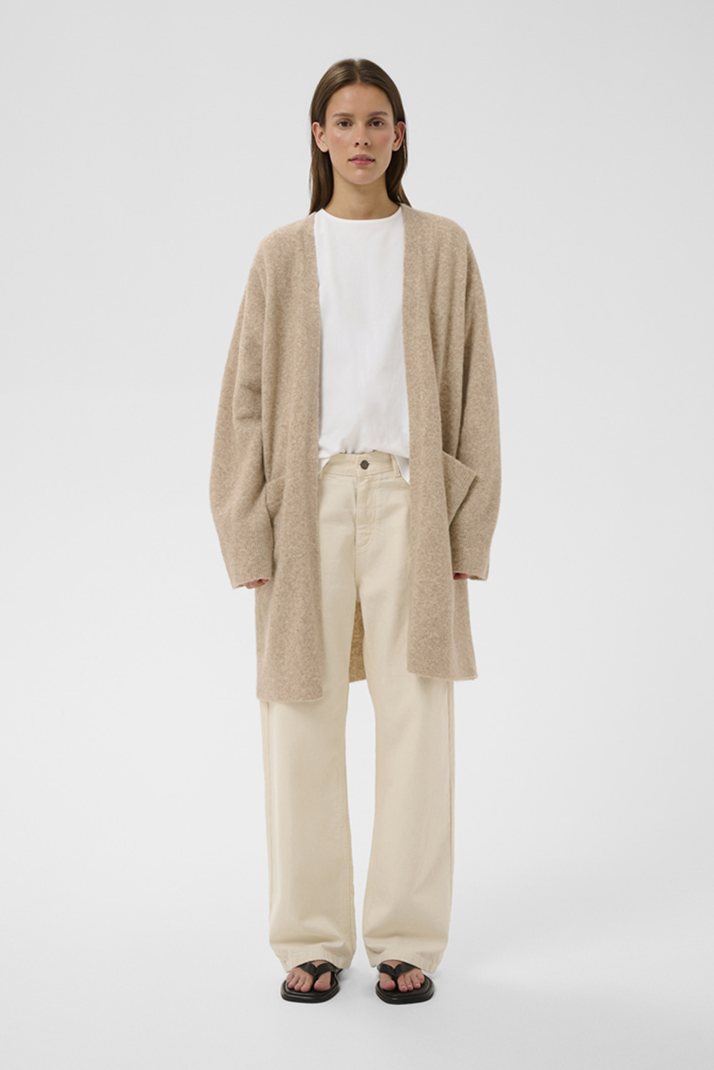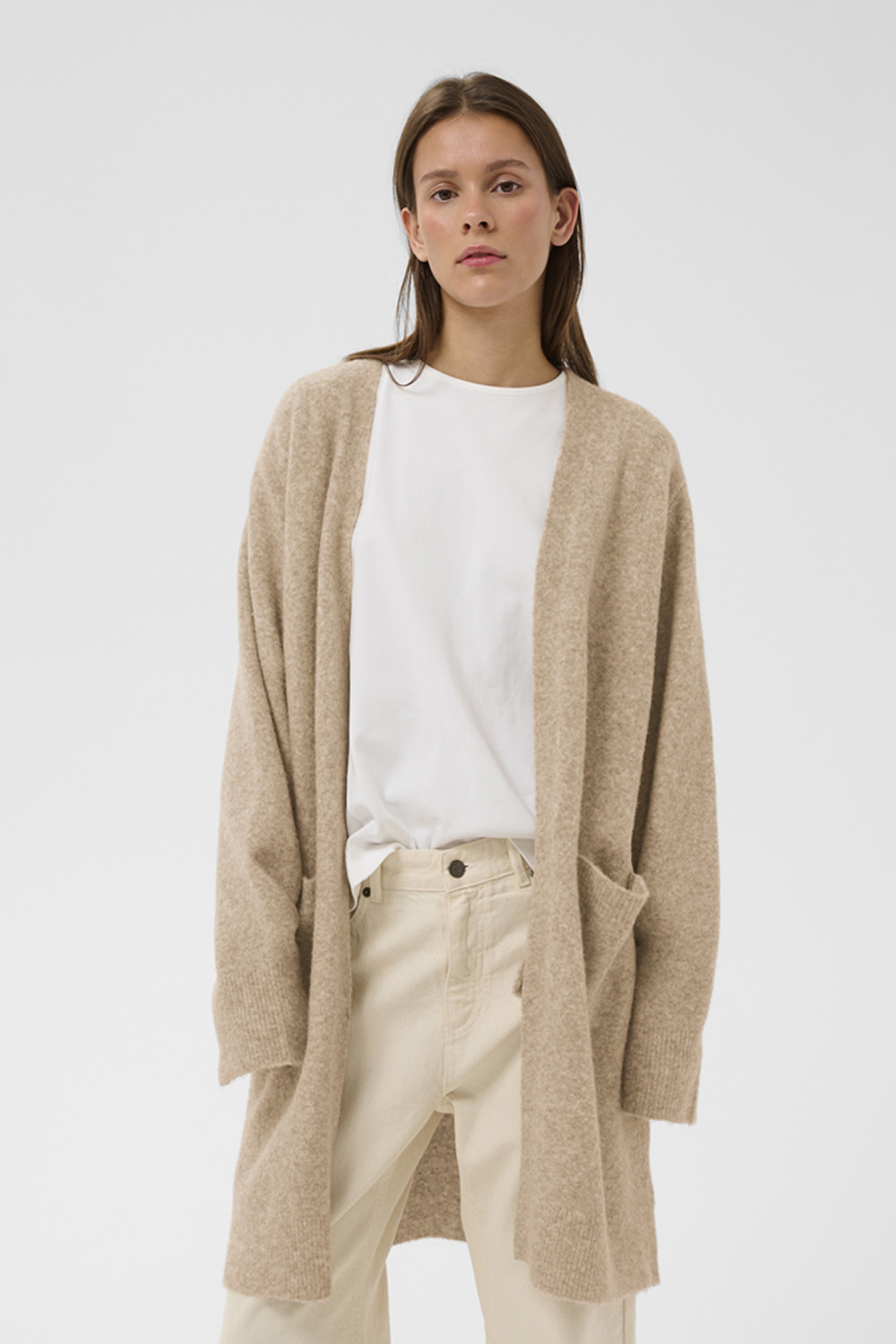 En myk og avslappet cardigan for hele dagen! Knelang lengde, droppede skuldre og praktiske frontlommer gjør den perfekt til både jobb og fritid. En klassiker som passer til alt i garderoben.