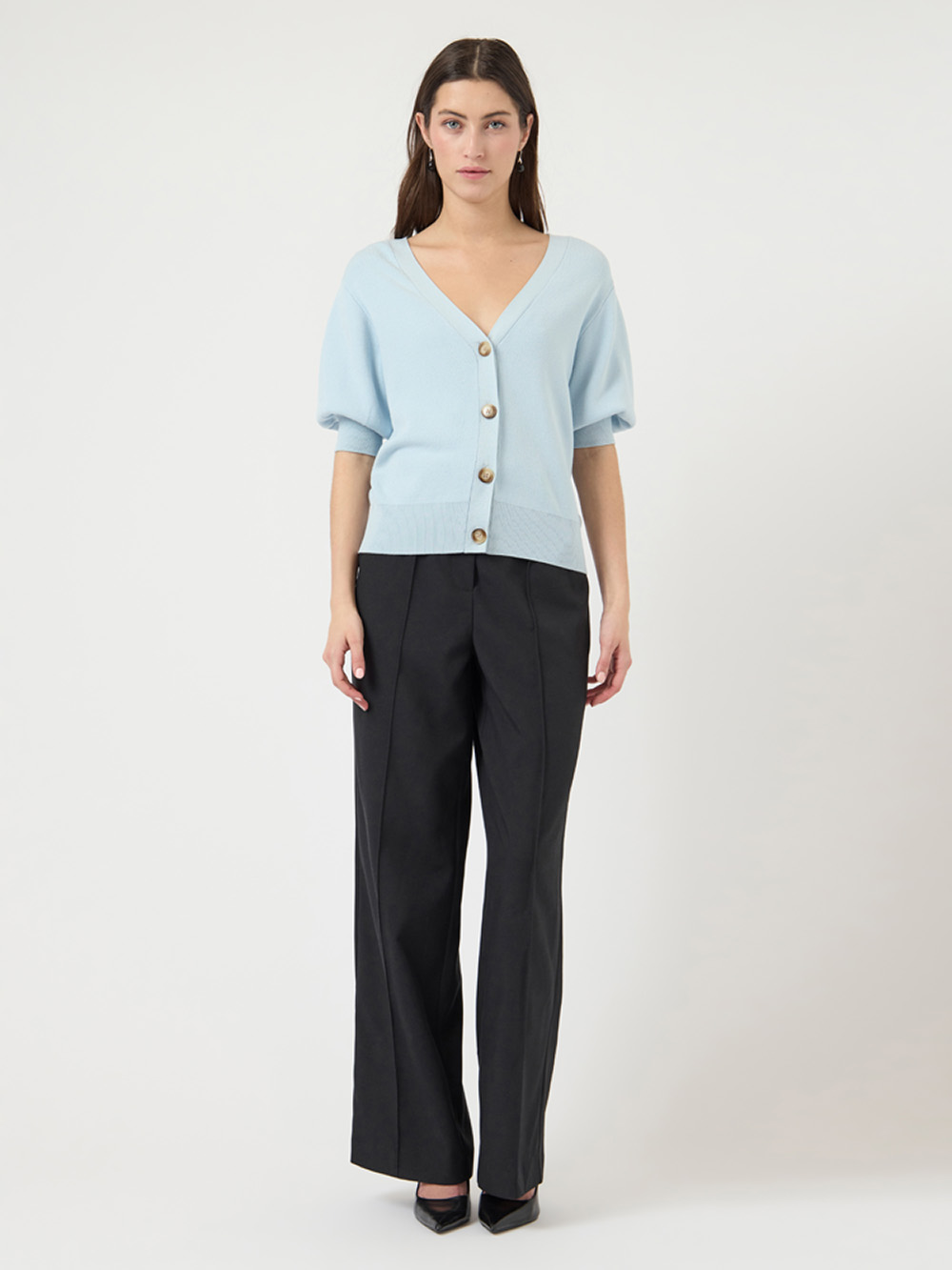 Myk og tidløs cardigan i strikket viskoseblanding med V-hals og 2/4-lange ballongermer. Ribbestrikkede mansjetter og knappelukking gir et feminint uttrykk, mens normal passform gjør den enkel å style til både hverdag og mer pyntede anledninger.