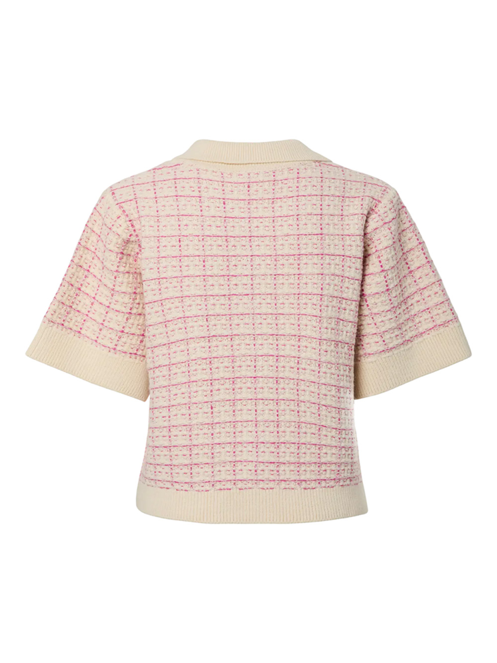 Kortermet strikkejakke med krage og knappelukking, i tweed-inspirert rutemønster med rosa nyanser og et diskret metallisk skimmer. Dekorative lommer og ribbekanter gir en flatterende silhuett – perfekt til både kontor og sommerfest.