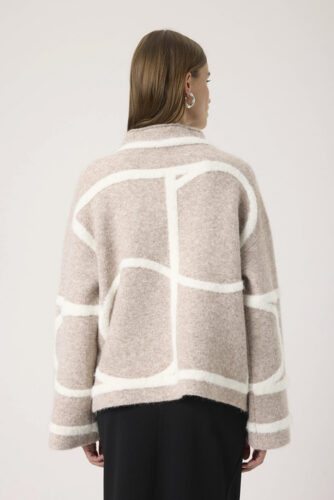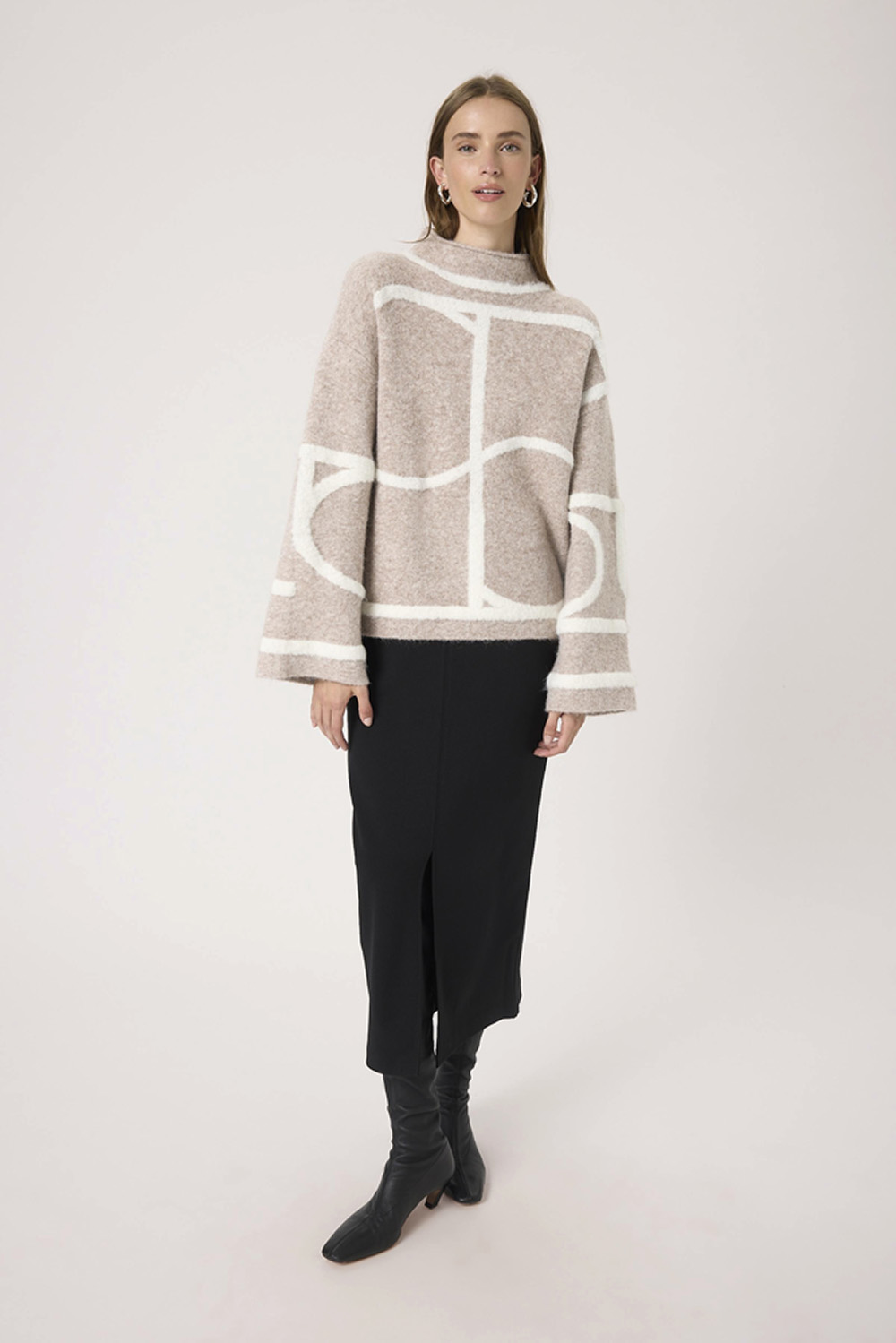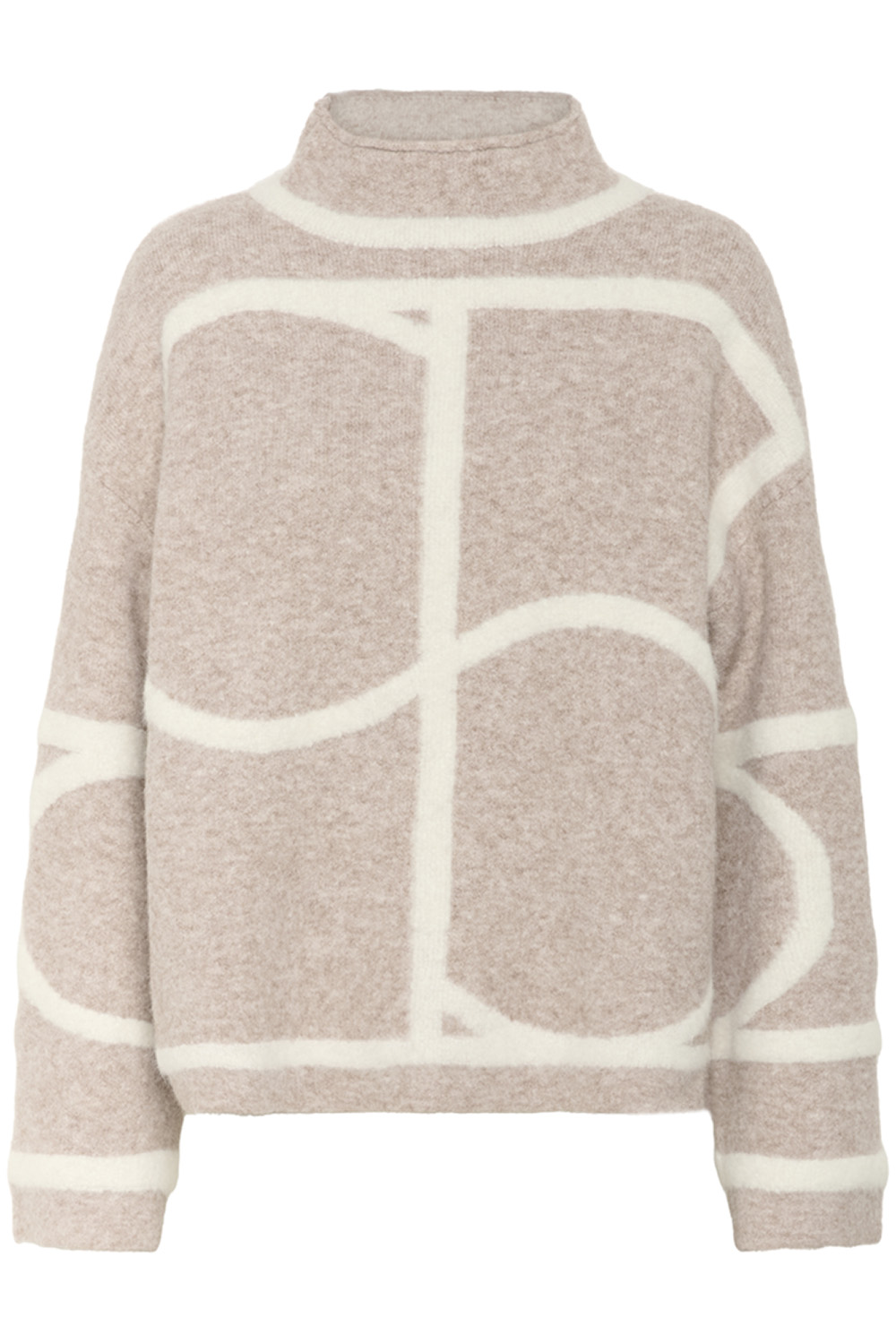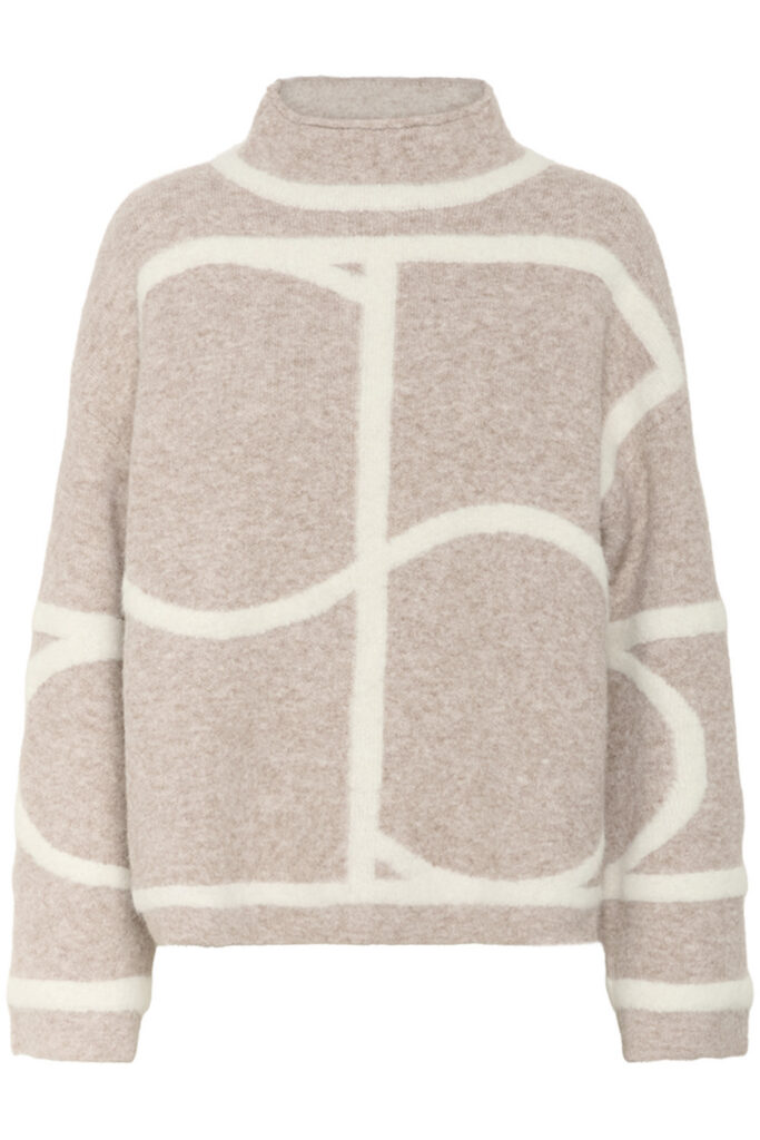 SL Soreo Mono Pullover fra Soaked in Luxury. Kos deg i stil! Denne pulloveren med løs passform, høy hals og vide ermer kombinerer komfort med et grafisk mønster som virkelig skiller seg ut. Perfekt for hverdagsluksus eller avslappede dager hjemme.