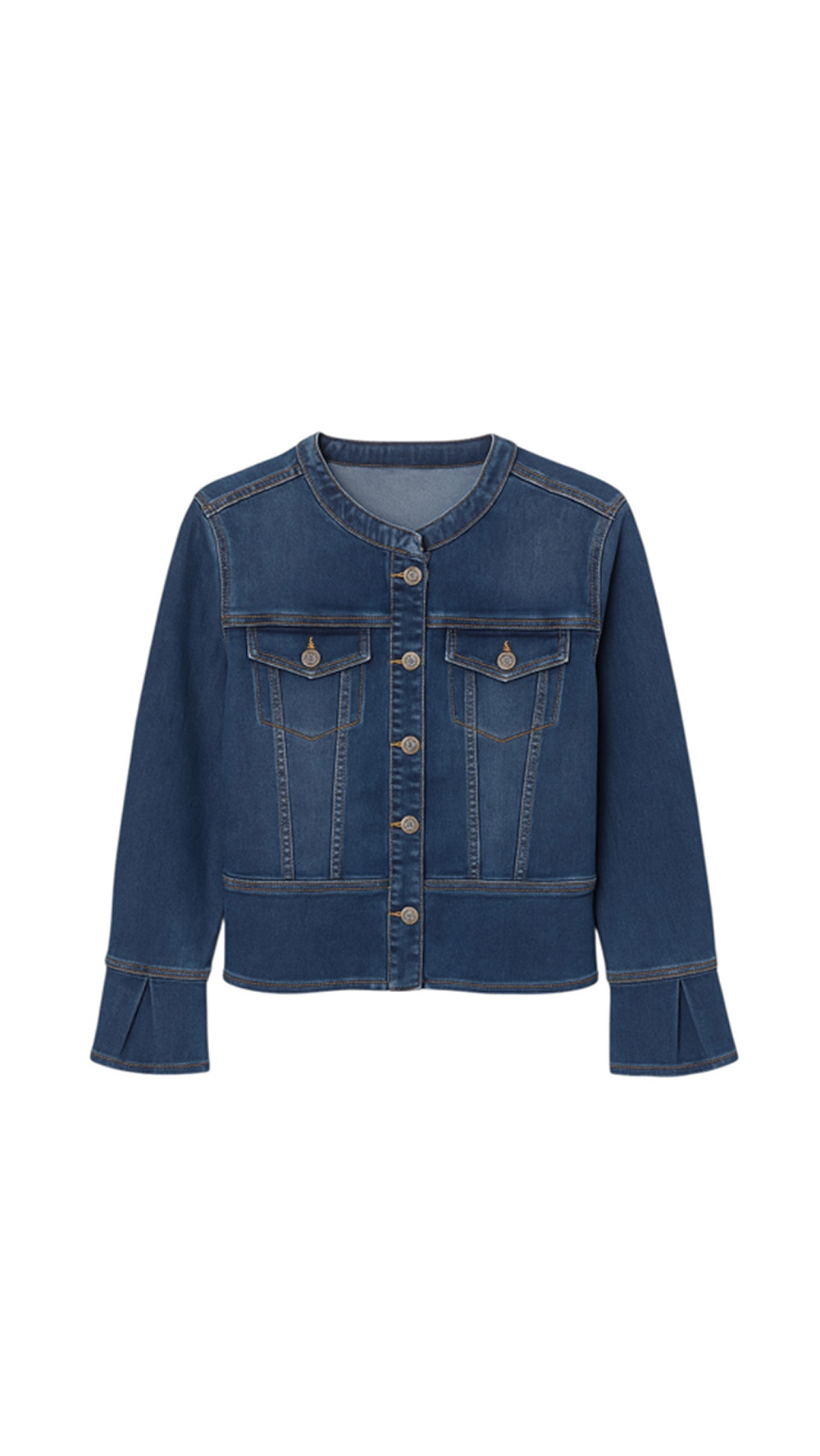 Kort denimjakke i myk bomull med dekorative brystlommer og bred volangerm. Perfekt for avslappede, lag-på-lag-antrekk med et moderne preg.