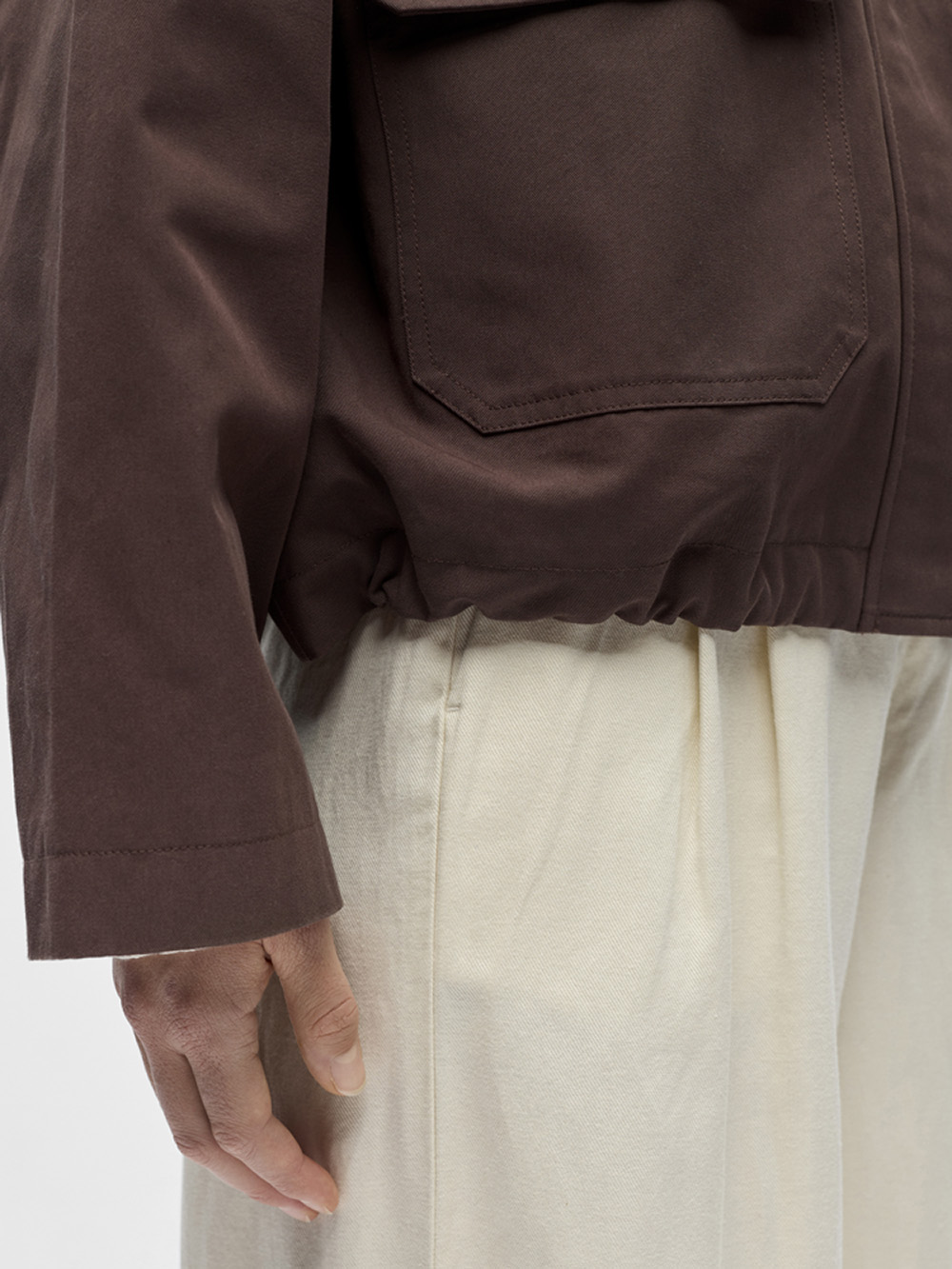 Kort trenchcoatinspirert jakke med oversized skjorteform, lave skuldre og lange ermer. Glidelåslukking med trykknapplist og store cargolommer gir både funksjon og stil, mens normal passform gjør den lett å kombinere til hverdags og jobb.