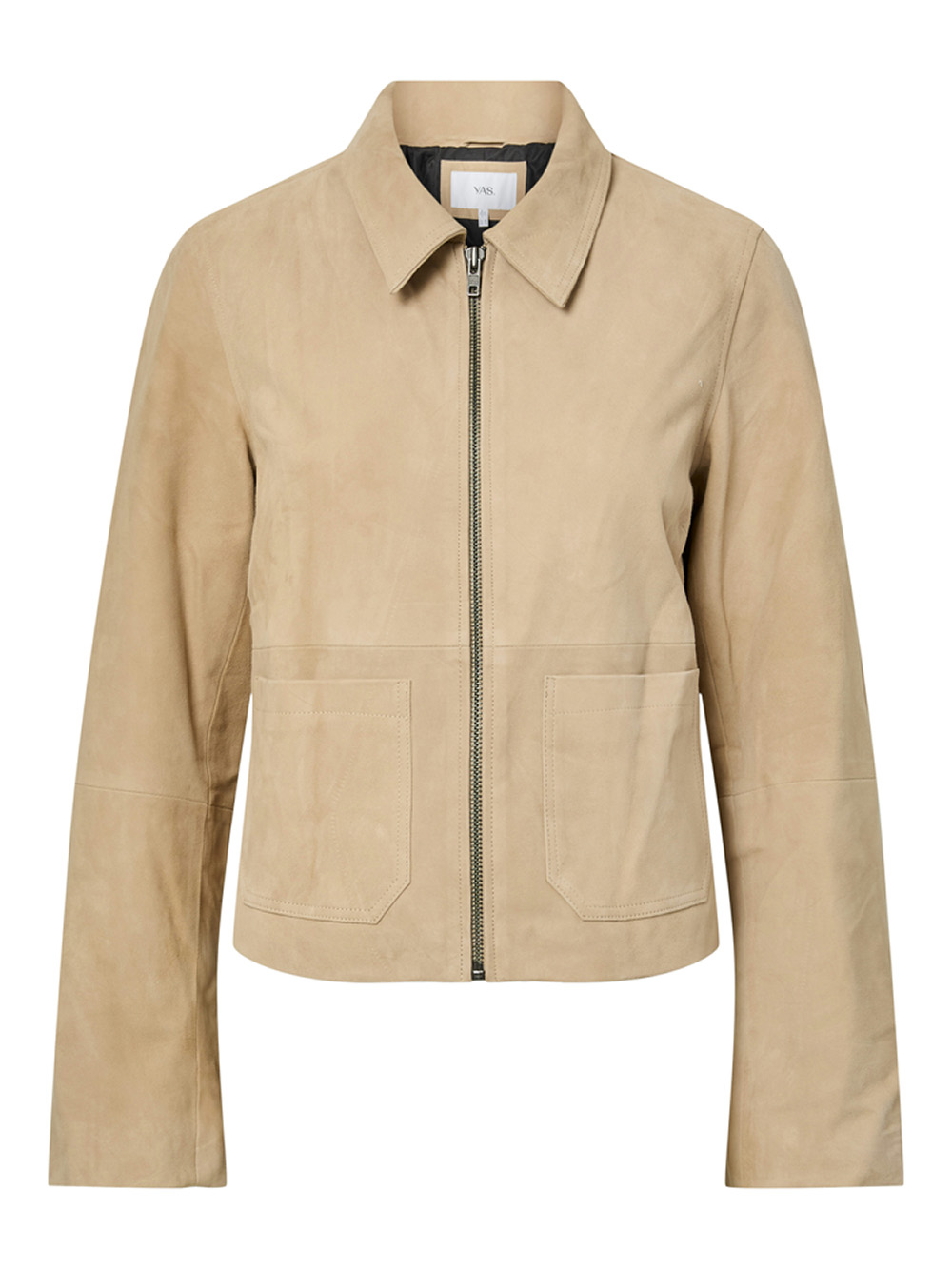 Kort, rett fasong med klassisk krage og glidelås foran gir et rent uttrykk, mens diskrete sidelommer og lett fôr gjør den komfortabel og praktisk. Tidløs semsket skinnjakke som passer perfekt til jeans, strikk eller over kjoler for en pen hverdagslook.