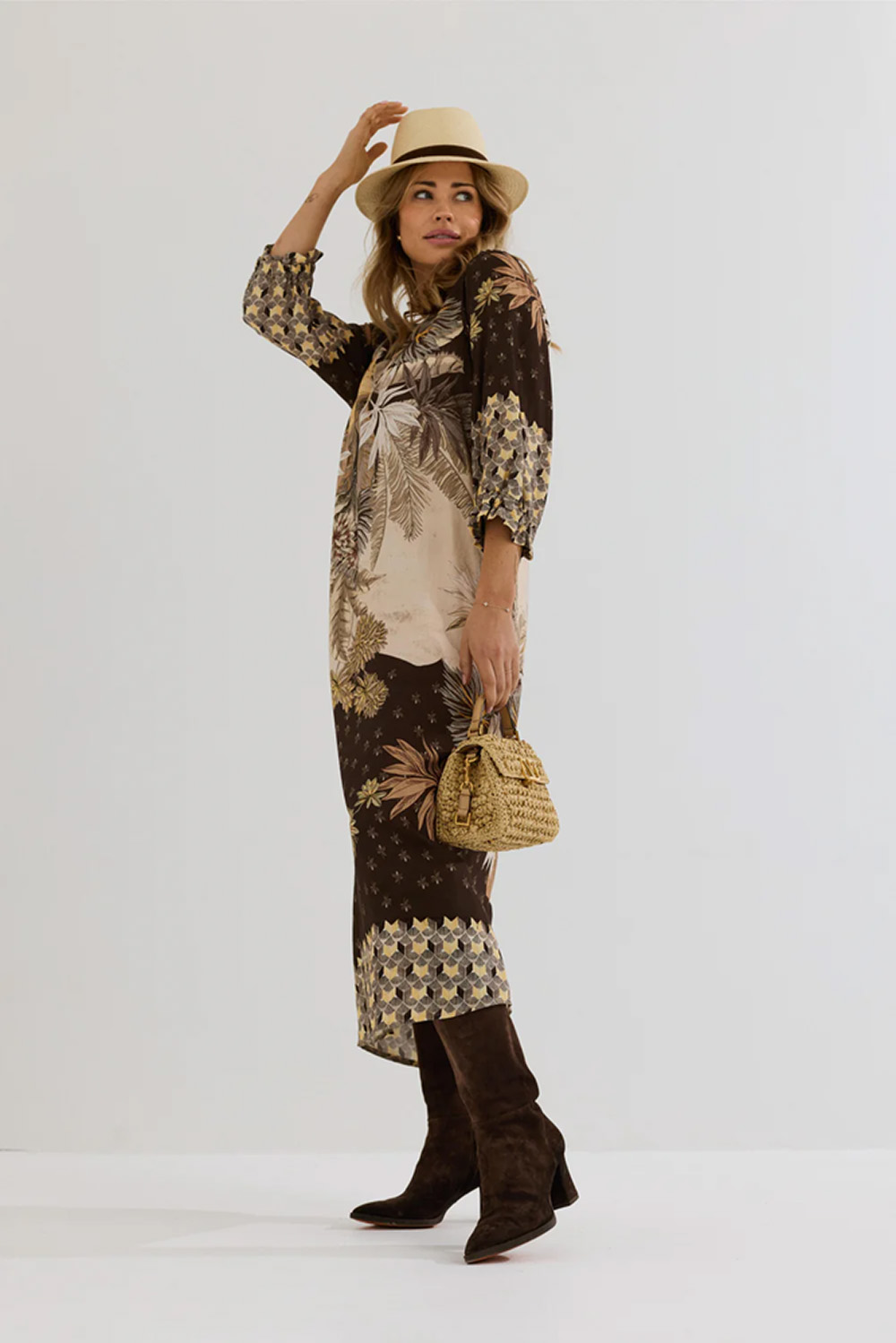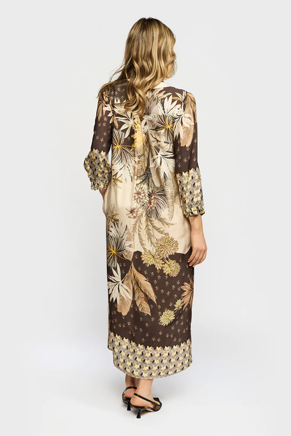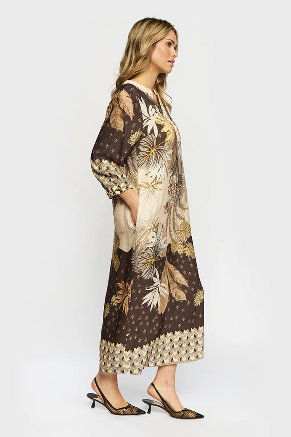 Mønstret midi-kjole i 100% TENCEL™ viskose med løs og ledig fasong. Trekvart ermer, lommer og V-utskjæring med knapper gjør den komfortabel og perfekt til både hverdag og sosiale sammenkomster.
