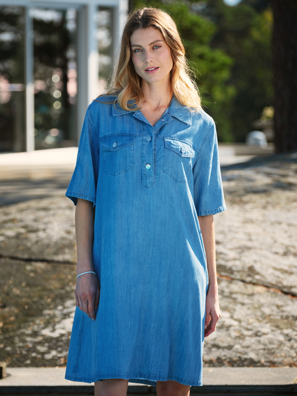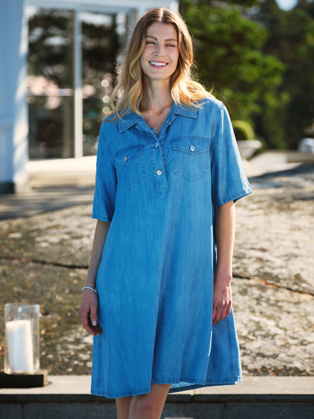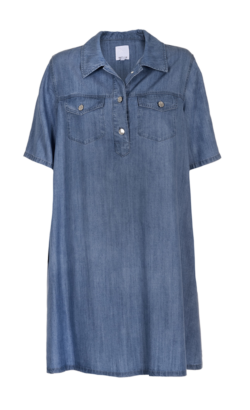 En kort, A-formet denimkjole med klassisk krage, knepping i front og korte ermer. Brystlommer gir et avslappet uttrykk, mens den enkle silhuetten gjør kjolen lett å style – perfekt med slippers til hverdags eller hæler til en mer pyntet anledning.