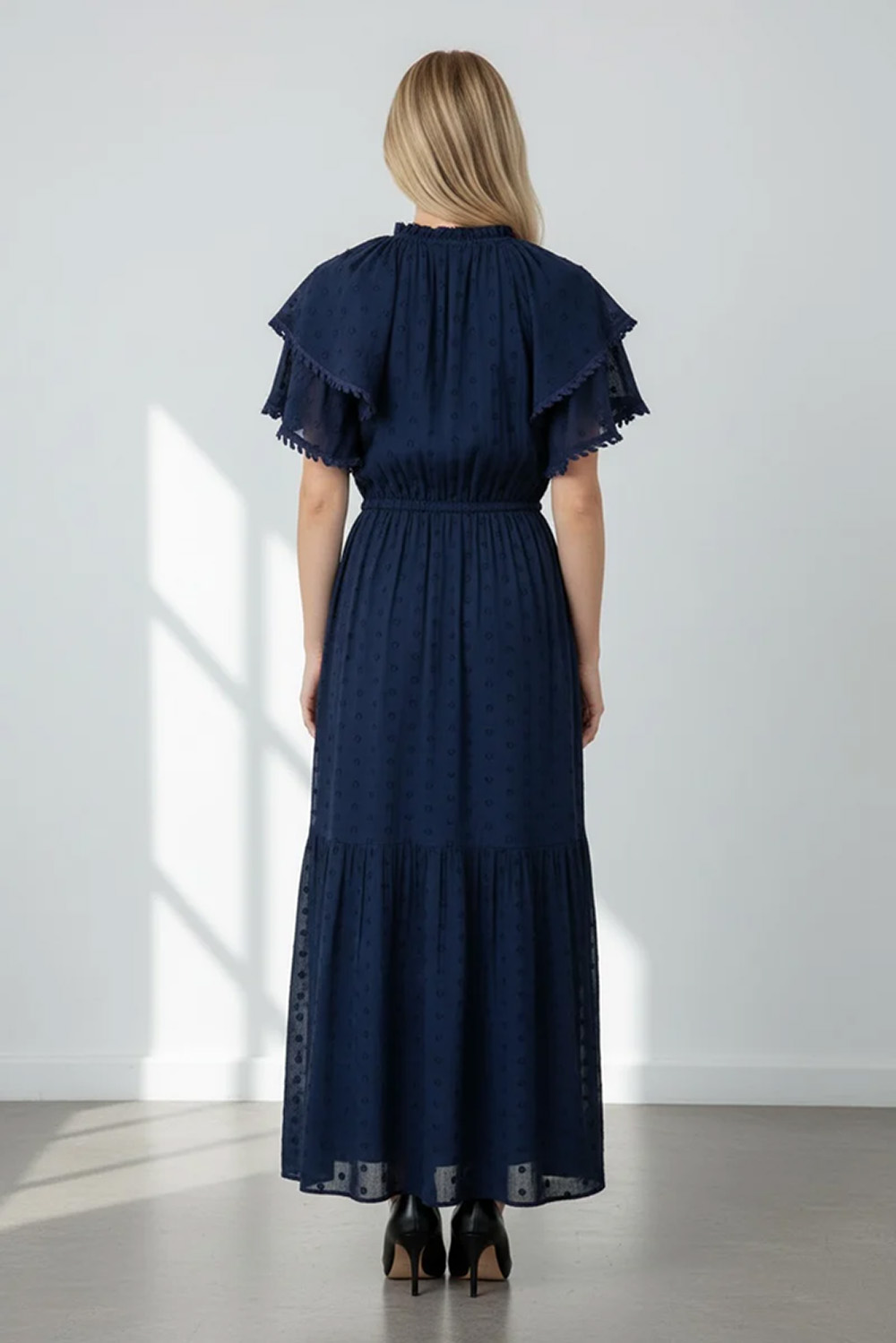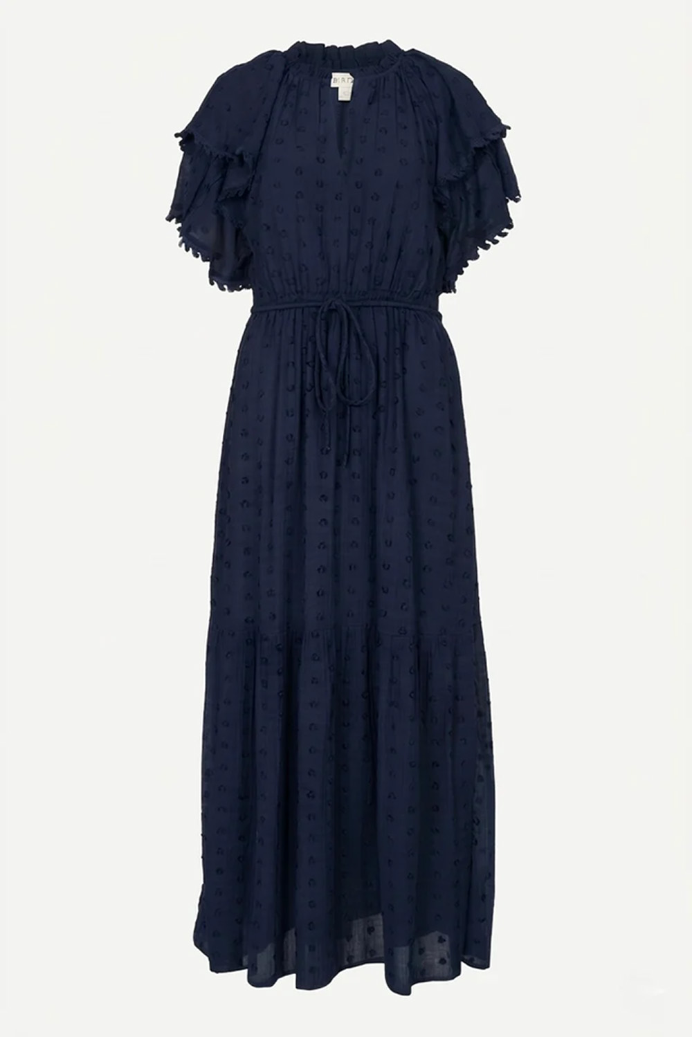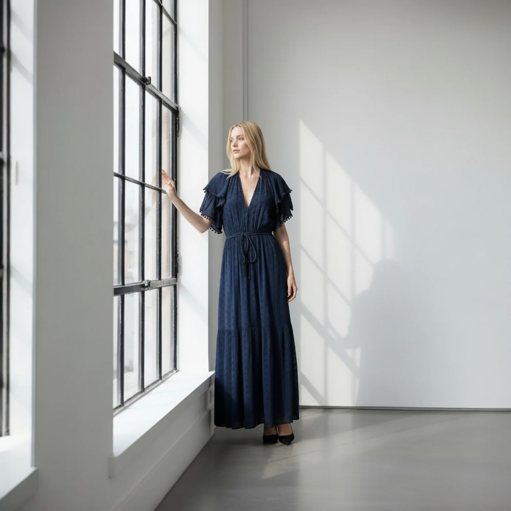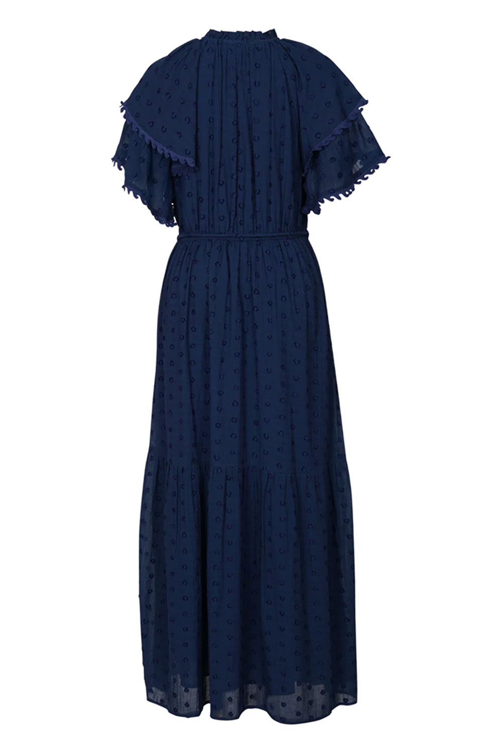 En tidløs, mørkeblå kjole med romantiske detaljer. Laget i en lett og luftig blanding av bomull og dobby viskose som gir en subtil, eksklusiv tekstur. Volanger på ermene og knyting i livet skaper en feminin silhuett. Perfekt både til hverdags og finere anledninger.