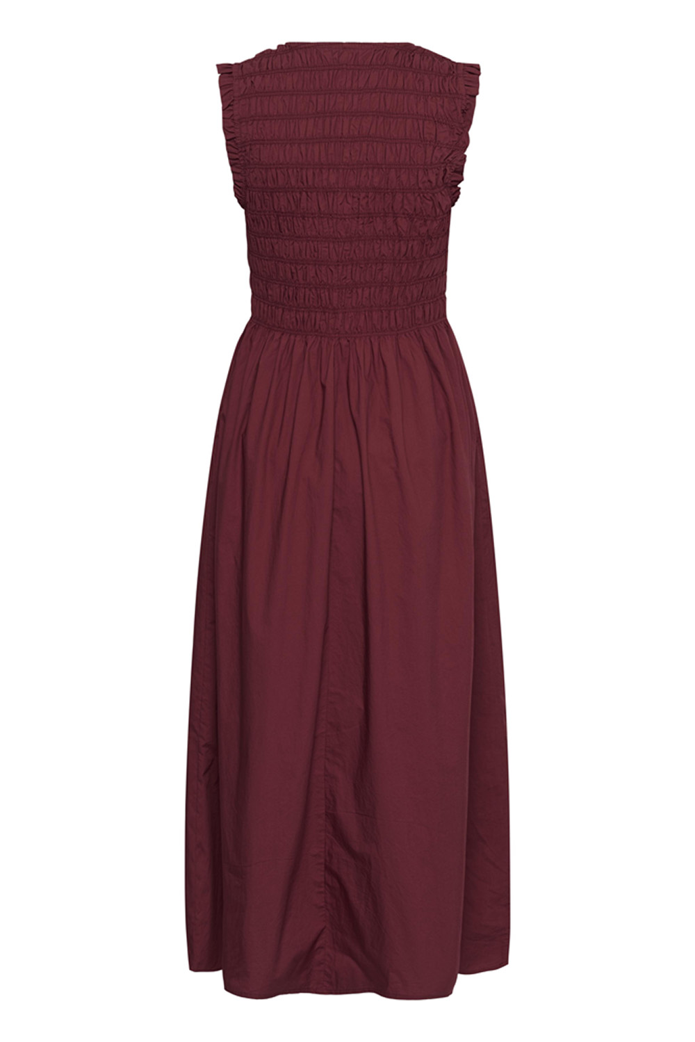 En feminin midi-kjole med smocket liv som gir en flatterende passform. V-utringning med knytedetalj og ermeløst design med rysjer på skuldrene tilfører en romantisk touch. Den vide, lange skjørtedelen skaper et lett og luftig uttrykk – perfekt til både hverdags og sommerlige anledninger.