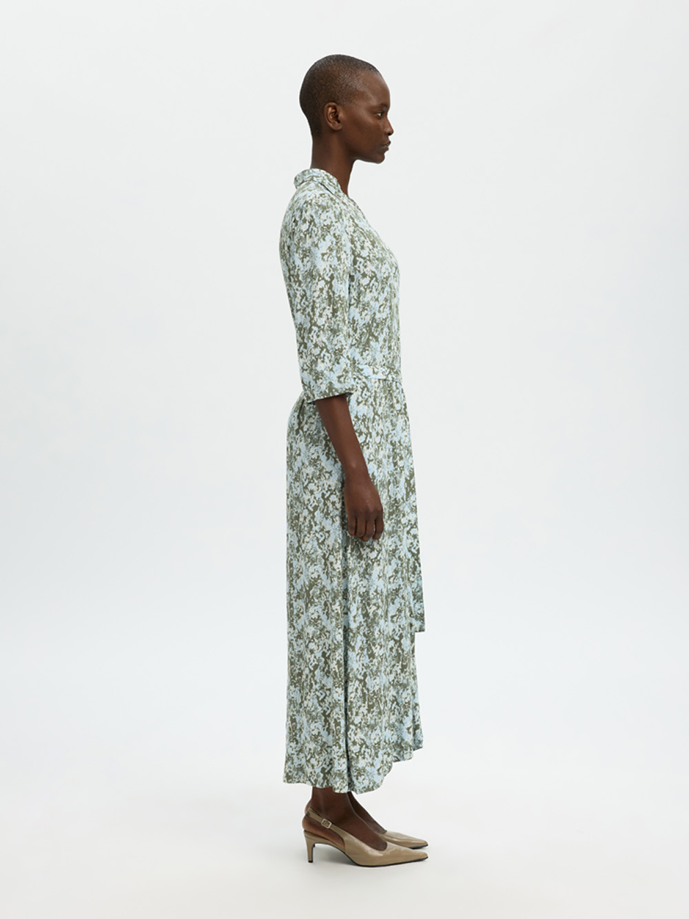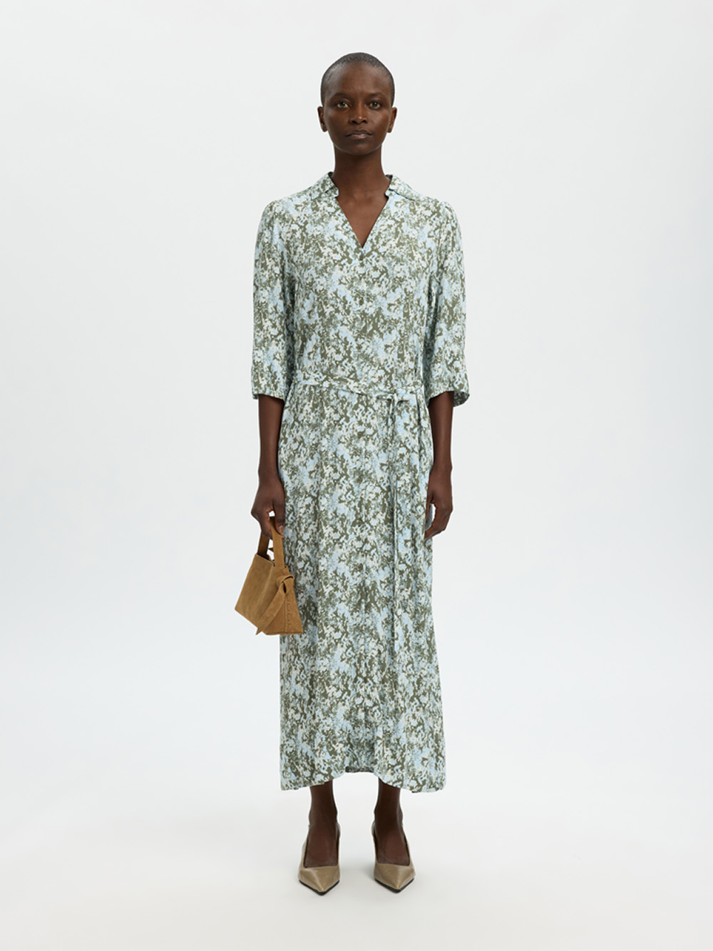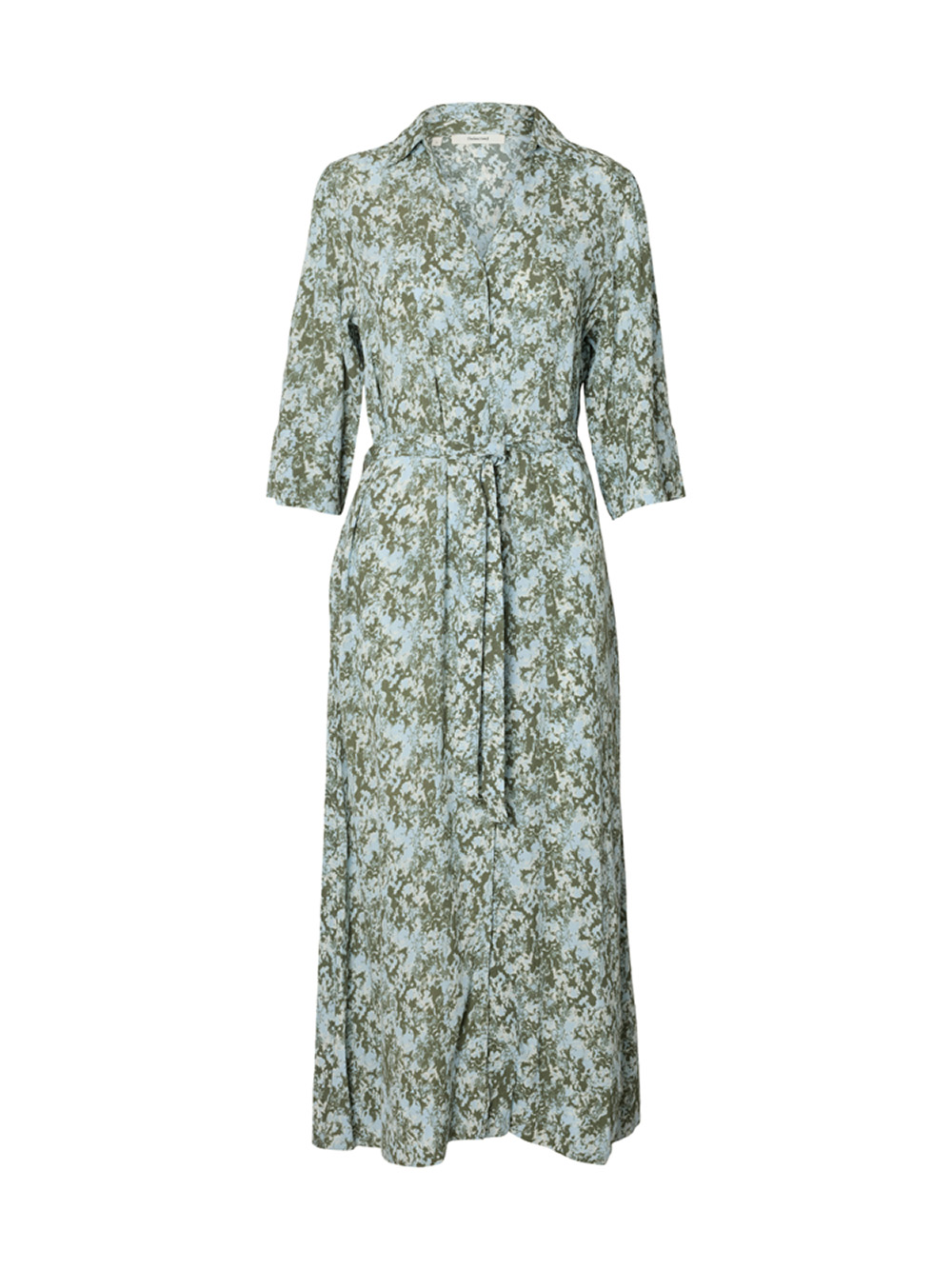 En feminin skjortekjole i myk viskose med lett og behagelig fall. Skjortekrage, V-hals og knepping foran gir et klassisk uttrykk, mens 3/4-ermer og avtagbart knytebelte fremhever en elegant silhuett. Perfekt til både hverdag og sommerlige anledninger.