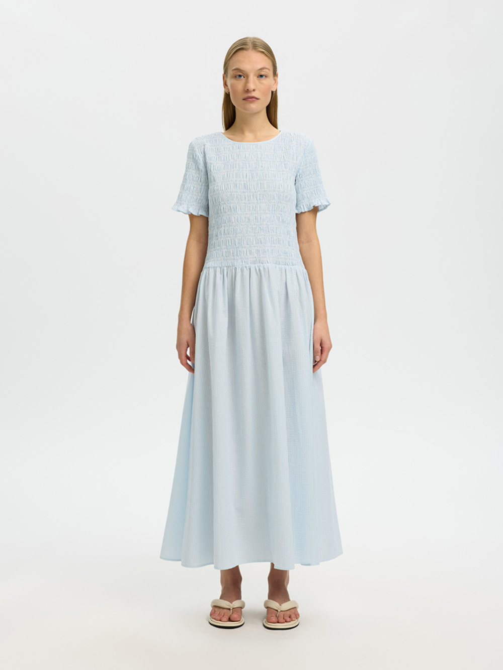 En feminin og lett kjole med et delikat og sommerlig uttrykk. Kjolen har smock i overdelen som gir en flatterende og komfortabel passform, kombinert med en regulær silhuett som faller pent. Rund hals, korte ermer med rysjedetaljer og midi-lengde gjør den til et tidløst valg for både hverdag og mer pyntede anledninger.