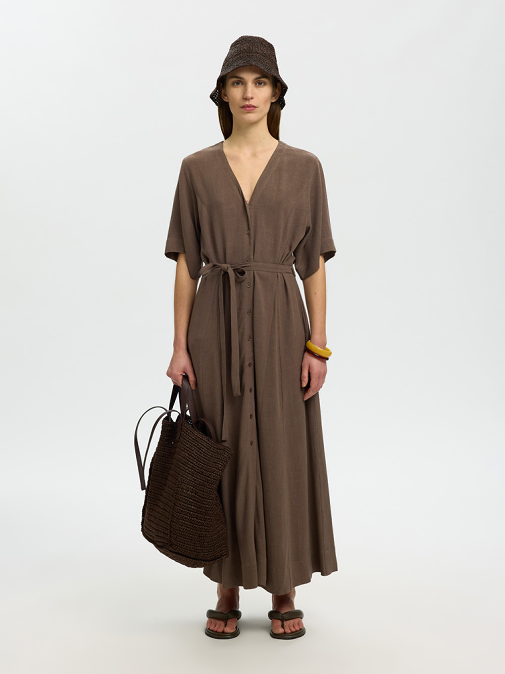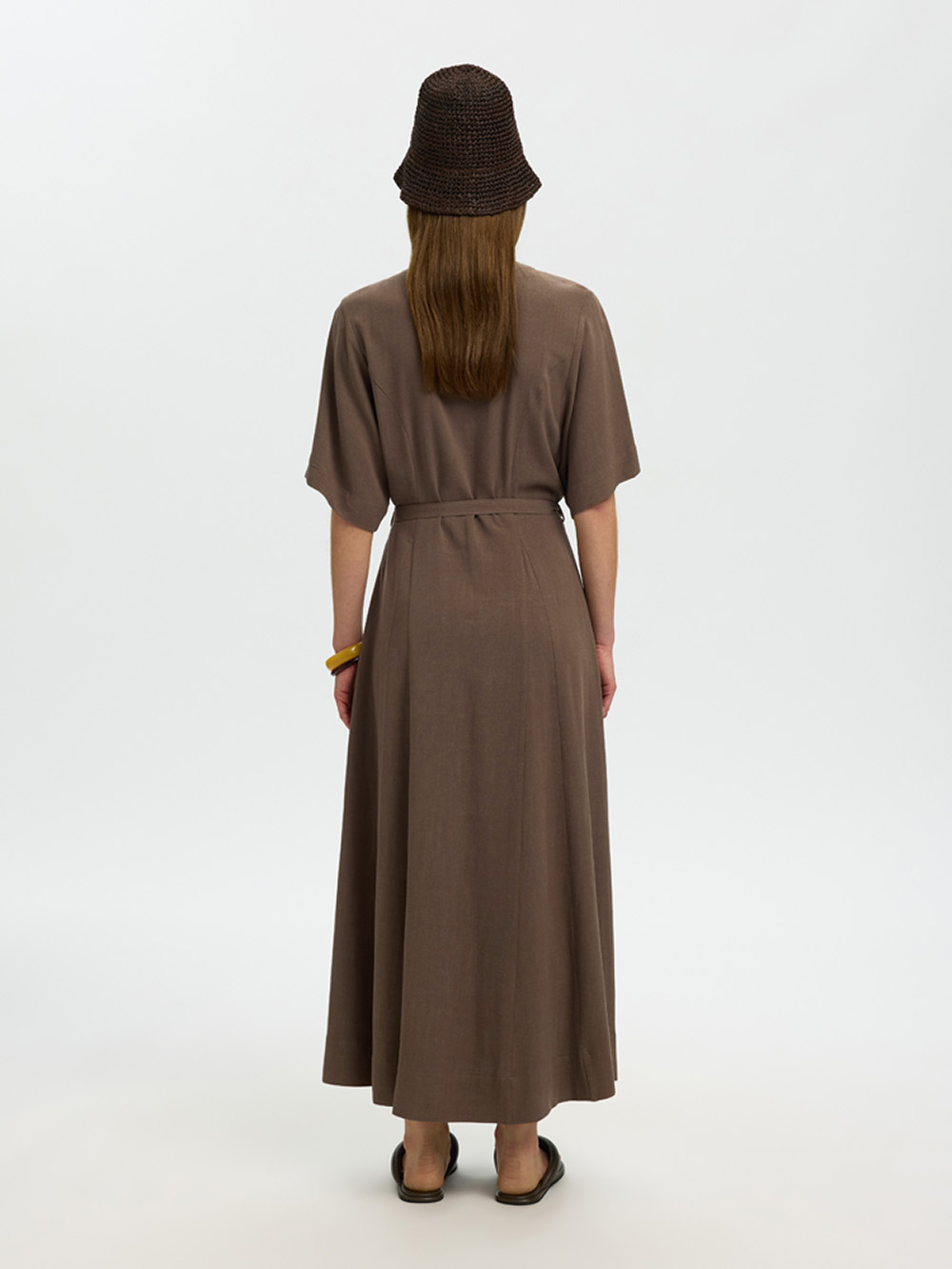 En elegant lang kjole i bærekraftig viskose-linblanding. V-hals, knappelukking og knytebelte i midjen skaper et elegant og feminint uttrykk. 2/4 lange ermer og regulær passform gjør den til et allsidig valg for både jobb og fritid.