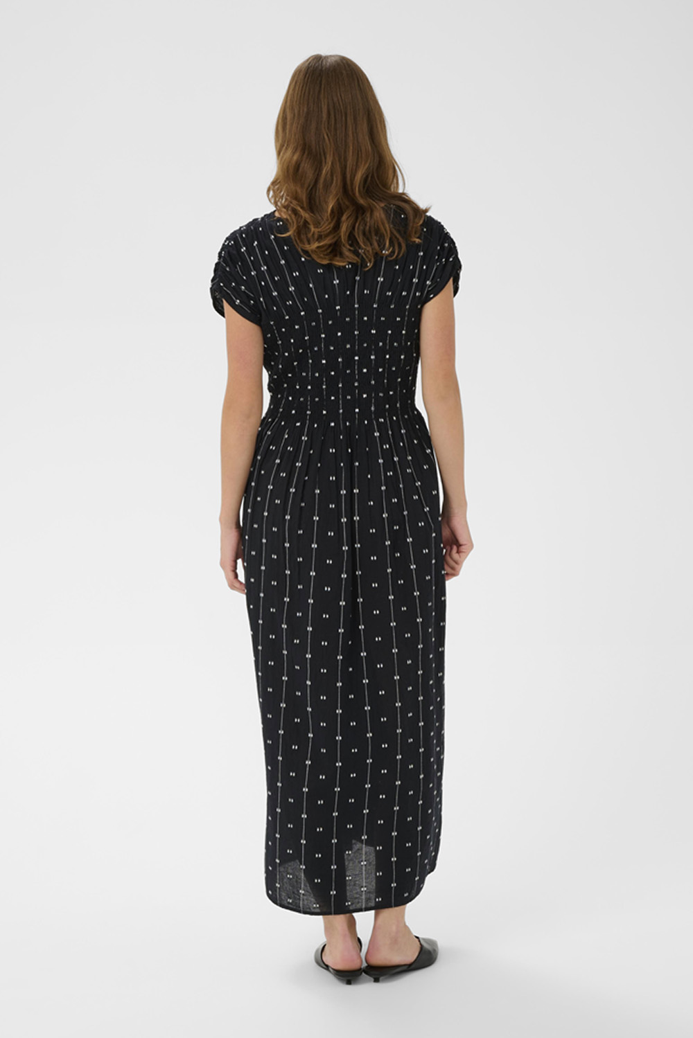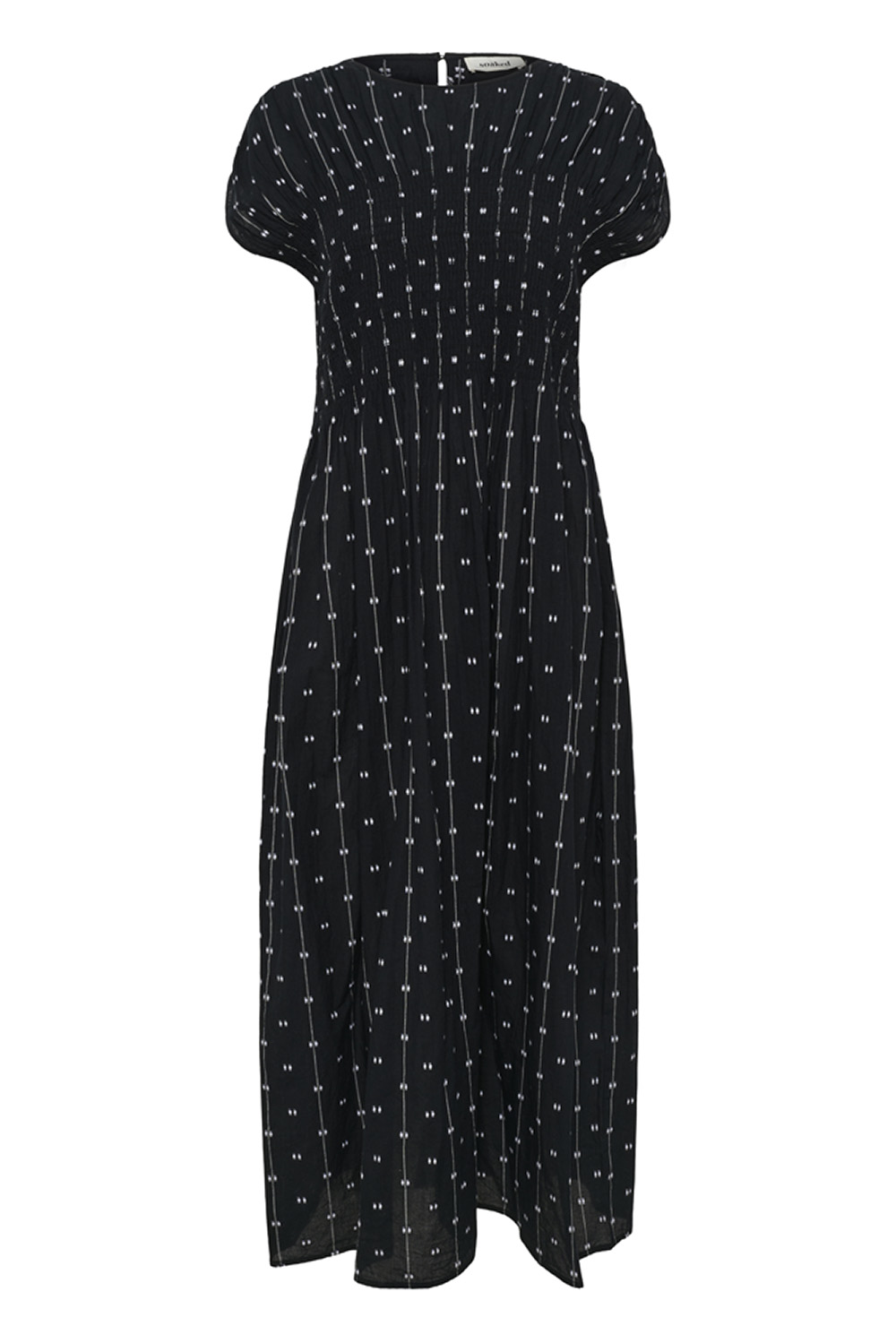 Maxikjole med rett, avslappet passform og korte ermer med rynk. Rund hals og smockdetaljer i overdelen gir en feminin struktur, mens prikkede linjer tilfører et elegant uttrykk.