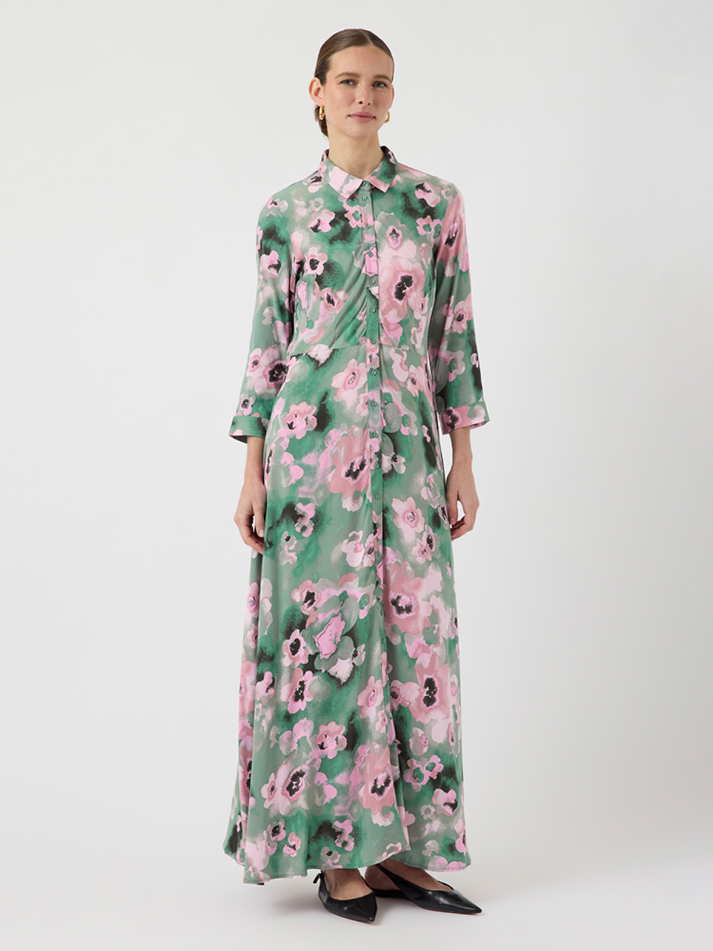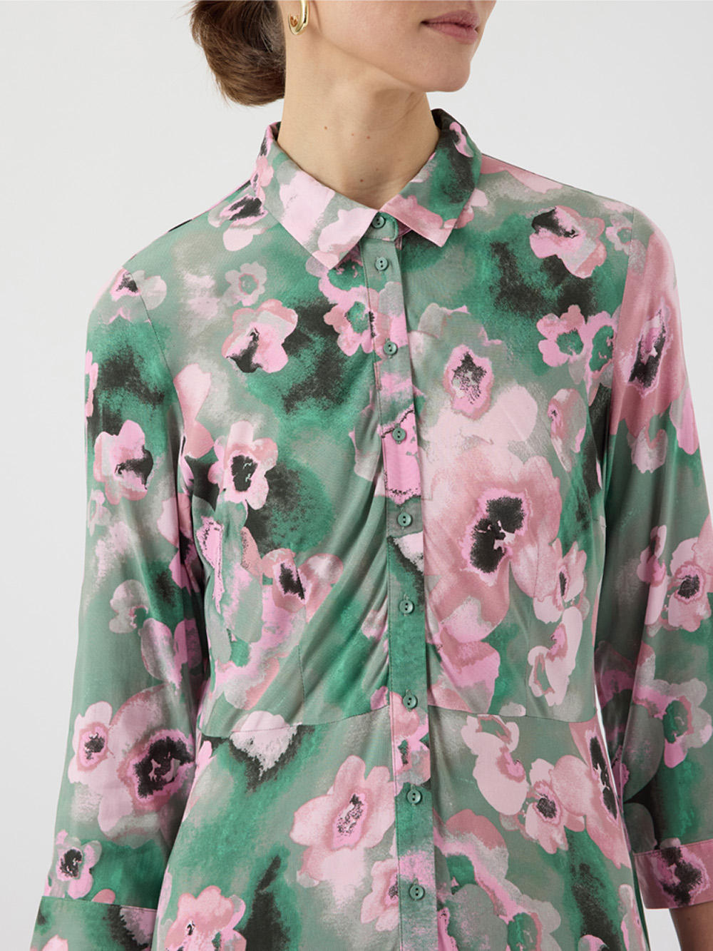 En tidløs skjortekjole i lett, pustende viskose med myk drapering. Knappelukking hele veien foran, 7/8-ermer og midjesnitt gir klassisk stil med flatterende silhuett. Perfekt som elegant hverdagsfavoritt eller til helgens anledninger.