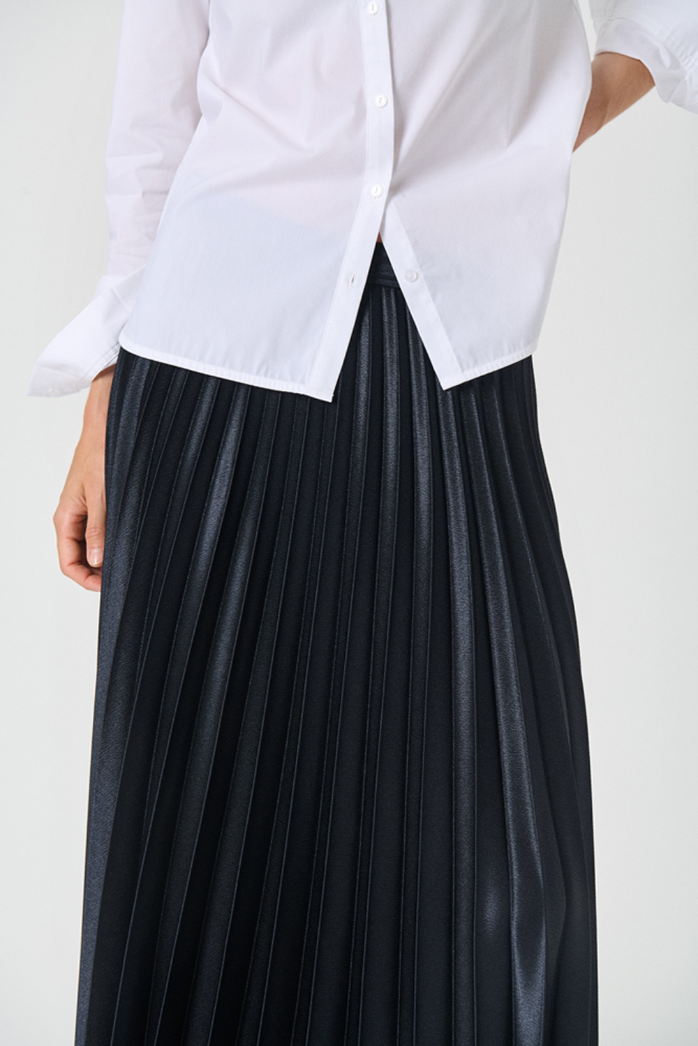 Violetta Pw Skirt fra Part Two. Plissert midi-skjørt med elastisk linning og lett glans. A-formen gir en feminin silhuett som er både komfortabel og tidløs, perfekt til både hverdag og fest.
