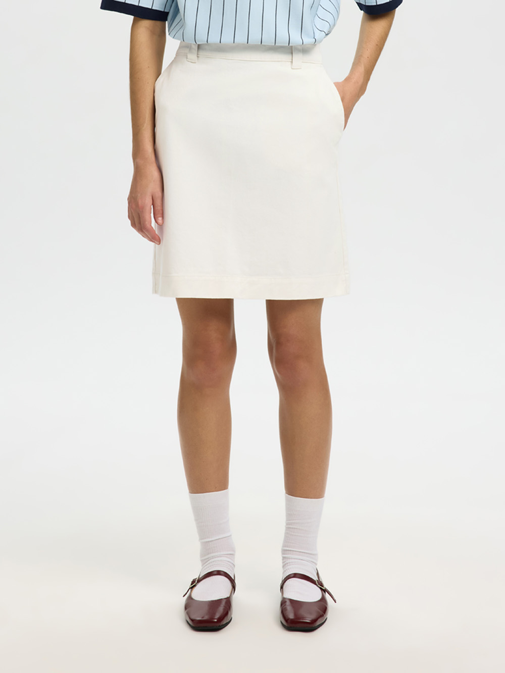 Skjørt fra SELECTED FEMME med medium høyt liv, beltehemper og sidelommer. Glidelåslukking bak og splittdetalj gir et rent, feminint uttrykk med god bevegelse.