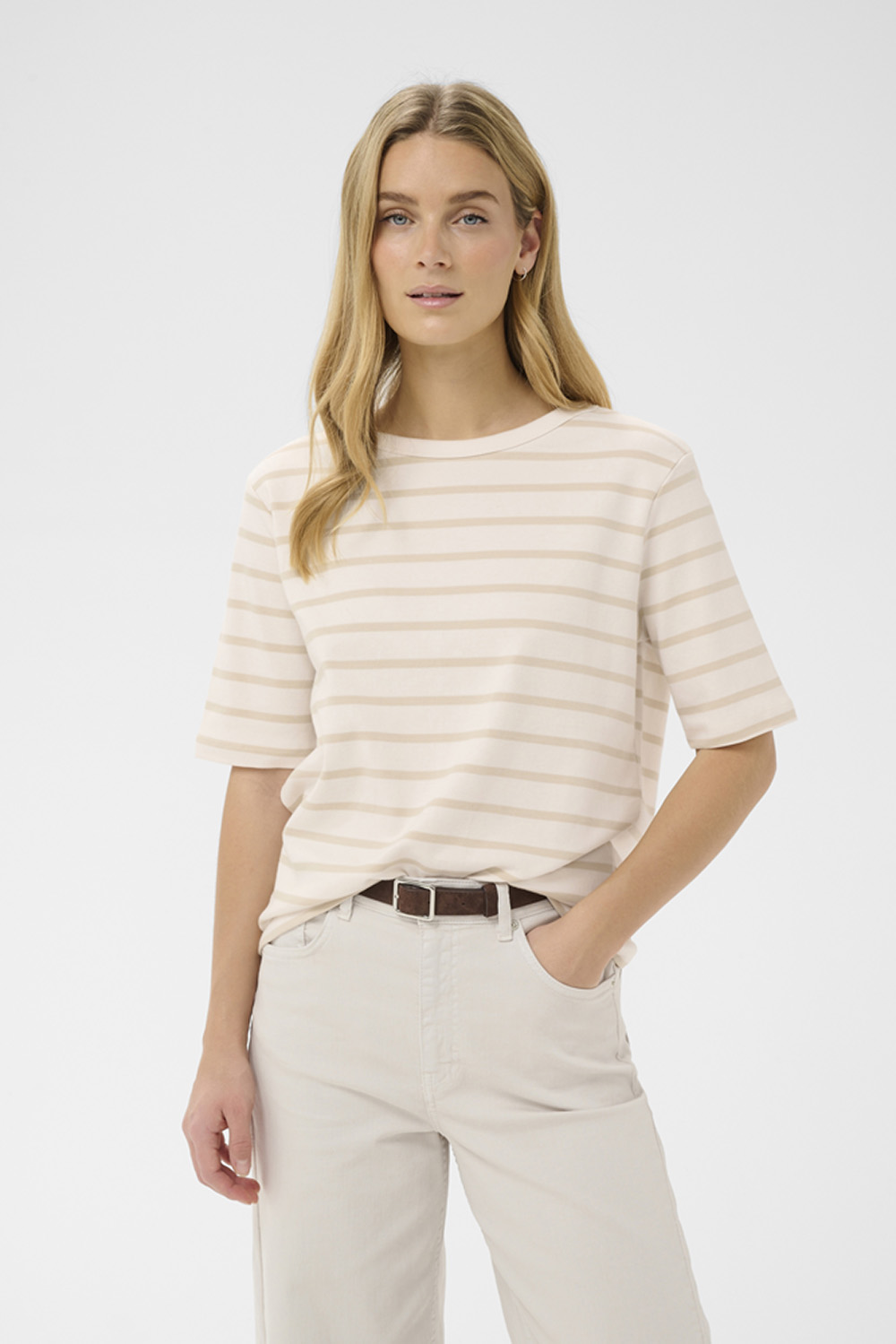 Klassisk T-skjorte med rett passform, korte ermer og rund hals. Allsidig design som enkelt kan styles til både hverdagsbruk og lag-på-lag-antrekk.