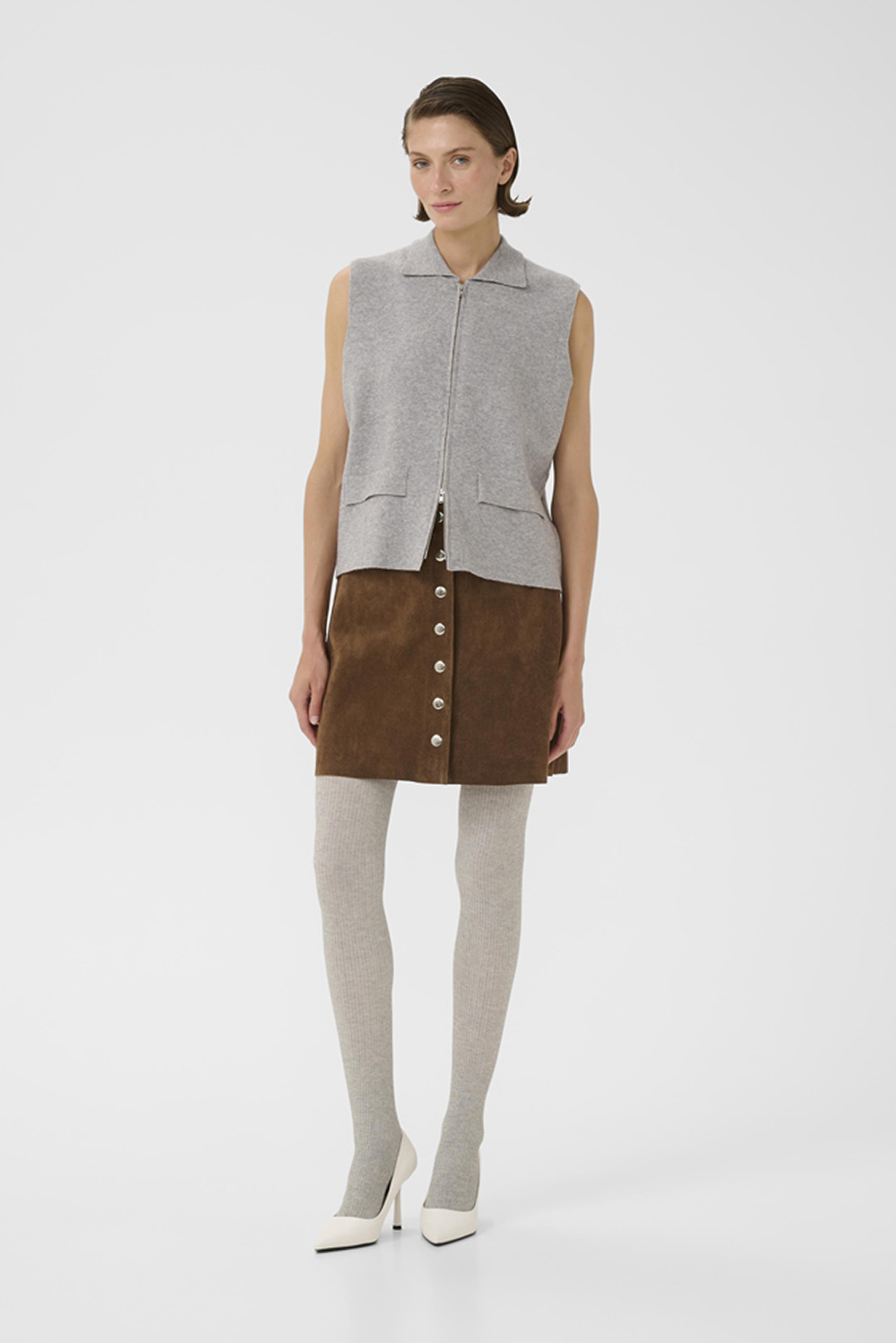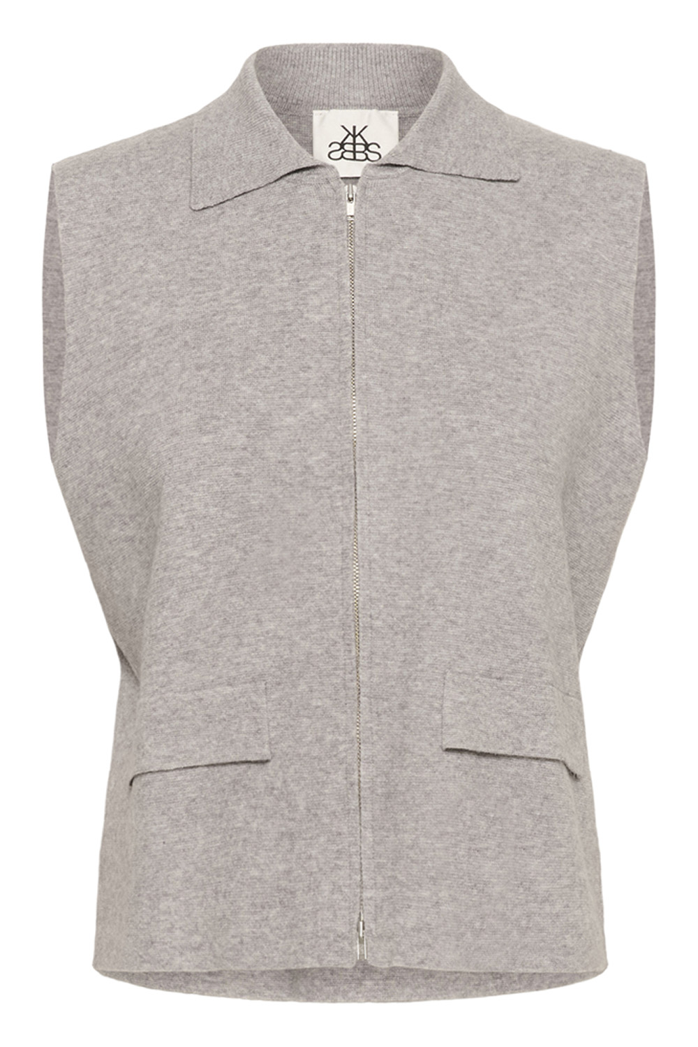 En tidløs vest med spiss krage og praktiske frontlommer. Normal passform og glidelås gjør den perfekt for lag-på-lag, enten til hverdag eller på kontoret. Stilren komfort som passer enhver garderobe.