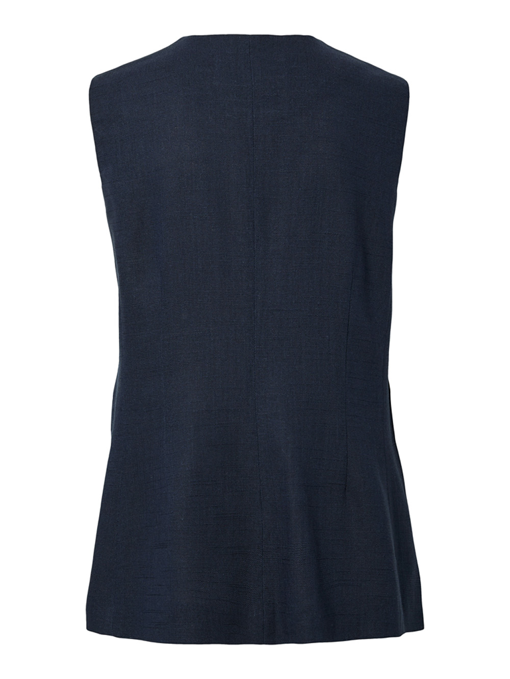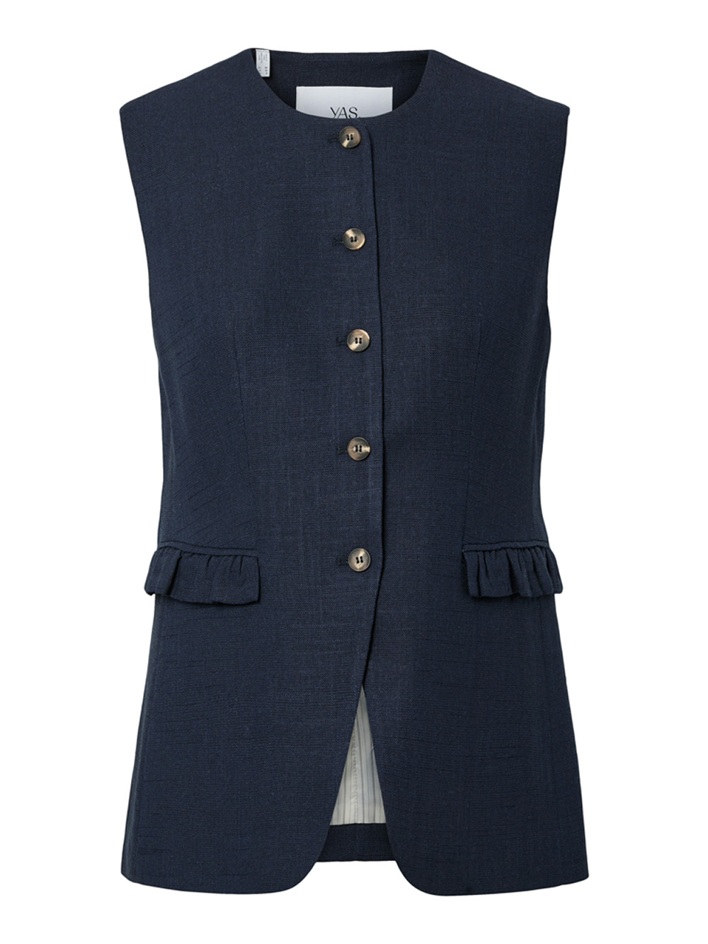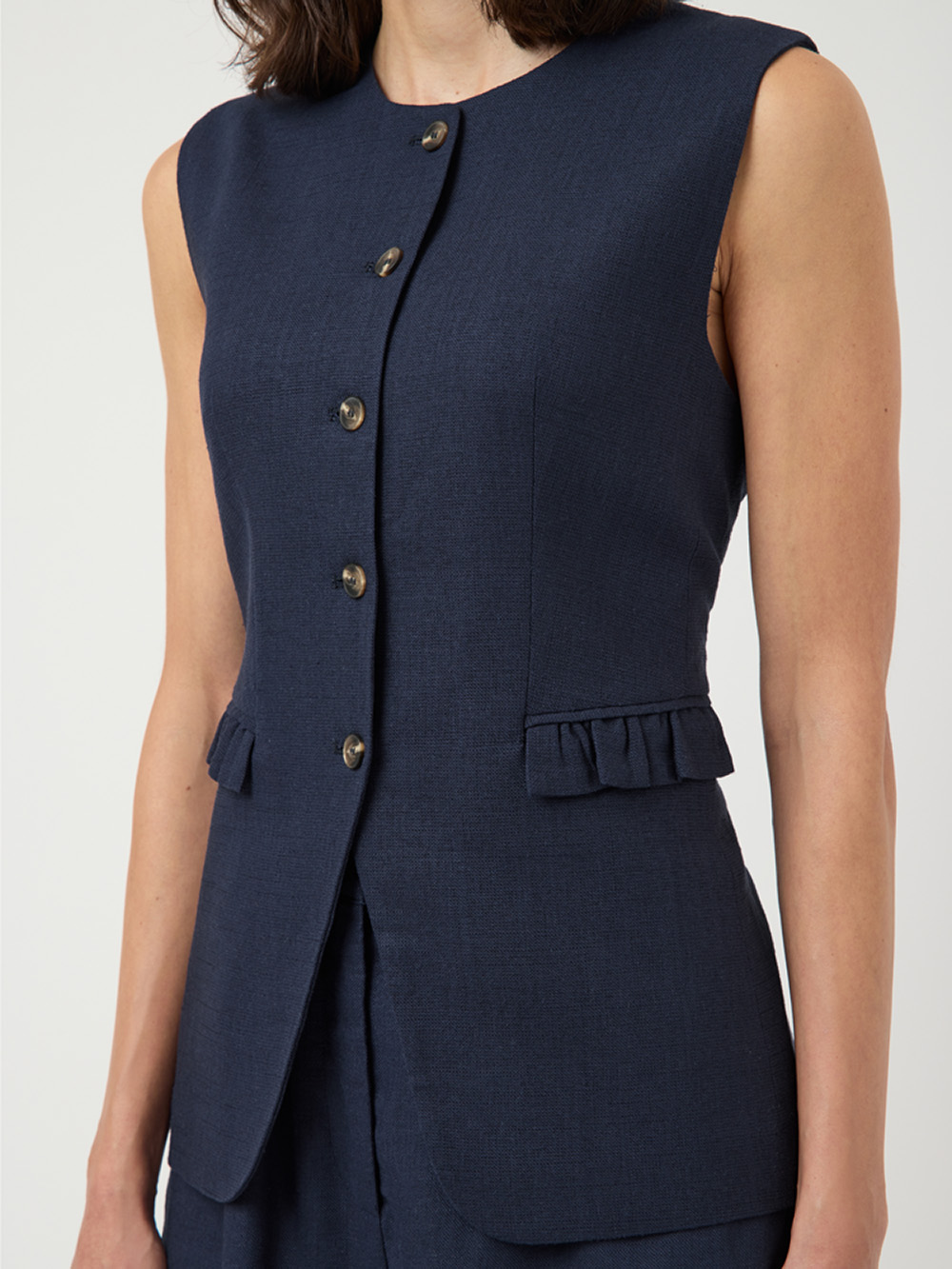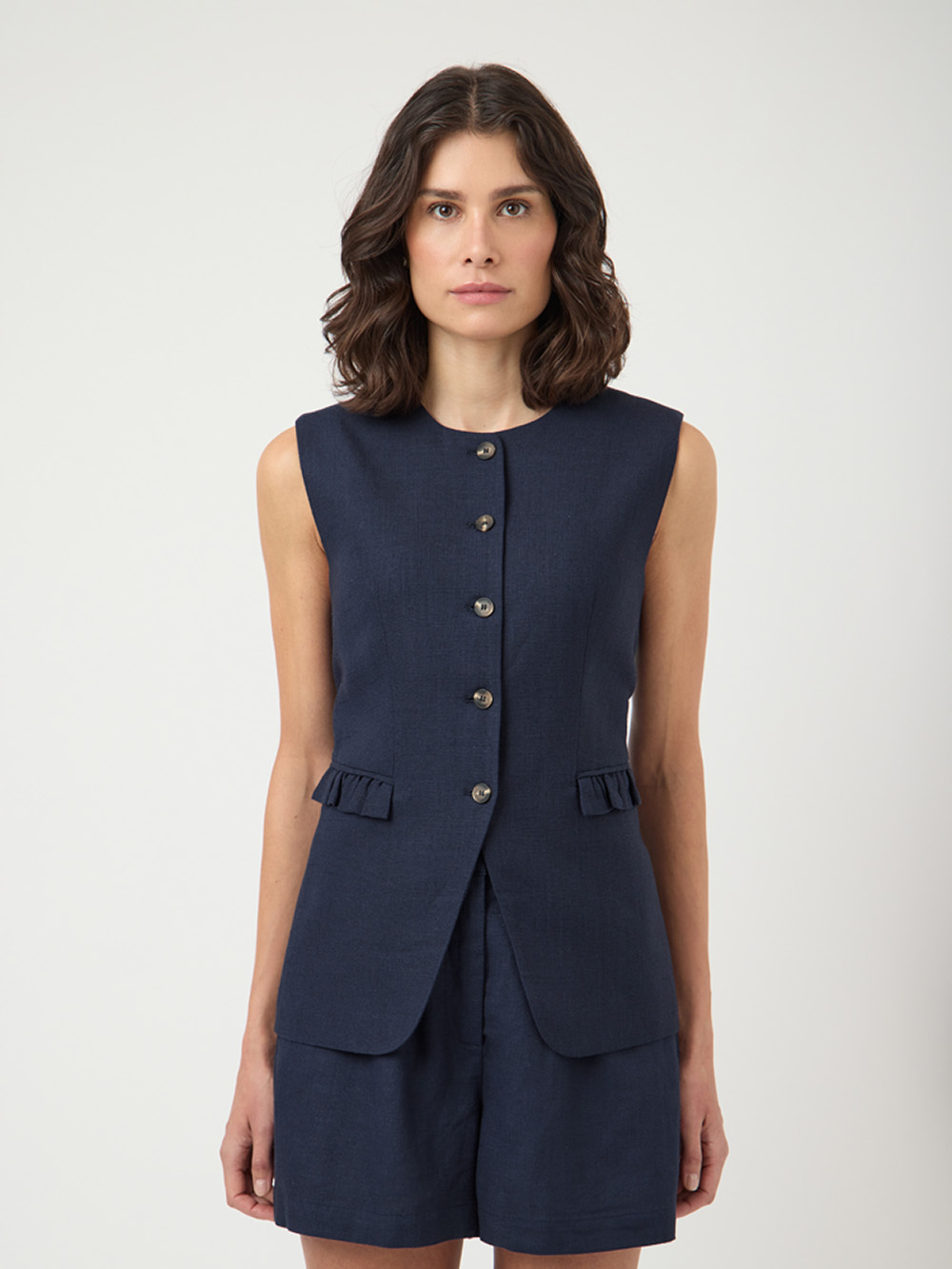 Elegant vest i en lett linblanding som gir et sofistikert, men avslappet uttrykk. Modellen har en klassisk, rett passform med rund hals og knappelukking i front. Diskré innsving og fine volangdetaljer ved lommene gir en feminin finish. Perfekt alene eller stylet over en skjorte for et gjennomført antrekk.