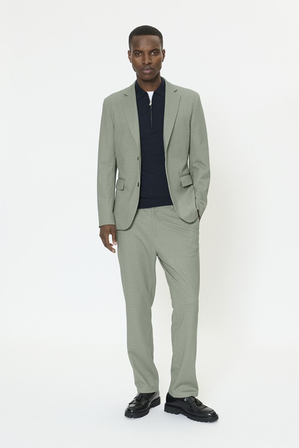 Enkelspent blazer i rett passform med klassisk jakkeslag og to knapper. Lange ermer og rene linjer gir et tidløst uttrykk, perfekt til både jobb og mer formelle anledninger.