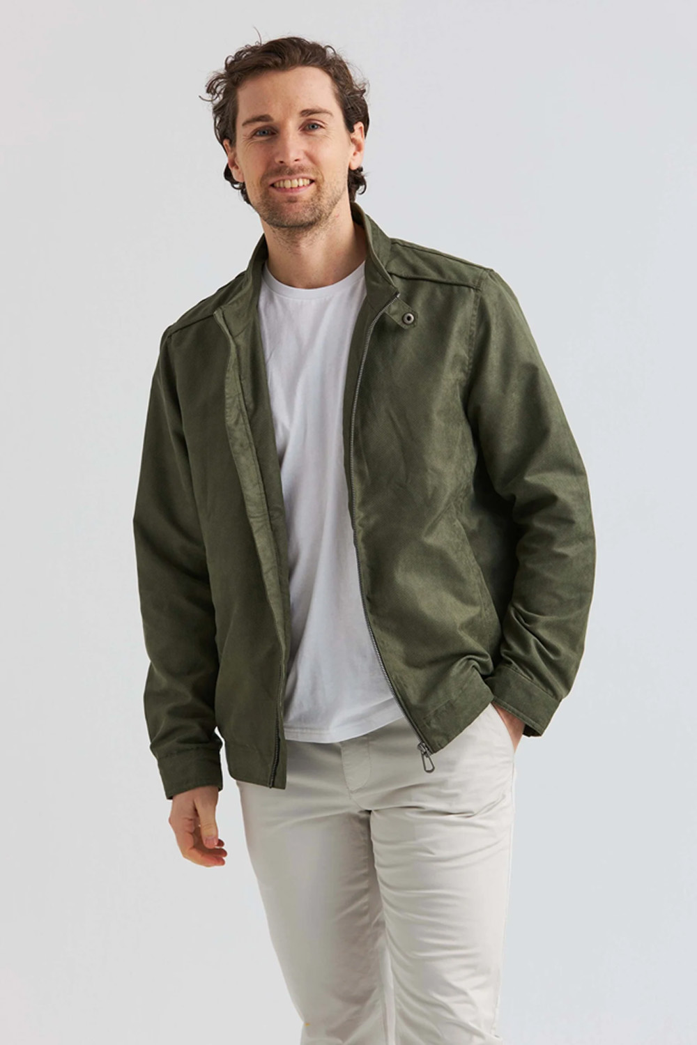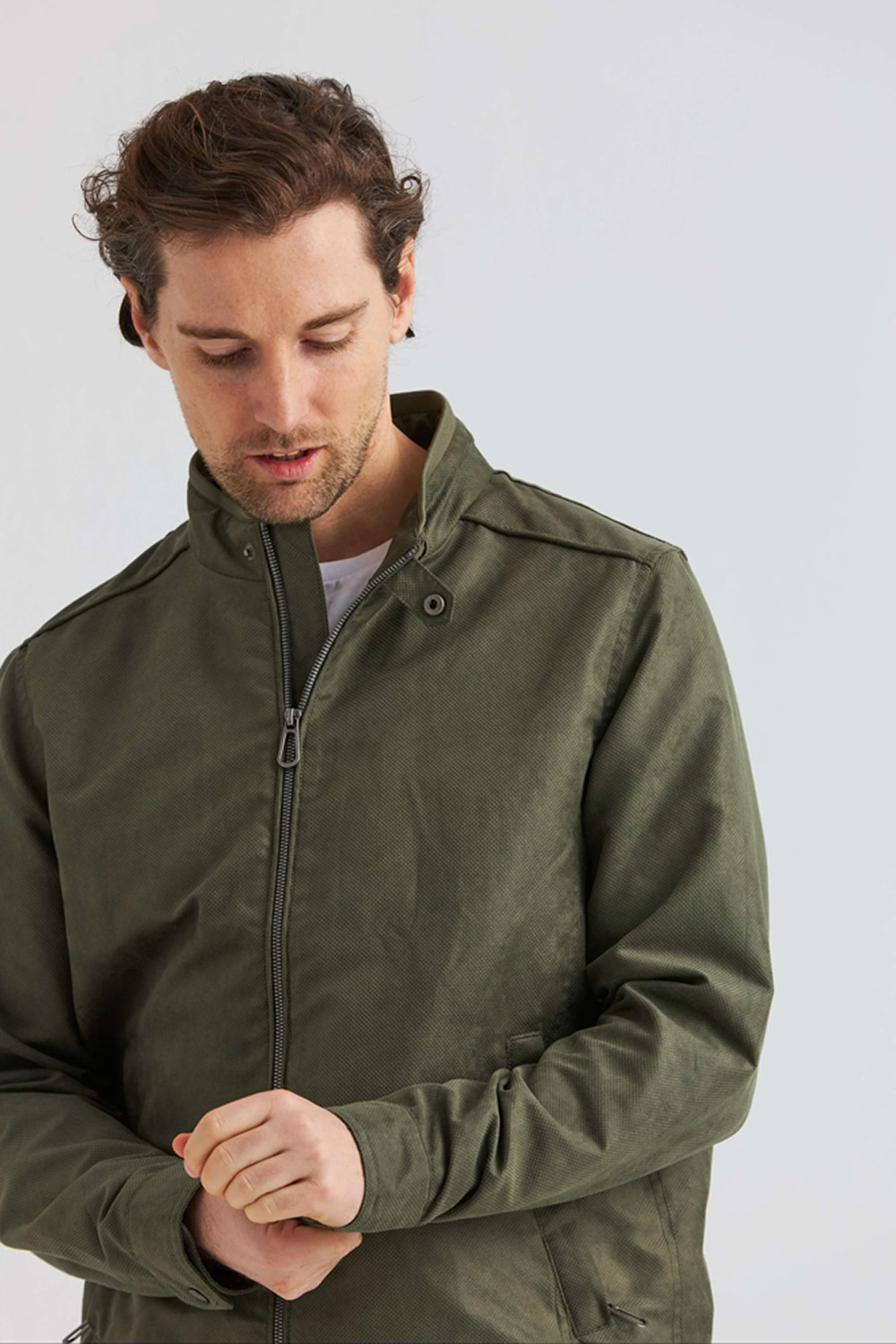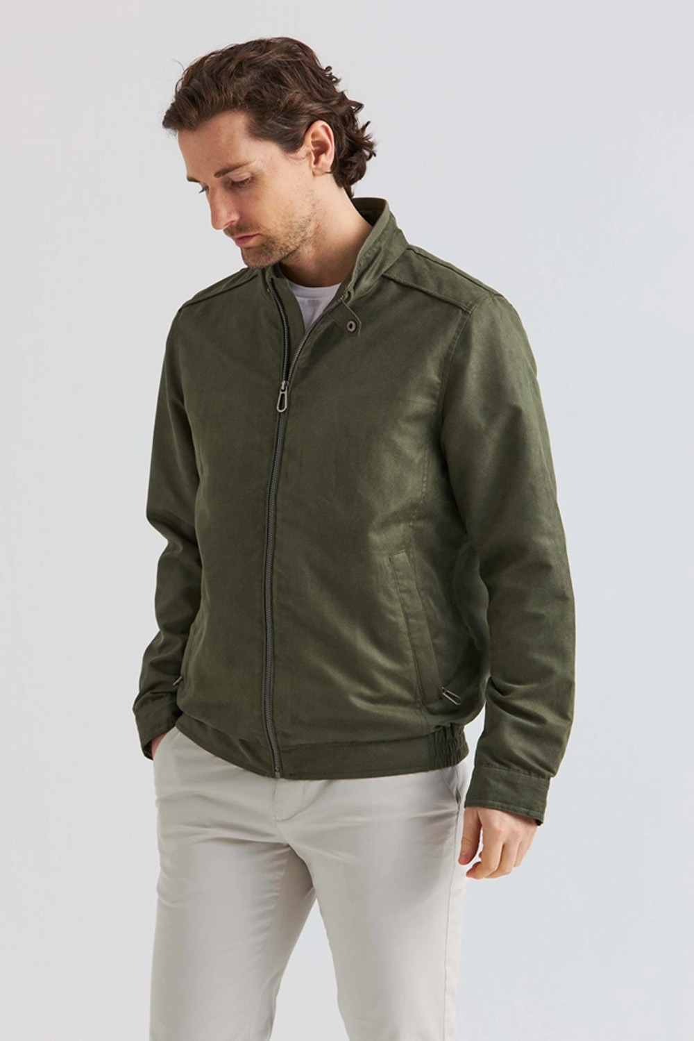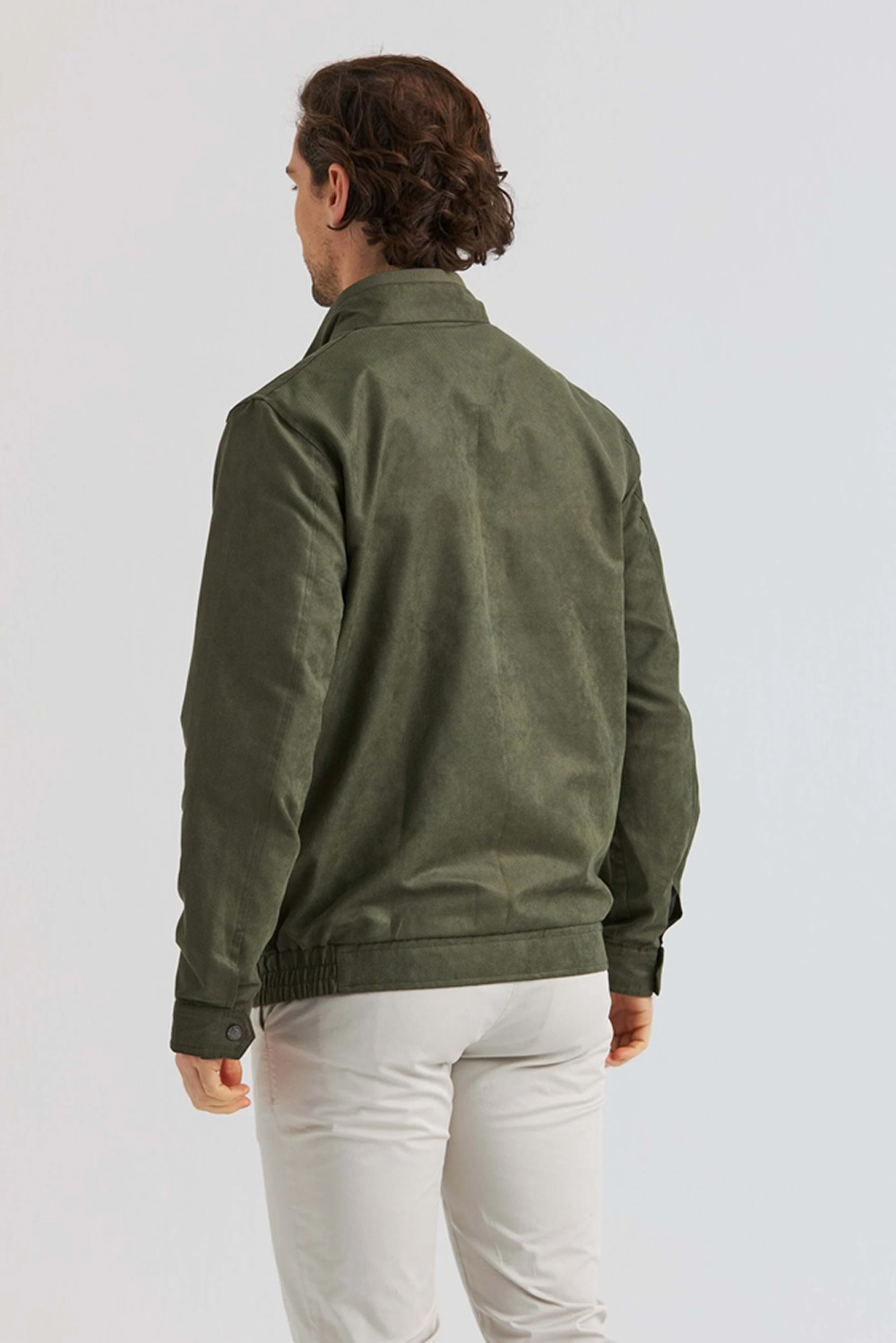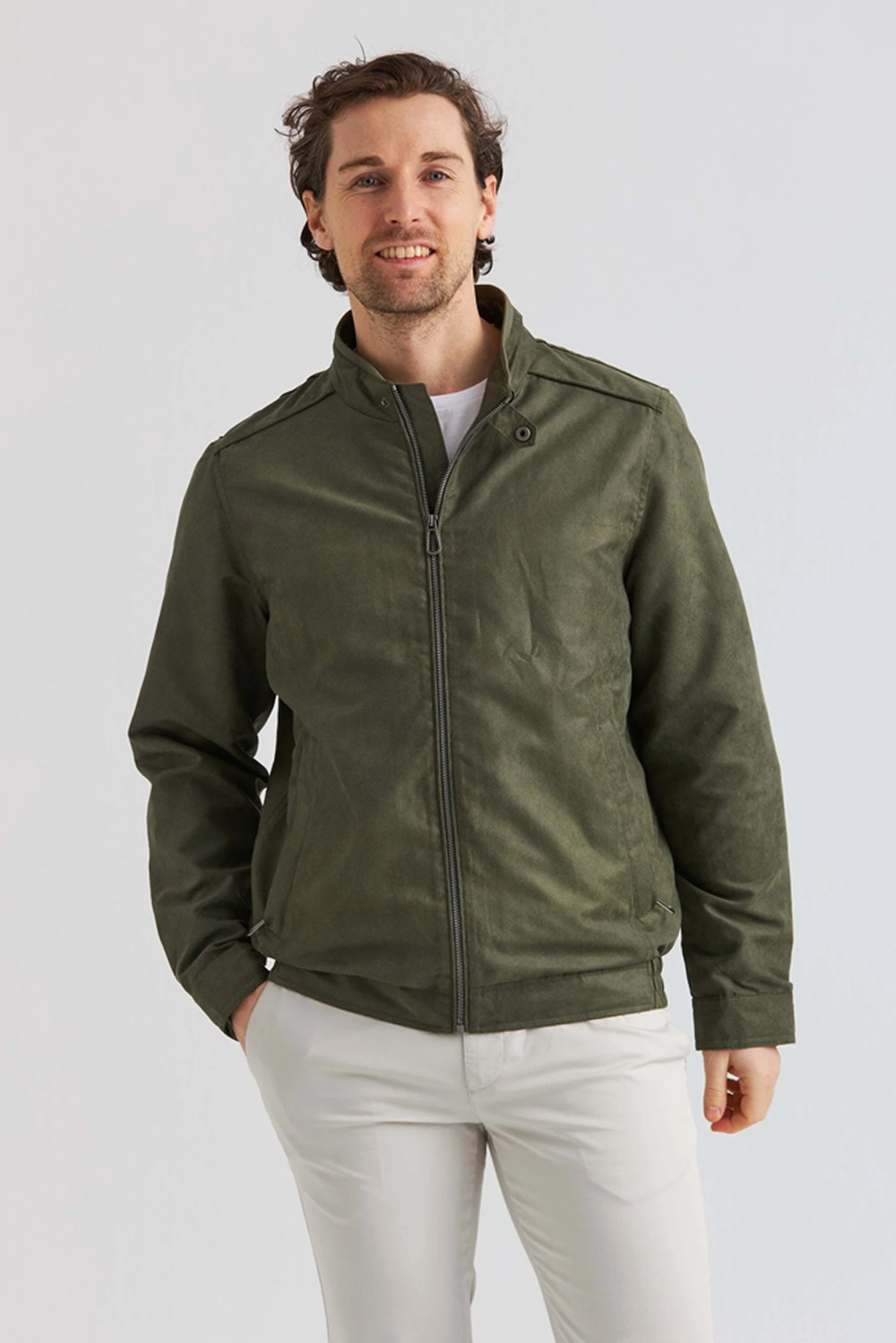 Soft Suede-jakke med stilrene detaljer. Frontglidelås, ståkrage med knapp og elastisk nederkant sikrer komfort og funksjon. En allsidig favoritt som passer til både casual og mer polerte looks.