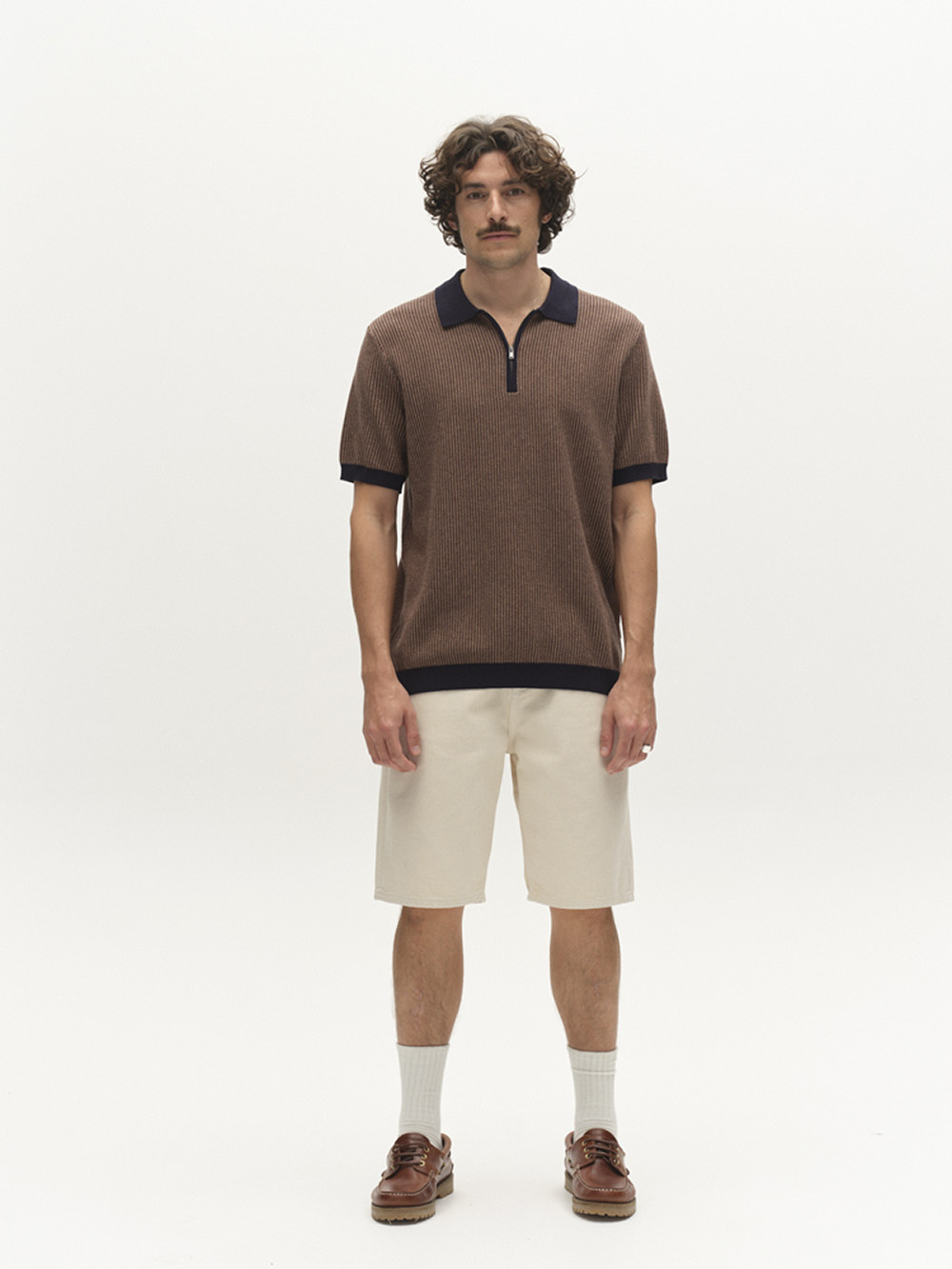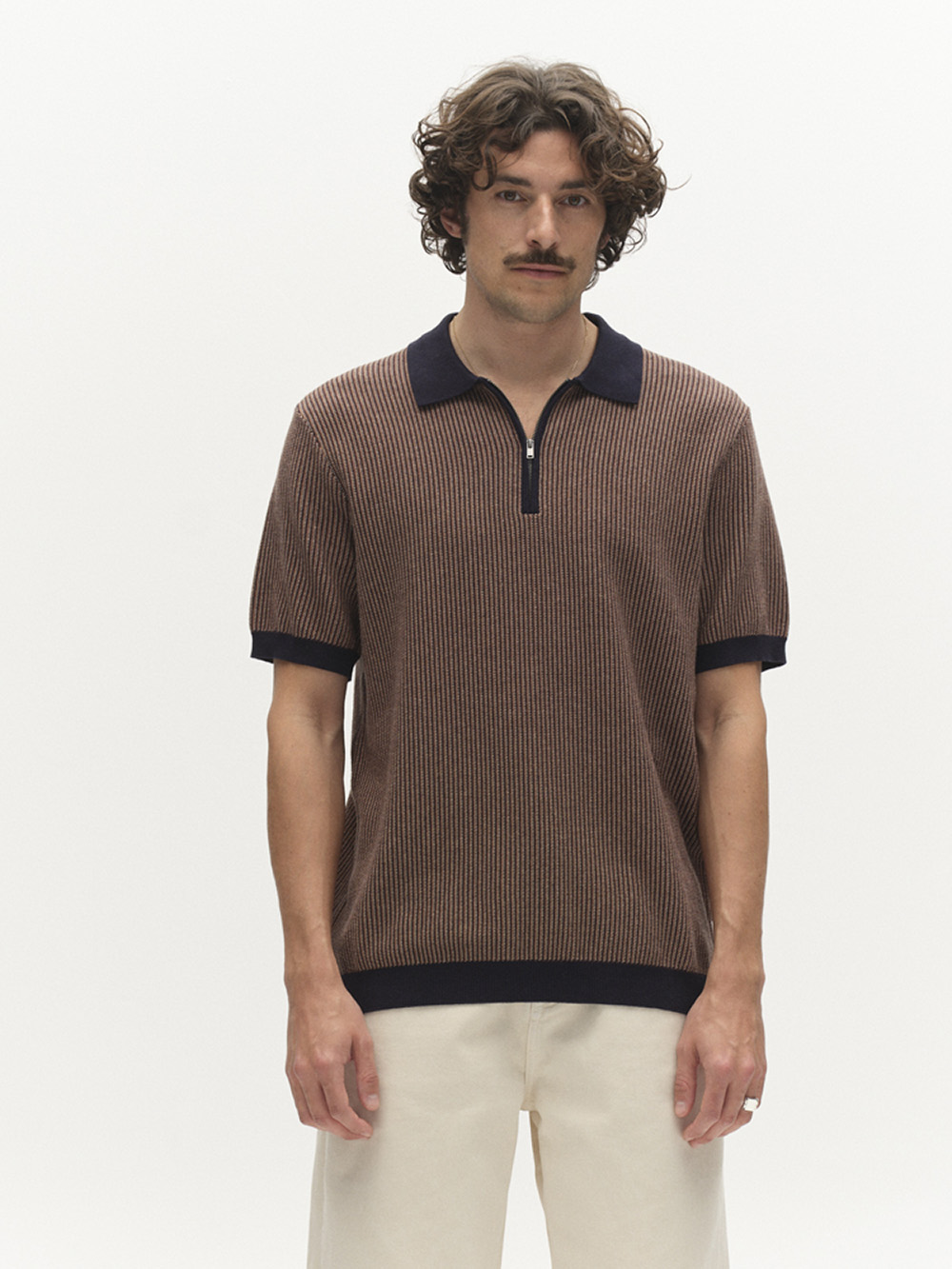 Retroinspirert strikkepolo fra GABBA i 3D-ribbestrikket bomull med strukturert overflate. Klassisk polokrage med glidelåsåpning gir et moderne uttrykk, mens ribbestrikkede avslutninger på ermer og kant fullfører den avslappede silhuetten.