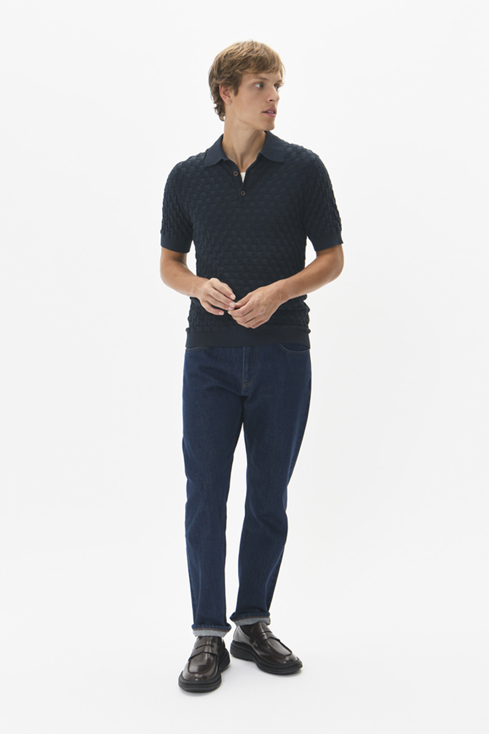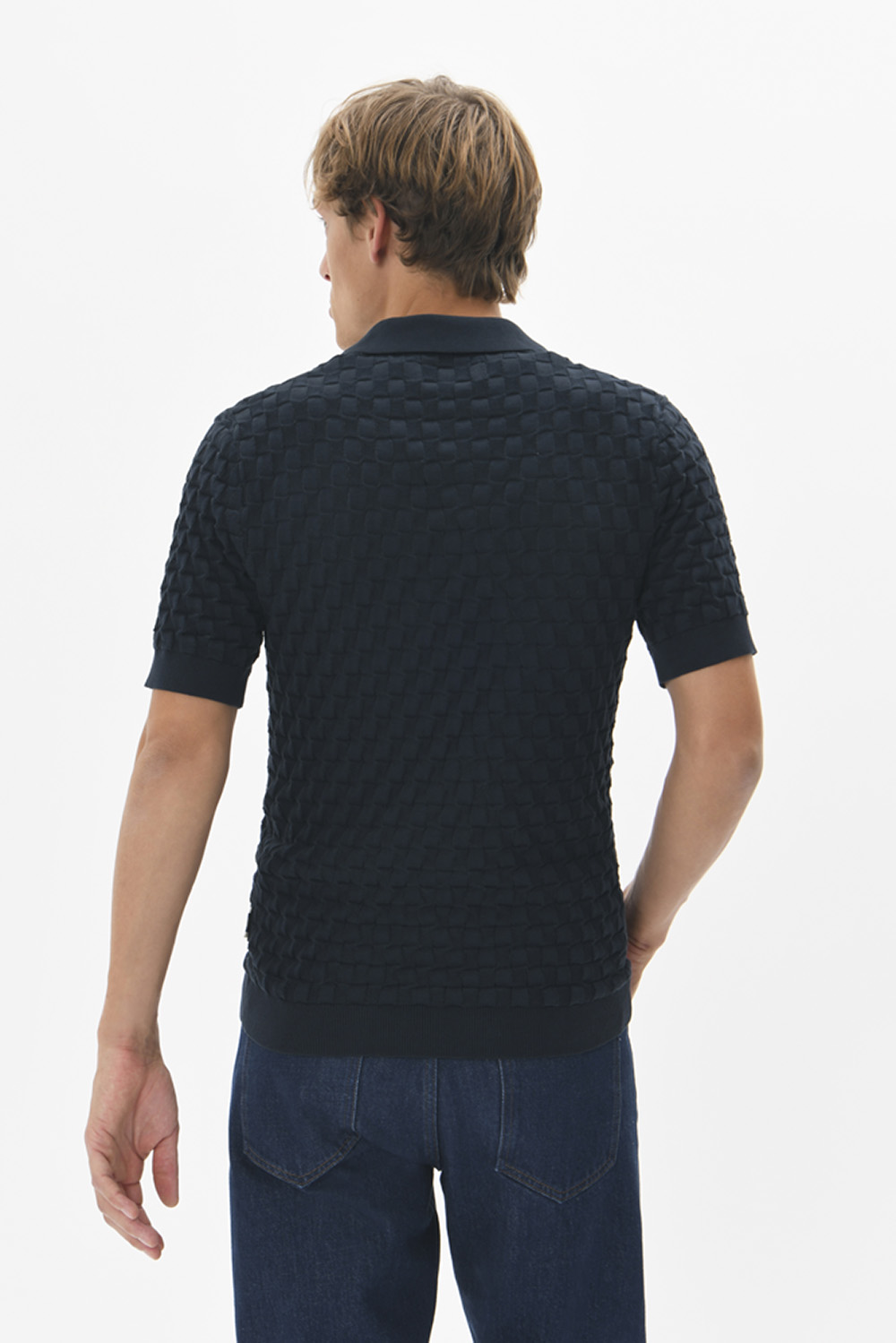 Kortermet pique med stilig strikket rutemønster og klassisk krage. Brune kontrastknapper gir et klassisk og elegant preg, og den rette passformen gjør den lett å style til både hverdags og mer pyntede anledninger.