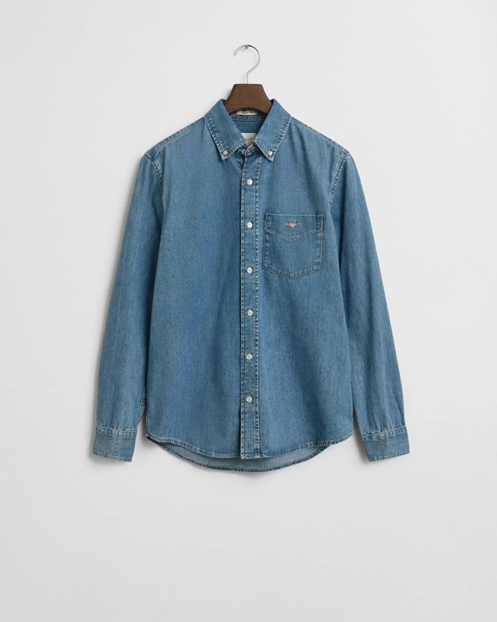 Reg Denim Shirt fra GANT er en tidløs denimskjorte i regulær passform. Myk bomull, gjennomført kvalitet og et naturlig slitt uttrykk gjør den til en garderobefavoritt. Et plagg du alltid kan stole på- år etter år!